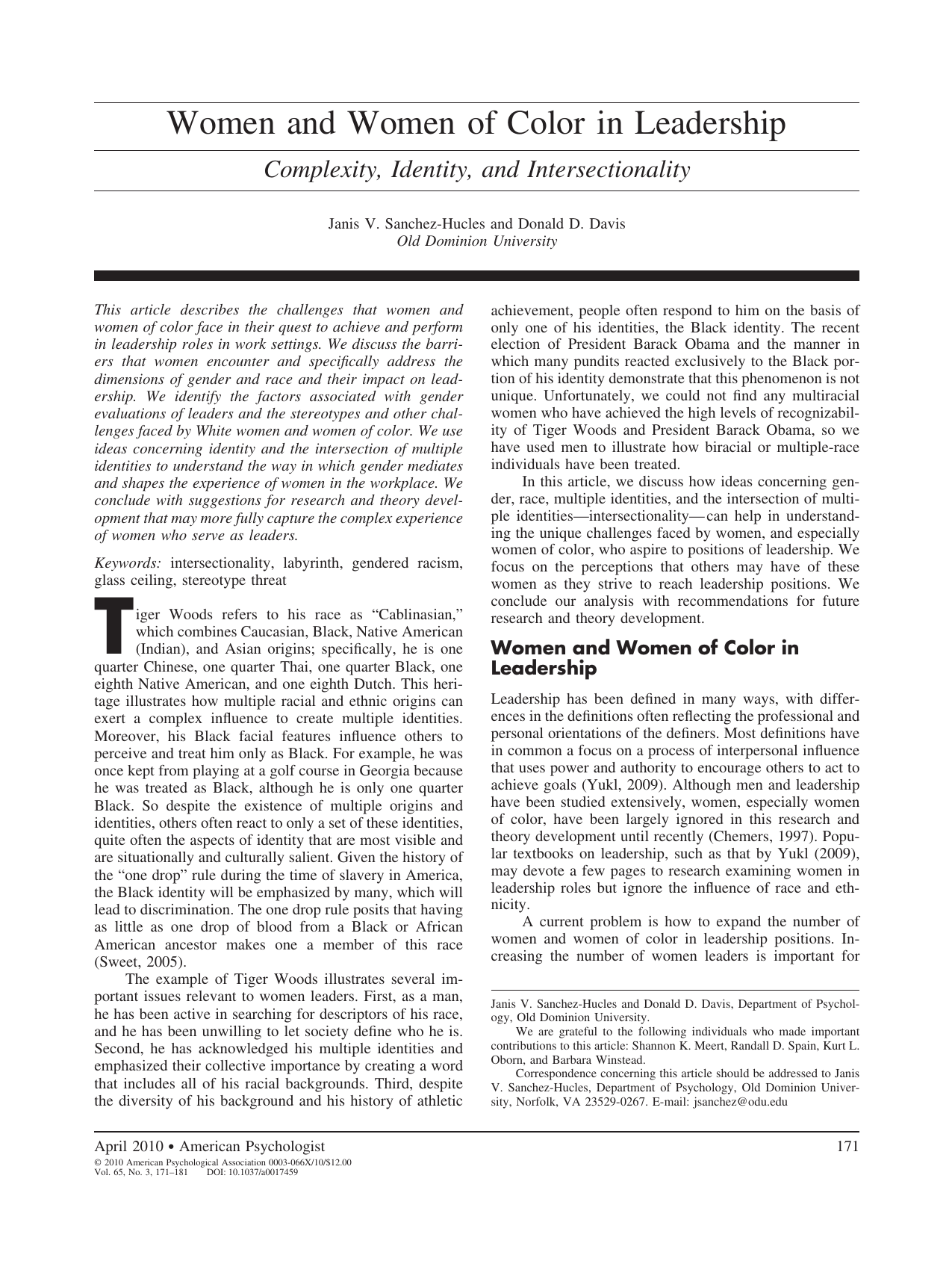 Women and Women of Color in Leadership Complexity, Identity, and Intersectionality Janis V. Sanchez-Hucles and Donald D. Davis Old Dominion University This article describes the challenges that women and women of color face in their quest to achieve and perform in leadership roles in work settings. We discuss the barriers that women encounter and specifically address the dimensions of gender and race and their impact on leadership. We identify the factors associated with gender evaluations of leaders and the stereotypes and other challenges faced by White women and women of color. We use ideas concerning identity and the intersection of multiple identities to understand the way in which gender mediates and shapes the experience of women in the workplace. We conclude with suggestions for research and theory development that may more fully capture the complex experience of women who serve as leaders. Keywords: intersectionality, labyrinth, gendered racism, glass ceiling, stereotype threat T iger Woods refers to his race as “Cablinasian,” which combines Caucasian, Black, Native American (Indian), and Asian origins; specifically, he is one quarter Chinese, one quarter Thai, one quarter Black, one eighth Native American, and one eighth Dutch. This heritage illustrates how multiple racial and ethnic origins can exert a complex influence to create multiple identities. Moreover, his Black facial features influence others to perceive and treat him only as Black. For example, he was once kept from playing at a golf course in Georgia because he was treated as Black, although he is only one quarter Black. So despite the existence of multiple origins and identities, others often react to only a set of these identities, quite often the aspects of identity that are most visible and are situationally and culturally salient. Given the history of the “one drop” rule during the time of slavery in America, the Black identity will be emphasized by many, which will lead to discrimination. The one drop rule posits that having as little as one drop of blood from a Black or African American ancestor makes one a member of this race (Sweet, 2005). The example of Tiger Woods illustrates several important issues relevant to women leaders. First, as a man, he has been active in searching for descriptors of his race, and he has been unwilling to let society define who he is. Second, he has acknowledged his multiple identities and emphasized their collective importance by creating a word that includes all of his racial backgrounds. Third, despite the diversity of his background and his history of athletic April 2010 ● American Psychologist © 2010 American Psychological Association 0003-066X/10/$12.00 Vol. 65, No. 3, 171–181 DOI: 10.1037/a0017459 achievement, people often respond to him on the basis of only one of his identities, the Black identity. The recent election of President Barack Obama and the manner in which many pundits reacted exclusively to the Black portion of his identity demonstrate that this phenomenon is not unique. Unfortunately, we could not find any multiracial women who have achieved the high levels of recognizability of Tiger Woods and President Barack Obama, so we have used men to illustrate how biracial or multiple-race individuals have been treated. In this article, we discuss how ideas concerning gender, race, multiple identities, and the intersection of multiple identities—intersectionality— can help in understanding the unique challenges faced by women, and especially women of color, who aspire to positions of leadership. We focus on the perceptions that others may have of these women as they strive to reach leadership positions. We conclude our analysis with recommendations for future research and theory development. Women and Women of Color in Leadership Leadership has been defined in many ways, with differences in the definitions often reflecting the professional and personal orientations of the definers. Most definitions have in common a focus on a process of interpersonal influence that uses power and authority to encourage others to act to achieve goals (Yukl, 2009). Although men and leadership have been studied extensively, women, especially women of color, have been largely ignored in this research and theory development until recently (Chemers, 1997). Popular textbooks on leadership, such as that by Yukl (2009), may devote a few pages to research examining women in leadership roles but ignore the influence of race and ethnicity. A current problem is how to expand the number of women and women of color in leadership positions. Increasing the number of women leaders is important for Janis V. Sanchez-Hucles and Donald D. Davis, Department of Psychology, Old Dominion University. We are grateful to the following individuals who made important contributions to this article: Shannon K. Meert, Randall D. Spain, Kurt L. Oborn, and Barbara Winstead. Correspondence concerning this article should be addressed to Janis V. Sanchez-Hucles, Department of Psychology, Old Dominion University, Norfolk, VA 23529-0267. E-mail: [email protected] 171 Janis V. SanchezHucles Photo by Chuck Thomas reasons beyond political correctness. At this time, the United States is not producing enough leaders to meet organizational demands, a shortage that is likely to become more acute with the upcoming retirement of the baby boomers (Harris, Moran, & Moran, 2004; Treverton & Bikson, 2003). Women leaders can fill this void. Women comprise 51% of the labor force and provide a significant pool of potential leaders (Catalyst, 2005). Women predominate in lower level managerial ranks and are only marginally represented at the executive levels. Yet research and anecdotal reports suggest that women are highly suited for more advanced leadership positions (Catalyst, 2005; Richardson & Loubier, 2008). The U.S. Bureau of Labor Statistics (2007) reported the following percentages of women in managerial positions 