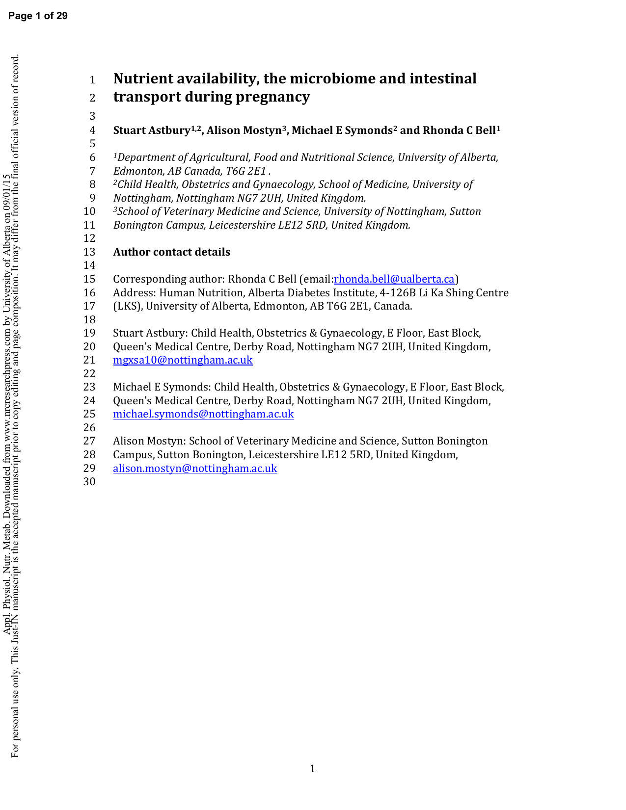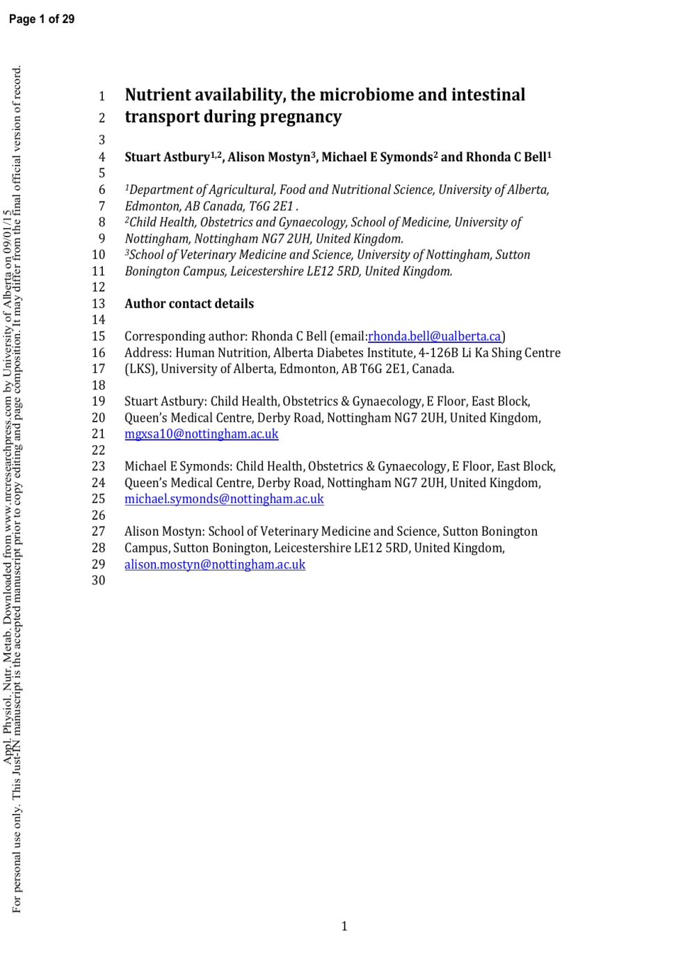 Appl. Physiol. Nutr. Metab. Downloaded from www.nrcresearchpress.com by University of Alberta on 09/01/15 For personal use only. This Just-IN manuscript is the accepted manuscript prior to copy editing and page composition. It may differ from the final official version of record. Page 1 of 29 1 2 3 4 5 6 7 8 9 10 11 12 13 14 15 16 17 18 19 20 21 22 23 24 25 26 27 28 29 30 Nutrient availability, the microbiome and intestinal transport during pregnancy Stuart Astbury1,2, Alison Mostyn3, Michael E Symonds2 and Rhonda C Bell1 1Department of Agricultural, Food and Nutritional Science, University of Alberta, Edmonton, AB Canada, T6G 2E1 . 2Child Health, Obstetrics and Gynaecology, School of Medicine, University of Nottingham, Nottingham NG7 2UH, United Kingdom. 3School of Veterinary Medicine and Science, University of Nottingham, Sutton Bonington Campus, Leicestershire LE12 5RD, United Kingdom. Author contact details Corresponding author: Rhonda C Bell (email:[email protected]) Address: Human Nutrition, Alberta Diabetes Institute, 4-126B Li Ka Shing Centre (LKS), University of Alberta, Edmonton, AB T6G 2E1, Canada. Stuart Astbury: Child Health, Obstetrics & Gynaecology, E Floor, East Block, Queen’s Medical Centre, Derby Road, Nottingham NG7 2UH, United Kingdom, [email protected] Michael E Symonds: Child Health, Obstetrics & Gynaecology, E Floor, East Block, Queen’s Medical Centre, Derby Road, Nottingham NG7 2UH, United Kingdom, [email protected] Alison Mostyn: School of Veterinary Medicine and Science, Sutton Bonington Campus, Sutton Bonington, Leicestershire LE12 5RD, United Kingdom, [email protected] 1 Appl. Physiol. Nutr. Metab. Downloaded from www.nrcresearchpress.com by University of Alberta on 09/01/15 For personal use only. This Just-IN manuscript is the accepted manuscript prior to copy editing and page composition. It may differ from the final official version of record. Page 2 of 29 31 Abstract 32 Adequate adaptation of the gastrointestinal (GI) tract is important during 33 pregnancy to ensure that the increased metabolic demands by the developing 34 fetus are met. These include changes in surface area mediated by villus 35 hypertrophy and enhanced functional capacity of individual nutrient receptors 36 including those transporting glucose, fructose, leucine, and calcium. These 37 processes are regulated either by the enhanced nutrient demand or are 38 facilitated by changes in the secretion of pregnancy hormones. Our review also 39 covers recent research into the microbiome, and how pregnancy could lead to 40 microbial adaptations, which are beneficial to the mother, yet are also similar to 41 those seen in the metabolic syndrome. The potential role of diet in modulating 42 the microbiome during pregnancy, as well as the potential for the intestinal 43 microbiota to induce pregnancy complications are examined. 44 45 Gaps in the current literature are highlighted including those where only 46 historical evidence is available, and we suggest areas that should be a priority for 47 further research. In summary, although a significant degree of adaptation has 48 been described, there are both well-established processes, and more recent 49 discoveries such as changes within the maternal microbiome that pose new 50 questions as to how the GI tract effectively adapts to pregnancy, especially in 51 conjunction with maternal obesity. 52 53 Keywords: gastrointestinal adaptation, nutrition, pregnancy, microbiome, 54 nutrient transport, maternal health. 55 2 Appl. Physiol. Nutr. Metab. Downloaded from www.nrcresearchpress.com by University of Alberta on 09/01/15 For personal use only. This Just-IN manuscript is the accepted manuscript prior to copy editing and page composition. It may differ from the final official version of record. Page 3 of 29 56 Introduction 57 The perinatal period is associated with widespread adaptations in a majority of 58 maternal organ systems in order to ensure that nutrient supply to both the 59 mother and developing fetus can be maintained. These temporary changes, 60 collectively known as homeorhesis (Bauman and Currie 1980), are necessary to 61 optimise health during pregnancy, and to enable the mother to meet the 62 additional energetic and nutrient demands that accompany lactation. Many of 63 these maternal physiological adaptations have been previously reviewed. This 64 includes articles summarising the changes in energy metabolism (Herrera 2000, 65 Prentice and Goldberg 2000), and circulation (Hunter and Robson 1992), in both 66 women of normal (King 2000) and excess body mass index (BMI) (King 2006). 67 There is also a substantial body of literature covering adaptation of the placenta 68 to different nutrient intakes (Jones et al. 2007, Lager and Powell 2012), but there 69 is comparatively little work exploring whether the gut and bacterial inhabitants 70 of the gut are subject to similar changes. 71 72 The aim of this review is to discuss the variety of changes that have been 73 demonstrated to occur in the small and large intestine in pregnancy, ranging 74 from the anatomical to the molecular. It will also highlight the need for further 75 research, as much of the evidence discussed is now dated, and therefore has not 76 been considered in light of the significant increases in average pre-pregnancy 77 BMI of women of child-bearing age over the last two decades. Depending on the 78 cut-off used, the incidence of obesity in pregnant women in the USA ranged 79 between 18.5 and 38.3% (Galtier-Dereure et al. 2000, Catalano and Ehrenberg 80 2006, Guelinckx et al. 2008), and there has been a marked increase in the 3 Appl. Physiol. Nutr. Metab. Downloaded from www.nrcresearchpress.com by University of Alberta on 09/01/15 For personal use only. This Just-IN manuscript is the accepted manuscript prior to copy editing and page composition. It may differ from the final official version of record. Page 4 of 29 81 prevalence of obesity in women of childbearing age of 