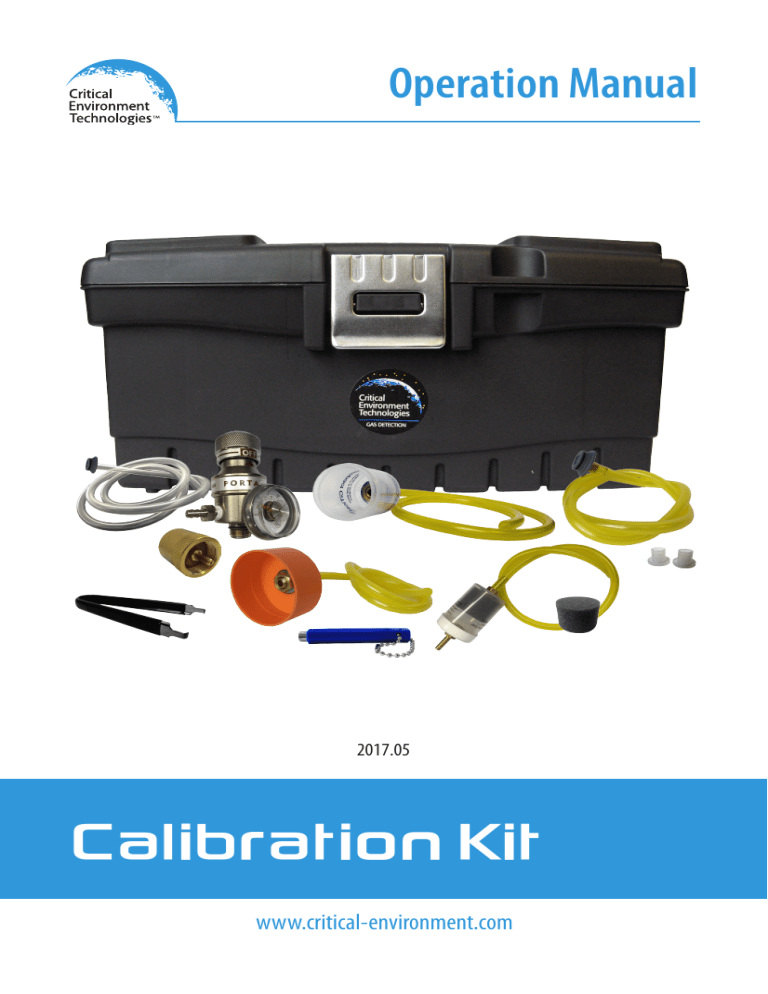 Operation Manual 2017.05 Calibration Kit www.critical-environment.com Calibration Kit - Operation Manual 2017.05 STANDARD CALIBRATION KIT CONTENTS P/N: CET-715A-CK1 q w e r # 2 t y u i o a s Description Replacement Part Number q Regulator for fixed flow @0.5 LPM for 34 L, 58 L, 74 L and 103 L cylinders REG-0715-CR2 w Teflon lined tube (2ft) for calibrating sticky gases (see NOTE on next page) n/a e Calibration adapter plug with O-ring and two zeroing port plugs (adapter plug fits industry standard internal sensor vents) CET-7000-CAP r Calibration adapter cup for splash guard CET-4700-SCC t Magnetic wand for non-intrusive calibration (2 5/8” x 1/4” hexagon) For use with the LPT-A and SCC CET-MW y Brass fitting to convert fixed flow regulator for use on 15 L and 17 L cylinders REG-ADAPTER u Calibration adapter cup for remote (ESH) sensors (dongle style) CET-8000-ESH i Sensor extracting tool for replacing used catalytic and solid state refrigerant sensors CET-8000-SRT o Carrying case CET-715A-CK1 a Humidification chamber for calibrating solid state refrigerant sensors CET-8000-HC s Spare humidification sponge CET-8000-HCS © 2017 All rights reserved. Data subject to change without notice. 2017.05 Calibration Kit - Operation Manual NOTE: The Calibration Kit is not suitable for use with our YES product line. © 2017 All rights reserved. Data subject to change without notice. 3 Calibration Kit - Operation Manual 4 2017.05 © 2017 All rights reserved. Data subject to change without notice. 2017.05 Calibration Kit - Operation Manual SAMPLE DRAW CALIBRATION KIT P/N: CET-715A-SDP The Sample Draw Calibration Kit contains the same items as the Standard Kit with the addition of a 1.0 LPM demand flow regulator. © 2017 All rights reserved. Data subject to change without notice. 5 Calibration Kit - Operation Manual 2017.05 INSTRUCTIONS NOTE: For complete instructions on the calibration procedure of CETCI’s gas detectors, please refer to the specific product Operation Manual. A bump test will help you determine if a sensor requires calibration. If the sensor still does not respond as it should after a successful calibration, it probably requires replacing. Temperature affects calibration. It is important to ensure the gas is at the appropriate temperature during calibration. If the sensor is being used in an extreme temperature range, calibration should be done in that same temperature range. Regulators & Flow Calibration gases that are lighter than (NH3, H2, CH4 etc. ) or the same weight as air (CO, O2, NO, C2H4, etc.) should be flowed at 0.5 LPM. Gases heavier than air (NO2, O3, CL2, C3H8, refrigerants, SO2, F2, etc.) should be flowed between 0.5 and 1.0 LPM. Fixed flow regulators provide more accuracy. Calibration Adapters The proper calibration adapter should be utilized to allow the gas to properly diffuse around the sensor. Refer to previous page, numbers e (standard adapater), r (splash guard adapter) and u (dongle style remote sensor adapter). Humidification Chamber For solid state refrigerant and TVOC sensors, an inline humidifier is required for all operations with bottled gas (bump test, zero and span). Flowing dry gas over solid state refrigerant sensors can result in a negative reaction and inaccurate readings. Catalytic, Electrochemical, Infrared and PID Sensors Do not use the humidification chamber when calibrating catalytic, electrochemical, IR or PID sensors. Before flowing zero air and span gas, either remove the sponge from the humidification chamber (a) or use the tubing without the attached humidification chamber (e). Catalytic sensors require oxygen to work and thus the user MUST flow clean air or oxygen to obtain a true zero and the span gas must have “air” balance, not N2 balance. If calibrating an infrared Carbon Dioxide CO2 sensor, it must be zeroed with 100% Nitrogen (N2). All other infrared sensors for combustibles and refrigerants, along with PIDs should be zeroed with air. Sticky Gases Ozone (O3), Chlorine (Cl2), Hydrogen Chloride (HCl), Ammonia (NH3) and Nitrogen Dioxide (NO2) are considered to be sticky gases, which means they adhere to surfaces. When calibrating these gases, use the Teflon lined tubing (w)so the gas doesn’t saturate and adhere to the tubing, weakening the concentration of the flow of gas. Also, keep the length of the Teflon tubing to no more than 2 - 3 ft so the 6 © 2017 All rights reserved. Data subject to change without notice. 2017.05 Calibration Kit - Operation Manual gas flow concentration doesn’t lessen over the distance from the gas cylinder to the sensor. NOTE: CETCI does not use or sell cylinders of Chlorine gas due to the instability of the gas and the difficulty to get accurate readings from that source. We recommend that you use a Chlorine gas generator. Contact CETCI or your Regional Sales Manager for more information. NOTE: After a substantial warm up period, an Ethylene Oxide sensor should be zeroed on site if the ambient temperature is above 22°C (71.6°F). This particular sensor has a drift factor that can be as much © 2017 All rights reserved. Data subject to change without notice. 7 Calibration Kit - Operation Manual 2017.05 as 1 ppm if the temperature rises to 25°C (77°F). With the low set point you could experience false alarms. NOTE: During calibration, when flowing span gas on an Ammonia sensor, if the reading climbs higher than the calibration point after applying gas for 3 minutes, use that reading as the calibration point. It should be around 300 ppm. Oxygen Sensors When calibrating an Oxygen sensor, the process is reversed. You need to do the span first and then the zero. Flow Nitrogen (N2) over Oxygen (O2) sensors before attempting to null adjust them. If the service person is confident of air quality and is careful (do not exhale in the direction of the Oxygen sensor being serviced while span adjusting), oxygen in the breathing environment can be used as a fairly accurate source of span gas (20.9% volume) 