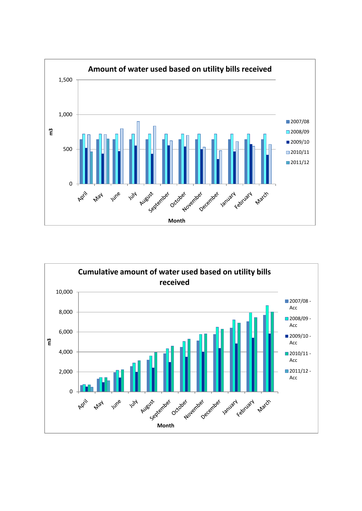 Amount of water used based on utility bills received 1,500 1,000 m3 2007/08 2008/09 2009/10 500 2010/11 2011/12 0 Month Cumulative amount of water used based on utility bills received 10,000 2007/08 Acc 8,000 2008/09 Acc 6,000 m3 2009/10 Acc 4,000 2010/11 Acc 2,000 2011/12 Acc 0 Month
