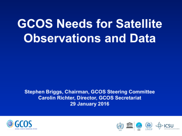 GCOS Needs for Satellite Observations and Data Stephen Briggs, Chairman, GCOS Steering Committee Carolin Richter, Director, GCOS Secretariat 29 January 2016 Recent and Next Milestones • Status Report of the Global Observing System for Climate (2015) • New Implementation Plan (2016) WMO Congress in 2015 (Cg-17) Commitment of WMO Members to Resolution 39 (Cg-17): Global Climate Observing System Excerpt from Cg-17 Report: “ …Congress recommended that the Status Report and Implementation Plan should be submitted for review to relevant WMO Technical Commissions and the appropriate Expert Teams, before formal submission to the UNFCCC. …” Status Report and Outline for the new GCOS IP submitted to UNFCCC SBSTA43/COP21 • GCOS fulfils the responsibility to review and assess the development and implementation of the component parts of the climate observing system and to report to its sponsors, partners and to UNFCCC. • A report on the “Status of the Global Observing System for Climate” has been prepared during the period from May to October 2015 with contributions from panels and external experts. It has been submitted to public review during summer of 2015, and has been delivered to SBSTA on 20 October 2015, for presentation at COP21 in Paris. • Draft outline for the new GCOS Implementation has been submitted to COP21. The new plan is due for SBSTA45 / COP22 in 2016. COP21 / SBSTA43, Paris, December 2015 Conclusion: • Encouraged GCOS to consider the outcomes of COP21 when preparing the new GCOS Implementation Plan. • Invited GCOS to collaborate with relevant partners to continue enhancing access to, and understanding and interpretation of, data products and information to support decision-making on adaptation and mitigation at national, regional and global scales. • Urged Parties to work towards addressing the priorities and gaps identified in the GCOS 2015 Status Report. • Invited Parties and relevant organizations to provide inputs to, and contribute to the review of, the new GCOS implementation plan. Chronic of GCOS Reports and Plans: following the Second Adequacy Report in 2003, GCOS produced: • an Implementation Plan in 2004 • a Supplement to the Plan in 2006 on requirements for satellite-based data products • a Progress Report in 2009 • an updated Implementation Plan in 2010 • an updated Satellite Supplement in 2011 and most recently: • The Status Report in 2015 Conclusions of the Status Report 2015 General finding on atmospheric observations: Global observation varies in its nature, arrangement and extent across the atmospheric, oceanic and terrestrial domains. Owing to the heritage of many decades of meteorological data collection, atmospheric observation is the best developed, with relatively dense though far from gap-free networks, clear observational standards, largely open data exchange and international data centres covering most, if not all, variables. Refinement of atmospheric observation is on-going. General finding on ocean observations: Ocean observation has developed quickly, with international planning and implementation of observational networks, and new technologies that enable more and better autonomous data collection. While there are still limitations and some issues with established networks, overall structures are in place for the improvement to continue. General finding on terrestrial observations: Terrestrial observations have traditionally been made on smaller scales, with different standards and methods in different countries. They also have a poor history of open data exchange. Space-based observation is now providing global coverage of improving quality for a number of variables, increasingly with open data access, and there is progress in other areas, through global networks for glaciers and permafrost, for example. Standards, methods and data-exchange protocols for key hydrological variables have been developed. However, an integrated approach to terrestrial observation is still lacking. Principal Findings for space-based components – slide 1/4 • The newer and planned generations of operational meteorological satellite systems offer improved quality and a broader range of measurements. China is becoming established as the provider of a third pillar in the constellation of polarorbiting systems. • The European Copernicus programme is placing additional types of observation on an operational basis, with increased coverage and quality of measurement, and accompanying service provision. Principal Findings for space-based components – slide 2/4 • There have been increases in the numbers of national providers, co-operative international missions and other collaborative arrangements. • There has been very little progress on the continuation of limb sounding and the establishment of a reference mission. • Continuity of measurement is at risk for solar irradiance and for sea-surface temperature at microwave frequencies. Principal Findings for space-based components – slide 3/4 • New observational capabilities have been demonstrated, and others are being prepared for demonstration. Future deployment is uncertain for some of the demonstrated capabilities, for example for monitoring cloud and aerosol profiles, sea-ice thickness and soil moisture. • The generation and supply of products derived from space-based observations have progressed well, with increasing attention paid to documenting product quality and uncertainty. Principal Findings for space-based components – slide 4/4 • Inter-agency cooperation has been effective in product validation and in starting to develop an architecture for climate monitoring from space and an inventory of products. • Data access is becoming more open, although there is still progress to be made. Some data remain to be recovered from early missions, and long-term preservation of data, including occasional reprocessing, is not yet fully ensured. Detailed findings for: In-sit