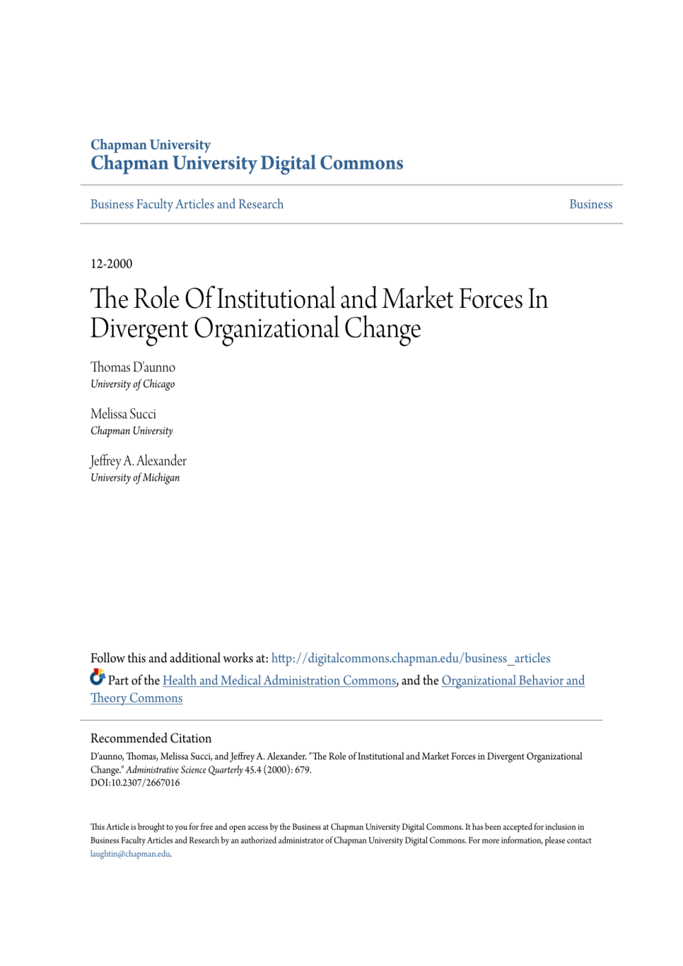 Chapman University Chapman University Digital Commons Business Faculty Articles and Research Business 12-2000 The Role Of Institutional and Market Forces In Divergent Organizational Change Thomas D'aunno University of Chicago Melissa Succi Chapman University Jeffrey A. Alexander University of Michigan Follow this and additional works at: http://digitalcommons.chapman.edu/business_articles Part of the Health and Medical Administration Commons, and the Organizational Behavior and Theory Commons Recommended Citation D'aunno, Thomas, Melissa Succi, and Jeffrey A. Alexander. "The Role of Institutional and Market Forces in Divergent Organizational Change." Administrative Science Quarterly 45.4 (2000): 679. DOI:10.2307/2667016 This Article is brought to you for free and open access by the Business at Chapman University Digital Commons. It has been accepted for inclusion in Business Faculty Articles and Research by an authorized administrator of Chapman University Digital Commons. For more information, please contact [email protected]. The Role Of Institutional and Market Forces In Divergent Organizational Change Comments This article was originally published in Administrative Science Quarterly, volume 45, issue 4, in 2000. DOI: 10.2307/2667016 Copyright Administrative Science Quarterly This article is available at Chapman University Digital Commons: http://digitalcommons.chapman.edu/business_articles/4 The Role of Institutional This paper focuses on a radical change, in which organizations abandon an institutionalized template for arrangand MarketForces in ing their core activities, that is likely to occur in organizaDivergent Organizational tional fields that have strong, local market forces and Change strong but heterogeneous institutional forces. We examThomas D'Aunno Universityof Chicago Melissa Succi ChapmanUniversity Jeffrey A. Alexander Universityof Michigan ine the role of market forces and heterogeneous institutional elements in promoting divergent change in core activities among all U.S. rural hospitals from 1984 to 1991. Results support the view that divergent change depends on both market forces (proximity to competitors, disadvantages in service mix) and institutional forces (state regulation, ownership and governance norms, and mimicry of models of divergent change).* Organizationsoften arrangetheir core activities accordingto accepted models, or templates, in their field. These templates are patternsfor arrangingorganizationalbehaviorthat specify organizationalstructureand goals and reflect a distinct set of beliefs and values. Accountingand law firms, for example, have traditionallyused templates that emphasized individualautonomy and equalityamong peers, what Greenwood and Hinings(1993, 1996) termed a professionalpartnership model. Some templates are so repetitiveand enduring across an entire organizationalfield that actors take it for grantedthat this patternis the rightway to organize(Oliver, 1992). Yet organizationsdo abandonsuch templates, diverging from accepted models in their field. What causes them to abandonan institutionalizedtemplate for arrangingtheir core activitiesand replace this template with a substantiallydifferent one? ? 2000 by Cornell University. 0001-8392/00/4504-0679 /$3.00. 0 This research was supported by a grant from the Agency for Health Care Policy and Research. We thank the editor and reviewers for helpful comments. We also received helpful comments from seminar participants at the University of Illinois Graduate School of Business, University of Chicago Graduate School of Business, the Fuqua Business School at Duke University, the Kellogg School of Management at Northwestern University, INSEAD, and the University of Michigan. Understandingthe causes of such divergentorganizational change is importantboth for understandingthe change itself and for advancingneo-institutionaltheory. Untilrelatively recently,theory and research have focused on examiningthe successful reproductionand diffusionof organizationalforms and practices (DiMaggioand Powell, 1991; Oliver,1992; Scott, 1995). It is not yet clear how the theory can be extended to account for divergentorganizationalchange (Greenwood and Hinings,1996; Kraatzand Zajac,1996; Kraatzand Moore, 1998). Further,examiningsuch change would help to linkthe "old"and "new" institutionaltheories (Greenwood and Hinings,1996; Selznick, 1996; Hirschand Lounsbury, 1997). This is so because divergentchange involves both a transformationin organizationalgoals, a focus of the original institutionalschool, and a transformationin widely held beliefs and norms, a focus of neo-institutionalresearch (e.g., Zaldand Denton, 1963; DiMaggioand Powell, 1991). Thoughtheorists have proposed several explanationsfor divergentorganizationalchange (e.g., DiMaggio,1988; Oliver, 1992; Thornton,1995), recent conceptual papers (Greenwood and Hinings,1996), case studies (Leblebiciet al., 1991), and a few large-scaleempiricalstudies (Davis,Diekmann,and Tinsley, 1994; Kraatzand Zajac,1996) have emphasized the importanceof both marketcompetitionand institutionalfactors in causing such change. Kraatzand Zajac(1996) found that local marketforces (e.g., consumer demand) prompted divergentchanges in curriculaamong U.S. liberalarts colleges (e.g., offering business degrees). In contrast, results 679/AdministrativeScience Quarterly,45 (2000): 679-703 This content downloaded from 206.211.139.182 on Thu, 6 Nov 2014 15:48:36 PM All use subject to JSTOR Terms and Conditions from Davis, Diekmann,and Tinsley(1994) suggested that institutionalfactors caused decreased use of the conglomerate form of organizationin the 1980s-the very idea of this form was no longer legitimate. One explanationfor these inconsistent results is that there are varyingmarketand institutionalconditions underwhich divergentorganizational change occurs. Earlierconceptual and laterempiricalwork in neo-institutionaltheory (e.g., Scott and Meyer, 1983; Dacin, 1997) has emphasized that 