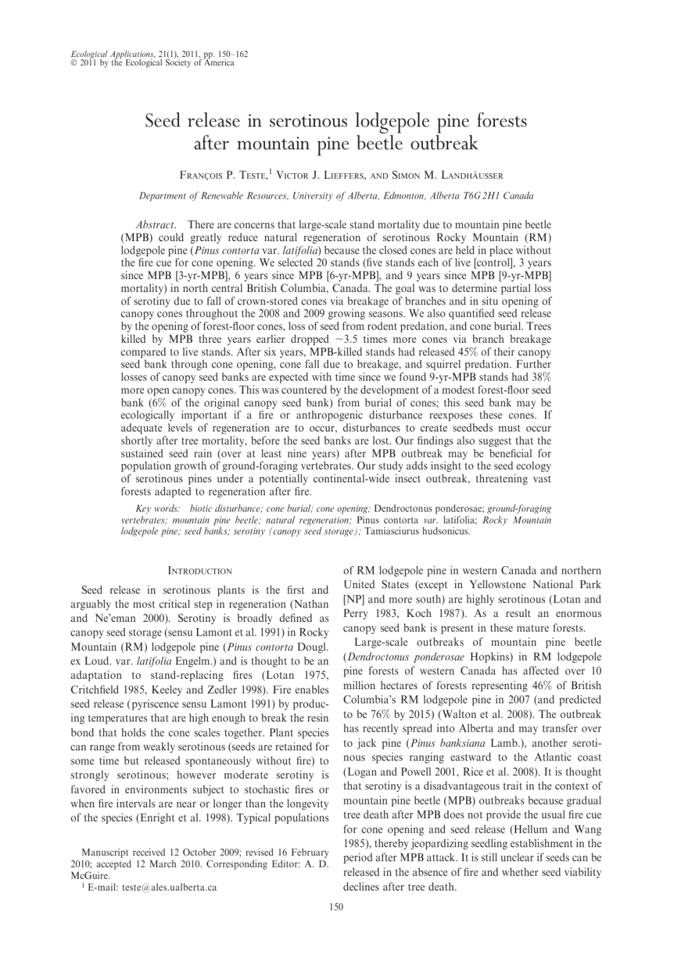 Ecological Applications, 21(1), 2011, pp. 150–162 Ó 2011 by the Ecological Society of America Seed release in serotinous lodgepole pine forests after mountain pine beetle outbreak FRANÇOIS P. TESTE,1 VICTOR J. LIEFFERS, AND SIMON M. LANDHÄUSSER Department of Renewable Resources, University of Alberta, Edmonton, Alberta T6G 2H1 Canada Abstract. There are concerns that large-scale stand mortality due to mountain pine beetle (MPB) could greatly reduce natural regeneration of serotinous Rocky Mountain (RM) lodgepole pine (Pinus contorta var. latifolia) because the closed cones are held in place without the fire cue for cone opening. We selected 20 stands (five stands each of live [control], 3 years since MPB [3-yr-MPB], 6 years since MPB [6-yr-MPB], and 9 years since MPB [9-yr-MPB] mortality) in north central British Columbia, Canada. The goal was to determine partial loss of serotiny due to fall of crown-stored cones via breakage of branches and in situ opening of canopy cones throughout the 2008 and 2009 growing seasons. We also quantified seed release by the opening of forest-floor cones, loss of seed from rodent predation, and cone burial. Trees killed by MPB three years earlier dropped ;3.5 times more cones via branch breakage compared to live stands. After six years, MPB-killed stands had released 45% of their canopy seed bank through cone opening, cone fall due to breakage, and squirrel predation. Further losses of canopy seed banks are expected with time since we found 9-yr-MPB stands had 38% more open canopy cones. This was countered by the development of a modest forest-floor seed bank (6% of the original canopy seed bank) from burial of cones; this seed bank may be ecologically important if a fire or anthropogenic disturbance reexposes these cones. If adequate levels of regeneration are to occur, disturbances to create seedbeds must occur shortly after tree mortality, before the seed banks are lost. Our findings also suggest that the sustained seed rain (over at least nine years) after MPB outbreak may be beneficial for population growth of ground-foraging vertebrates. Our study adds insight to the seed ecology of serotinous pines under a potentially continental-wide insect outbreak, threatening vast forests adapted to regeneration after fire. Key words: biotic disturbance; cone burial; cone opening; Dendroctonus ponderosae; ground-foraging vertebrates; mountain pine beetle; natural regeneration; Pinus contorta var. latifolia; Rocky Mountain lodgepole pine; seed banks; serotiny (canopy seed storage); Tamiasciurus hudsonicus. INTRODUCTION Seed release in serotinous plants is the first and arguably the most critical step in regeneration (Nathan and Ne’eman 2000). Serotiny is broadly defined as canopy seed storage (sensu Lamont et al. 1991) in Rocky Mountain (RM) lodgepole pine (Pinus contorta Dougl. ex Loud. var. latifolia Engelm.) and is thought to be an adaptation to stand-replacing fires (Lotan 1975, Critchfield 1985, Keeley and Zedler 1998). Fire enables seed release (pyriscence sensu Lamont 1991) by producing temperatures that are high enough to break the resin bond that holds the cone scales together. Plant species can range from weakly serotinous (seeds are retained for some time but released spontaneously without fire) to strongly serotinous; however moderate serotiny is favored in environments subject to stochastic fires or when fire intervals are near or longer than the longevity of the species (Enright et al. 1998). Typical populations Manuscript received 12 October 2009; revised 16 February 2010; accepted 12 March 2010. Corresponding Editor: A. D. McGuire. 1 E-mail: [email protected] 150 of RM lodgepole pine in western Canada and northern United States (except in Yellowstone National Park [NP] and more south) are highly serotinous (Lotan and Perry 1983, Koch 1987). As a result an enormous canopy seed bank is present in these mature forests. Large-scale outbreaks of mountain pine beetle (Dendroctonus ponderosae Hopkins) in RM lodgepole pine forests of western Canada has affected over 10 million hectares of forests representing 46% of British Columbia’s RM lodgepole pine in 2007 (and predicted to be 76% by 2015) (Walton et al. 2008). The outbreak has recently spread into Alberta and may transfer over to jack pine (Pinus banksiana Lamb.), another serotinous species ranging eastward to the Atlantic coast (Logan and Powell 2001, Rice et al. 2008). It is thought that serotiny is a disadvantageous trait in the context of mountain pine beetle (MPB) outbreaks because gradual tree death after MPB does not provide the usual fire cue for cone opening and seed release (Hellum and Wang 1985), thereby jeopardizing seedling establishment in the period after MPB attack. It is still unclear if seeds can be released in the absence of fire and whether seed viability declines after tree death. January 2011 SEED RELEASE AFTER MOUNTAIN PINE BEETLE 151 PLATE 1. A 3-yr-MPB stand in black and white infrared with a surviving live codominant Rocky Mountain lodgepole pine (white needles). Photo credit: F. P. Teste. First, as trees die, seeds may be released as a result of canopy cone opening due to increased canopy temperatures and weathering. A comparable situation has been observed in the serotinous pine Pinus halepensis Miller where warm and dry conditions provoked cone opening (xeriscence) and released up to 59% of the canopy seeds (Nathan et al. 1999). Second, cones from the crown will likely be lost in the years following MPB outbreak. We hypothesize a peak in loss of cones to the forest floor early after tree death; the small branches will quickly dry and become brittle while the bole still retains moisture and remains flexible. The sway of the trees and the crown friction (Rudnicki et al. 2003) at this time could cause significant breakage of cone-bearing branches. Third, it remains to be seen if the seeds in these cones are retained or fall onto the forest floor. Fourth, if closed 