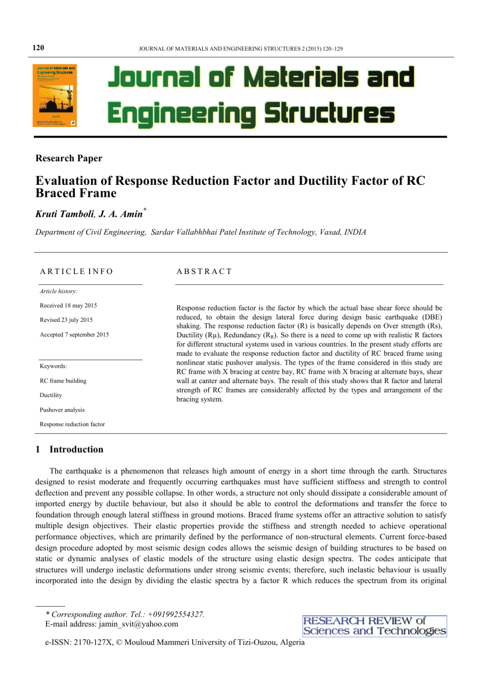 120 JOURNAL OF MATERIALS AND ENGINEERING STRUCTURES 2 (2015) 120–129 Research Paper Evaluation of Response Reduction Factor and Ductility Factor of RC Braced Frame Kruti Tamboli, J. A. Amin* Department of Civil Engineering, Sardar Vallabhbhai Patel Institute of Technology, Vasad, INDIA ARTICLE INFO ABSTRACT Article history: Received 18 may 2015 Revised 23 july 2015 Accepted 7 september 2015 Keywords: RC frame building Ductility Response reduction factor is the factor by which the actual base shear force should be reduced, to obtain the design lateral force during design basic earthquake (DBE) shaking. The response reduction factor (R) is basically depends on Over strength (Rs), Ductility (Rµ), Redundancy (RR). So there is a need to come up with realistic R factors for different structural systems used in various countries. In the present study efforts are made to evaluate the response reduction factor and ductility of RC braced frame using nonlinear static pushover analysis. The types of the frame considered in this study are RC frame with X bracing at centre bay, RC frame with X bracing at alternate bays, shear wall at canter and alternate bays. The result of this study shows that R factor and lateral strength of RC frames are considerably affected by the types and arrangement of the bracing system. Pushover analysis Response reduction factor 1 Introduction The earthquake is a phenomenon that releases high amount of energy in a short time through the earth. Structures designed to resist moderate and frequently occurring earthquakes must have sufficient stiffness and strength to control deflection and prevent any possible collapse. In other words, a structure not only should dissipate a considerable amount of imported energy by ductile behaviour, but also it should be able to control the deformations and transfer the force to foundation through enough lateral stiffness in ground motions. Braced frame systems offer an attractive solution to satisfy multiple design objectives. Their elastic properties provide the stiffness and strength needed to achieve operational performance objectives, which are primarily defined by the performance of non-structural elements. Current force-based design procedure adopted by most seismic design codes allows the seismic design of building structures to be based on static or dynamic analyses of elastic models of the structure using elastic design spectra. The codes anticipate that structures will undergo inelastic deformations under strong seismic events; therefore, such inelastic behaviour is usually incorporated into the design by dividing the elastic spectra by a factor R which reduces the spectrum from its original * Corresponding author. Tel.: +091992554327. E-mail address: [email protected] e-ISSN: 2170-127X, © Mouloud Mammeri University of Tizi-Ouzou, Algeria JOURNAL OF MATERIALS AND ENGINEERING STRUCTURES 2 (2015) 120–129 121 elastic demand level to a design level. The most important factors determining response reduction factors are the structural ductility and over strength capacity. Riddell et al. [1] evaluated response modification factors and ductility factors of short period buildings, where the reduction of linear elastic response spectra is smaller than the values for intermediate and long period structures for various sets of earthquake records. An idealized and simple variation of the response modification factor as a function of the period of vibration suitable for seismic codes formulation is also presented. Miranda [2] presented the different components of so called R factors and discusses how these can be incorporated into a performance-based earthquake resistant design. He also describes how strength reduction factors derived from single-degree-of-freedom systems need to be modified in order to be used in the design of multi -degree-of-freedom systems. Elanashai and Mwafy [3] addressed the issue of horizontal over strength in modern code/standard for design of reinforced-concrete (RC) buildings. The relationship between the lateral capacity, the design force reduction factor, the ductility level and the over strength factor are also investigated. Maheri and Akbari [4] evaluated the seismic behaviour factor for steel X-braced and knee-braced RC buildings using nonlinear pushover analyses of brace-frame systems having different heights and configurations. Authors concluded that Types of bracing had more localizes effects on the ‘R’ factor. Mahmoudi and Zaree [5] evaluated the response modification factors of conventional concentric braced frames as well as buckling restrained braced frames. Authors concluded that the number of bracing bays and height of buildings have greater effect on the response modification factor. Kadid and Yahiaoui [6] investigated the seismic behaviour of RC buildings strengthened with different types of steel braces like X-bracing, inverted V bracing, ZX bracing and Zipper bracing. The R factors in many developing countries are often adopted from the well developed seismic design codes used in the United States or Europe. These R factors provide false representation for the structural practices applied in developing countries and thus considered unrealistic. Here in present study 4-storey RC building frame analyzed using static nonlinear pushover analysis and efforts are made to evaluate lateral strength, response reduction factor and ductility factor of RC braced frame. 2 Concept of Response Reduction Factor The code provision allows the structure to be damaged in the case of sever shaking. Hence, the structure is designed for seismic force much lesser than that expected under strong earthquakes, if the structure were to remain linearly elastic. Thus, the Indian seismic standard IS 1893 [7] provides a realistic force for an elastic structure and then divides that force by 2R. In other words, the term R gives an indication of the level of over strength and ductility that a structure is expected to have
