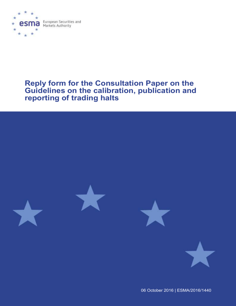 Reply form for the Consultation Paper on the Guidelines on the calibration, publication and reporting of trading halts 06 October 2016 | ESMA/2016/1440 Date: 06 October 2016 Responding to this paper The European Securities and Markets Authority (ESMA) invites responses to the specific questions listed in the ESMA Discussion Paper on the Guidelines on specific notions under MiFID II related to the management body of market operators and data reporting services providers, published on the ESMA website. Instructions Please note that, in order to facilitate the analysis of the large number of responses expected, you are requested to use this file to send your response to ESMA so as to allow us to process it properly. Therefore, ESMA will only be able to consider responses which follow the instructions described below: use this form and send your responses in Word format (pdf documents will not be considered except for annexes); do not remove the tags of type <ESMA_ QUESTION_MIFID_GTH_1> - i.e. the response to one question has to be framed by the 2 tags corresponding to the question; and if you do not have a response to a question, do not delete it and leave the text “TYPE YOUR TEXT HERE” between the tags. Responses are most helpful: if they respond to the question stated; contain a clear rationale, including on any related costs and benefits; and describe any alternatives that ESMA should consider. Naming protocol In order to facilitate the handling of stakeholders responses please save your document using the following format: ESMA_MiFID_GTH_NAMEOFCOMPANY_NAMEOFDOCUMENT. e.g. if the respondent were ESMA, the name of the reply form would be: ESMA_MiFID_GTH_ESMA_REPLYFORM or ESMA_MiFID_GTH_ESMA_ANNEX1 Deadline Responses must reach us by 06 December 2016. All contributions should be submitted online at www.esma.europa.eu under the heading ‘Your input/Consultations’. Publication of responses All contributions received will be published following the end of the consultation period, unless otherwise requested. Please clearly indicate by ticking the appropriate checkbox in the website submission form if you do not wish your contribution to be publicly disclosed. A standard confidentiality statement in an email message will not be treated as a request for non-disclosure. Note also that a confidential response may be requested from us in accordance with ESMA’s rules on access to documents. We may consult you if we receive such a request. Any decision we make is reviewable by ESMA’s Board of Appeal and the European Ombudsman. Data protection Information on data protection can be found at www.esma.europa.eu under the heading ‘Legal notice’. 3 Introduction Please make your introductory comments below, if any: < ESMA_COMMENT_MIFID_GTH_0> TYPE YOUR TEXT HERE < ESMA_COMMENT_MIFID_GTH_0> 4 Would you consider these factors discussed above to be useful? Could you identify any additional element to be factored in? <ESMA_QUESTION_MIFID_GTH_1> No. Regarding the inputs to take into account to calibrate volatility parameters we do not agree with all of them. To calibrate a set of parameters at the level of a class of financial instrument is not necessary because in our point of view trading halts should only apply in futures order books, and only those futures that are considerate appropriate to the trading venue. Due to its nature it makes no sense to have trading halts in options or dividend futures for example. We do not agree either with the input External references. A derivative in our market has nothing to do with the same derivative traded in another market, the order books are completely different and a trading halt in one of them should not imply a trading halt in another market. Regarding the duration of the halts is very complex to define an exact length, but we can consider establish an approximate duration, from 30 seconds to 15 minutes, although it could be extended if the trading venue considers it necessary. When calibrating the volatility parameter we agree to take into consideration the number of times the mechanism was used in the previous years, but only on our own platform, not in the platforms of other trading venues. <ESMA_QUESTION_MIFID_GTH_1> Do you consider that the Guidelines regarding calibration of volatility parameters should also apply to mechanisms to reject erroneous orders (i.e. order price / volume collars) and that ESMA should propose Guidelines on this issue at its own initiative? <ESMA_QUESTION_MIFID_GTH_2> No, mechanisms to reject erroneous orders are already in place with their correspondent parameters. <ESMA_QUESTION_MIFID_GTH_2> Is there any other aspect which should be considered in these Guidelines so as to prevent market-wide volatility events given the current structure of European markets? <ESMA_QUESTION_MIFID_GTH_3> No. <ESMA_QUESTION_MIFID_GTH_3> Do you consider that the proposed order and trade feed reporting standard for trading status will contribute to facilitate a correct identification of trading halts across Europe? Do you foresee any drawback on it? <ESMA_QUESTION_MIFID_GTH_4> This unified data is already available via vendors and we consider it does not provide further information or add any value to market participants.<ESMA_QUESTION_MIFID_GTH_4> Would you prefer a further degree of granularity in the information provided as described in the text under paragraphs 46 and 47? Please elaborate in case you consider necessary further granularity but you disagree with the proposed approach. 5 <ESMA_QUESTION_MIFID_GTH_5> No, degree of granularity is wide enough. <ESMA_QUESTION_MIFID_GTH_5> Is the code proposed above (i.e. “VH”) appropriate, or should another code be used? Please elaborate in case you consider that another code should be used. <ESMA_QUESTION_MIFID_GTH_6> Yes, it is fine.l <ESMA_QUESTION_MIFID_GTH_6> Do you agree with the reporting template proposed? <ESMA_QUESTION_MIFID_GTH_7> Yes. <ESMA_QUESTION_MIFID_GTH_7> Are there any ot