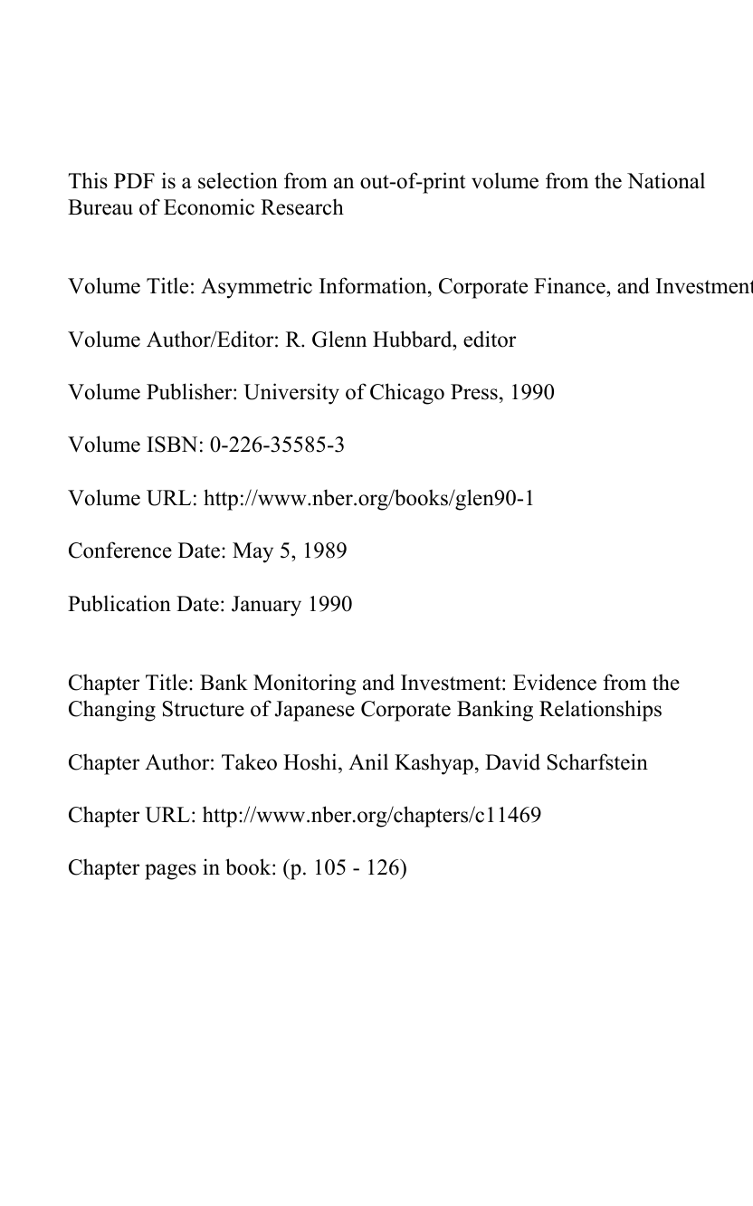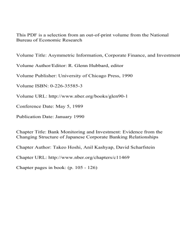 This PDF is a selection from an out-of-print volume from the National Bureau of Economic Research Volume Title: Asymmetric Information, Corporate Finance, and Investment Volume Author/Editor: R. Glenn Hubbard, editor Volume Publisher: University of Chicago Press, 1990 Volume ISBN: 0-226-35585-3 Volume URL: http://www.nber.org/books/glen90-1 Conference Date: May 5, 1989 Publication Date: January 1990 Chapter Title: Bank Monitoring and Investment: Evidence from the Changing Structure of Japanese Corporate Banking Relationships Chapter Author: Takeo Hoshi, Anil Kashyap, David Scharfstein Chapter URL: http://www.nber.org/chapters/c11469 Chapter pages in book: (p. 105 - 126) Bank Monitoring and Investment: Evidence from the Changing Structure of Japanese Corporate Banking Relationships Takeo Hoshi, Anil Kashyap, and David Scharfstein 4.1 Introduction Economists typically view banks as intermediaries that serve to channel funds from individual investors to firms with productive investment opportunities. This commonly held view, however, is difficult to reconcile with the assumption of frictionless capital markets: in frictionless markets, firms would raise capital directly from individual investors and avoid the costs of intermediation.1 This paper offers empirical evidence on the benefits of intermediation. Our explanation for the existence of financial intermediaries derives from the view that there may be important capital-market frictions created by information problems between firms and investors. We view banks and other financial intermediaries as institutions designed in part to circumvent these capitalmarket imperfections. Specifically, banks serve as corporate monitors who pay the costs of becoming informed about their client firms and who try to ensure that the managers of these firms take efficient actions. This view of the role of banks is not new. Schumpeter (1939) argued informally along these lines, and Diamond (1984) has constructed a formal model Takeo Hoshi is assistant professor of economics at the Graduate School of International Relations and Pacific Studies, University of California, San Diego. Anil Kashyap is an economist in the Division of Research and Statistics at the Board of Governors of the Federal Reserve System. David Scharfstein is associate professor of finance at the Massachusetts Institute of Technology, Sloan School of Management. The authors thank Glenn Hubbard for useful conversations on numerous occasions. They are also grateful to Yasushi Hamao, Takatoshi Ito, Jim Kahn, John McMillan, Jim Poterba, and conference participants for helpful comments and to Masako Niwa, William Kan, and Andrew Wiedlin for valuable research assistance. The data were generously provided by the Nikkei Data Bank Bureau. The views expressed in this paper are those of the authors and do not necessarily reflect the opinions of the Board of Governors of the Federal Reserve or its staff. 105 106 T. Hoshi/A. Kashyap/D. Scharfstein that captures these and related ideas. Diamond shows that delegating the task of monitoring to a financial intermediary minimizes monitoring costs. The alternative—issuing securities like public debt and equity—may be inefficient either because monitoring costs are needlessly duplicated among individual security holders or because monitoring is a public good that no one has an incentive to provide. Of course, this raises a potentially troubling question: Who ensures that banks monitor the firms in which they invest? Diamond shows that bank diversification plays a key role in ensuring that banks indeed monitor their client firms. His is the first model that takes full account of monitoring costs and shows that financial intermediation can be the most efficient monitoring mechanism. Ramakrishnan and Thakor (1984) and Williamson (1986) make similar points. Our goal in this paper is to analyze empirically the role of banks in monitoring firms when there are information problems in the capital market. The focus of our study is the Japanese economy where historically banks have played a much more important role in financing investment than in the United States.2 However, in the past decade the importance of bank financing in Japan has declined dramatically. While bank borrowing comprised 84% of all external financing between 1971 and 1975, it was only 57% in the 1981-85 period. In large part, this resulted from considerable deregulation of Japanese capital markets—enabling firms to raise capital directly from financial markets in the form of bonds and other debt-linked instruments. The result has been a substantial disintermediation of the Japanese financial system. These regulatory changes offer us an excellent opportunity to study the role of financial intermediation. Our research strategy is to examine the investment behavior of a panel of firms before and after deregulation. In the period before deregulation all of the firms in our sample had close ties to a bank or set of banks. After deregulation, some of these firms loosened their ties to banks and relied more heavily on direct capital-market financing. Another set maintained their close banking ties. Our goal is to see whether the investment behavior of firms that have maintained their bank relationships exhibit the features of a bank-monitored firm. Moreover, we wish to detect changes in the investment behavior of firms that have loosened their bank ties: Do they exhibit behavior that reflects the fact that they were monitored before but not after deregulation? Of course the crucial step in this analysis is identifying investment behavior that distinguishes between firms that are monitored and those that are not. In this regard we build on our earlier work in Hoshi, Kashyap, and Scharfstein (1990), which also examined the relationship between liquidity and investment for firms with different degrees of bank affiliation. We argued in that paper that essentially all models that posit some sort of infor