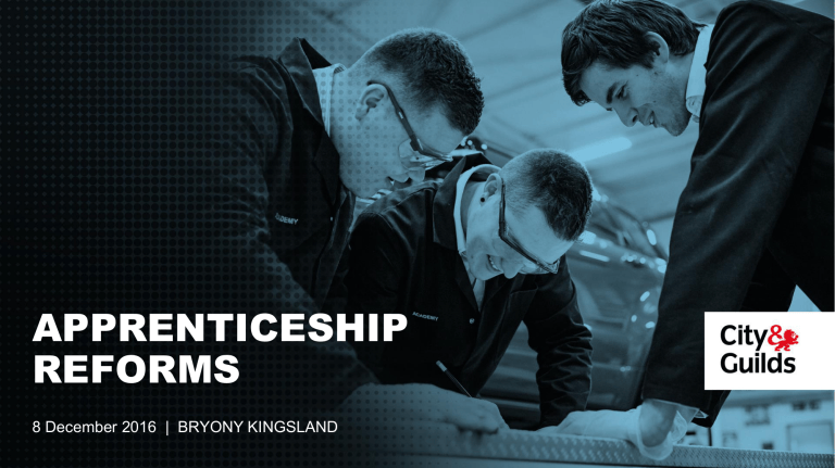Apprenticeship Reforms APPRENTICESHIP REFORMS Bryony Kingsland UK Funding Manager 8 December 2016 | BRYONY KINGSLAND November 2016 AGENDA • Overview of the apprenticeship reforms and what is changing • Funding for apprenticeship training • Funding for non-levy payers • The apprenticeship levy – what can and cannot be funded • The Register of Apprenticeship Training Providers – is it right for you? • The funding process and working with providers • Preparing for delivery – a checklist • Using the Digital Apprenticeship Service (DAS) • Q&A QUICK OVERVIEW OF THE REFORMS • The government is committed to significantly increase the quantity and quality of apprenticeships in England to reach 3 million starts in 2020. • To enable this, government are introducing an employer apprenticeship levy in April 2017. • The levy applies to any employer with a pay-bill over £3million – 0.5% of pay-bill. • At the same time, the Dept for Education have reformed the funding and learning delivery arrangements – apprenticeship Frameworks are transitioning to Standards. • Employers can work with local providers to deliver apprenticeships, or they can choose to deliver the apprenticeship themselves by becoming an employer-provider, or sub-contractor to a main provider. 4 MAIN THINGS ARE CHANGING Employers have more control in designing apprenticeships • Employer led Trailblazer groups are developing new occupational Standards which will replace SASE Frameworks. • An increase from approximately 250 SASE Frameworks to potentially over 800 Standards. • Each new Standard is consulted on before ‘Approval for Delivery’ is given • Note - some of the earlier published Standards are being re-assessed and updated. 4 MAIN THINGS ARE CHANGING New apprenticeships are designed to be more flexible and more effective • Qualifications are no longer mandatory – providers and employers can design a programme to meet new apprenticeship Standard specification (this could include any relevant qualification of any size, unless a specific qualification is mandatory and written into the apprenticeship Standard). • Introduction of end-point assessment – once the apprentice has completed the on-programme phase and passed their gateway criteria they will move on to end-point assessment. • End Point Assessment (EPA) must be carried out independently. Employers will benefit because apprenticeships will be more relevant and meet business needs. 4 MAIN THINGS ARE CHANGING Employers with a pay-bill under £3million (non-levy paying) Employers with a pay-bill over £3million (levy paying) Continue to co-invest on 1:9 ratio with government for the delivery of Trailblazer standards and begin to co-invest for the delivery of ALL apprenticeships Pay an apprenticeships levy via PAYE and HMRC – funds go into the Digital Apprenticeship Service account. With 10% additional top-up from government. The DAS can only be spent on training and assessment of apprenticeships. 4 MAIN THINGS ARE CHANGING There are new funding arrangements that give employers a basis for negotiations with providers. New Funding Bands from May 2017 for Standards and Frameworks Band 1 2 3 4 5 6 7 8 9 10 11 12 13 14 15 Band Upper Limit £1,500 £2,000 £2,500 £3,000 £3,500 £4,000 £5,000 £6,000 £9,000 £12,000 £15,000 £18,000 £21,000 £24,000 £27,000 Current Funding Caps for Standards Funding Band Core Government contribution cap (£) Employer contribution (£) 6 18,000 9,000 5 13,000 6,500 4 8,000 4,000 3 6,000 3,000 2 3,000 1,500 1 2,000 1,000 A DUAL SYSTEM: LEVY AND NON LEVY PROCESS Dual system, dual processes: Levy Paying Employers Levy paid shows in DAS account Non-Levy Paying Employers Employer’s own funds Price agreed Monthly deductions paid to provider Co-investment top up – if insufficient funds 9:1 Agreed price and payment schedule Employer Invoiced by provider Co-investment with government 9:1 APPRENTICESHIP FUNDING OVERVIEW • Levy paying employers will pay 100% of the costs of an apprenticeship to providers, out of their digital account. • Non-levy paying employers will contribute 10% of the cost of an apprenticeship and the government will contribute 90% of the cost, in a co-investment arrangement. • Levy paying employers who have exhausted their levy funds, but who wish to take on more apprentices, will co invest with the government at the same 1:9 ratio. • Employers with less that 50 (49 or less), employees will pay no contribution if they take on a 16-18yr old apprentice, or 19-24 year olds who were formerly in care or who have an Education and Health Care plan. These are fully funded by the government. • From 2018, employers will be able to transfer 10% of their levy funding to another employer with a digital account, e.g. an organisation in their supply chain. CO-INVESTMENT FUNDING (NON-LEVY PAYERS) Co-investment funding for new Digital Standards from May 2107 Standard name Funding band Government contribution Employer contribution £1,800 16-18 employer incentive £1,000 16-18 Provider incentive £1,000 Network Engineer (4) / Software Developer (4) Infrastructure Technician (3) Band 12: £18,000 Band 11: £15,000 £16,200 £13,500 £1,500 £1,000 £1,000 Note: • Micro-businesses (49 employees or less) will not be required to co-invest if they take on a 16 – 18 year old or a 19-24 year old apprentice formerly in care or with an Education and Health Care plan. • £1,000 incentive payment received by both the employer and provider for each 16-18 year old apprentice. • Additional funding available for 19-24 year old apprentice formerly in care or with an Education and Health Care plan. • Additional funding for apprenticeship training in deprived areas. LEVY – MAIN POINTS • The levy applies to any employer with a pay-bill over £3 million – 0.5% of pay-bill. • The levy payment process will operate on a monthly basis, alongside PAYE processes. Levy monthly amounts will 