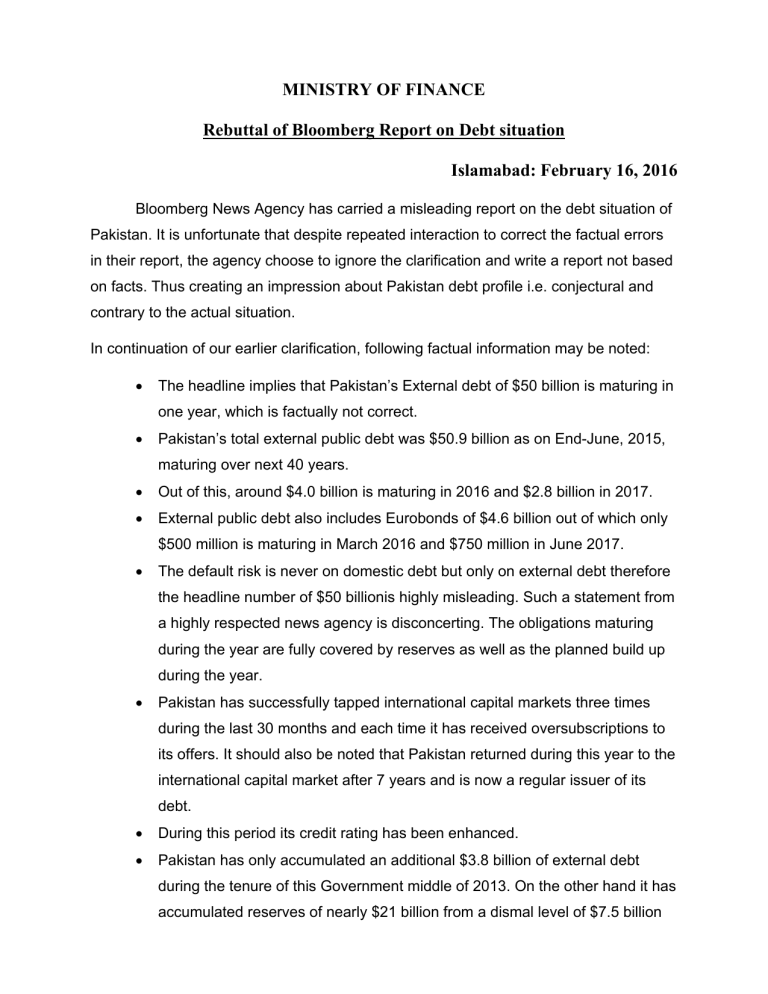 MINISTRY OF FINANCE Rebuttal of Bloomberg Report on Debt situation Islamabad: February 16, 2016 Bloomberg News Agency has carried a misleading report on the debt situation of Pakistan. It is unfortunate that despite repeated interaction to correct the factual errors in their report, the agency choose to ignore the clarification and write a report not based on facts. Thus creating an impression about Pakistan debt profile i.e. conjectural and contrary to the actual situation. In continuation of our earlier clarification, following factual information may be noted: The headline implies that Pakistan’s External debt of $50 billion is maturing in one year, which is factually not correct. Pakistan’s total external public debt was $50.9 billion as on End-June, 2015, maturing over next 40 years. Out of this, around $4.0 billion is maturing in 2016 and $2.8 billion in 2017. External public debt also includes Eurobonds of $4.6 billion out of which only $500 million is maturing in March 2016 and $750 million in June 2017. The default risk is never on domestic debt but only on external debt therefore the headline number of $50 billionis highly misleading. Such a statement from a highly respected news agency is disconcerting. The obligations maturing during the year are fully covered by reserves as well as the planned build up during the year. Pakistan has successfully tapped international capital markets three times during the last 30 months and each time it has received oversubscriptions to its offers. It should also be noted that Pakistan returned during this year to the international capital market after 7 years and is now a regular issuer of its debt. During this period its credit rating has been enhanced. Pakistan has only accumulated an additional $3.8 billion of external debt during the tenure of this Government middle of 2013. On the other hand it has accumulated reserves of nearly $21 billion from a dismal level of $7.5 billion as on End-February 2014. Thus it is fallacious to claim that Pakistan has built reserves on the back of short-term borrowings. Having recently completed the 10th Review under the IMF program, it has been repeatedly emphasized by the Fund that the risks associated with Pakistan’s external account have been greatly reduced. Pakistan’s Euro Bonds maturing in 2016s, 2017s, 2019s, 2024s have traded mostlyat a premium since May 2014 and CDS levelshave been on a downward trajectory as depicted in the following graph taken from Bloomberg itself : CDS Level for Pakistan - 5 Years Source: Bloomberg The domestic debt is perpetual in nature and is constantly refinanced through new issues.It would be novel to consider domestic debts maturing in the near future as posing any risk of default as a sovereign owes these debts in the local currency. We conduct three auctions in the domestic market per month, one for investment bondsof various maturities (3 years or more) and two auctions for treasury bills (of maturities of 3, 6, and 12 months. Participation in each auction ranges from Rs.100 billion to Rs.500 billion and accordingly government refinances its domestic debt from domestic market as a standard practice prevailing in all jurisdictions having competitive debt markets. Domestic market (both primary and secondary) are very well developed and established in Pakistan and as such the government does not feel any cause for concern with regard to refinancing its domestic debt which is also evident from the fact that the yield curve of short term and long term debt have both been declining steadily for past one year and the yield curve is flattening across the maturity profile which again is a sign of stability. Further, interest payments on domestic debt as percentage of GDP are moderate at around 4%. It is also important to mention here that the public debt risk indicators have in fact improved during the last two years i.e. the refinancing risk of the domestic debt reduced at the end of 2014-15 as indicated by percentage of domestic debt maturing in one year reduced to 47 percent compared with 64 percent at the end of 2012-13. Exposure to interest rate risk has also reduced as the percentage of debt re-fixing within one year decreased to 40 percent at the end of 2014-15 as compared with 52 percent at the end of 2012-13. Share of external loans maturing within one year was equal to around 28 percent of official liquid reserves at the end of 2014-15 as compared with around 69 percent at the end of 2012-13 indicating improvement in foreign exchange stability and repayment capacity. Evidently, the above position establishes that Pakistan’s external account does not face any difficulty in respect of its debt servicing obligations. Therefore the headline needs to be realistic rather than hyperbolic. We would be too happy to respond any further queries you may have in this matter.