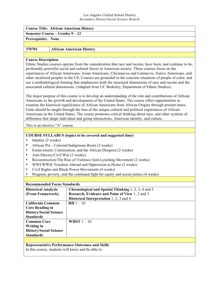Los Angeles Unified School District Secondary History/Social Science Branch Course Title: African American History Semester Course – Grades 9 – 12 Prerequisite: None 370701 African American History Course Description Ethnic Studies courses operate from the consideration that race and racism, have been, and continue to be, profoundly powerful social and cultural forces in American society. These courses focus on the experiences of African Americans, Asian Americans, Chicanas/os and Latinas/os, Native Americans, and other racialized peoples in the US. Courses are grounded in the concrete situations of people of color, and use a methodological framing that emphasizes both the structural dimensions of race and racism and the associated cultural dimensions. (Adapted from UC Berkeley, Department of Ethnic Studies). The major purpose of this course is to develop an understanding of the role and contributions of African Americans to the growth and development of the United States. The course offers opportunities to examine the historical significance of African Americans from African Origins through present times. Units should be taught through the lens of the unique cultural and political experiences of African Americans in the United States. The course promotes critical thinking about race, and other systems of difference that shape individual and group interactions, American identity, and culture. This is an elective “A” course COURSE SYLLABUS (topics to be covered and suggested time) • Identity (2 weeks) • African Pre - Colonial/Indigenous Roots (2 weeks) • Enslavement, Colonization, and the African Diaspora (2 weeks) • Anti-Slavery/Civil War (2 weeks) • Reconstruction/The Rise of Violence/Anti-Lynching Movement (2 weeks) • WWI/WWII: Freedom Abroad and Oppression at Home (2 weeks) • Civil Rights and Black Power Movements (4 weeks) • Progress, poverty, and the continued fight for equity and social justice (4 weeks) Recommended Focus Standards Historical Analysis Chronological and Spatial Thinking 1, 2, 3, 4 and 5 (From Framework) Research, Evidence and Point of View 1, 2 and 3 Historical Interpretation 1, 2, 3 and 4 California Common RH 1 – 10 Core Reading in History/Social Science Standards Common Core WHST 1 – 10 Writing in History/Social Science Standards Representative Performance Outcomes and Skills In this course, students will know and be able to: Los Angeles Unified School District Secondary History/Social Science Branch • • • • • • • • • • • • • • • • • Analyze the pre-colonial, indigenous, and ancestral roots of Africans (e.g. educational systems, social and political developments, family structures, global trade and exchange). Understand the rich history of Africans that is foundational to all of humanity and predates slavery. Examine and analyze the effects of dehumanization through the capture, trade, and enslavement of Africans, within a regional and global context. Understand the impact and legacy of colonialism on African Americans. Analyze the concept of white supremacy (including institutional racism, racial hierarchy, and oppression). Analyze the impact of enslavement on African Americans both North and South from the Revolution through the Civil War. Evaluate the successes and failures of Reconstruction through analysis of data, primary, and secondary sources. Analyze the various impacts of Booker T. Washington, W. E. B. DuBois, and Marcus Garvey on African American rights in the first decades of the 20th Century. Analyze and describe the effectiveness of the various approaches employed by different leaders of the Civil Rights and Black Power movement. Understand the role of ongoing resistance and self-determination in the trajectory of the African American community. Analyze the development of political power for women within the African American community and its relationship to changing power structures in the United States. Evaluate the evolving role of education in the African American community. Understand the roles of cultural, spiritual, social, and political practices in the evolution of Black America (e.g. music, literature, storytelling, spiritual practice, social structures). Analyze the historical, philosophical, and literary roots of hip hop as a means of political awareness and empowerment. Analyze the development of political power within the African American community and its relationship to changing power structures in the United States. What challenges continue to face African Americans? What opportunities do students have to enact positive change for African Americans? In accordance with their individual capacity, students will grow in the ability to: • • • • • • • • • • • • • Locate, interpret, and assess information found in primary and secondary sources. Describe how major historical events are related to each other in time by distinguishing between cause and effect, sequence, and correlation. Construct historical interpretations and solutions through the evaluation of different ideas, values, and behaviors. Apply the principles of historical research to the History/Social Science discipline by asking historical questions, evaluating data, and analyzing different points of view. Ask historical questions and relate different points of view. Use writing to combine ideas, concepts, and information to craft a claim and draw connections among them. Arrange historical events in sequential order and determine their correlation to each other. Identify an author’s position on a historical event. Identify and evaluate an author’s purpose in producing a document. Hypothesize what the author will say before reading a document. Evaluate the trustworthiness of a source by considering genre, audience and purpose. Understand how context and background information influence the content of a document. Recognize that documents are products of particular points in time. Los Angel