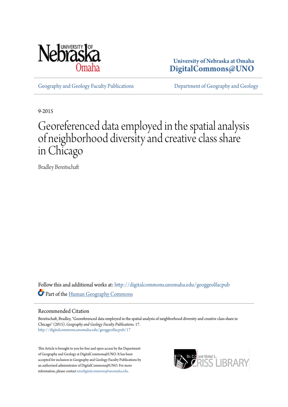 University of Nebraska at Omaha DigitalCommons@UNO Geography and Geology Faculty Publications Department of Geography and Geology 9-2015 Georeferenced data employed in the spatial analysis of neighborhood diversity and creative class share in Chicago Bradley Bereitschaft Follow this and additional works at: http://digitalcommons.unomaha.edu/geoggeolfacpub Part of the Human Geography Commons Recommended Citation Bereitschaft, Bradley, "Georeferenced data employed in the spatial analysis of neighborhood diversity and creative class share in Chicago" (2015). Geography and Geology Faculty Publications. 17. http://digitalcommons.unomaha.edu/geoggeolfacpub/17 This Article is brought to you for free and open access by the Department of Geography and Geology at DigitalCommons@UNO. It has been accepted for inclusion in Geography and Geology Faculty Publications by an authorized administrator of DigitalCommons@UNO. For more information, please contact [email protected]. Data in Brief 4 (2015) 602- 605 Contents lists available at ScienceDirect Data in Brief journal homepage: www.elsevier.com/locete/dib Georeferenced data employed in the spatial analysis of neighborhood diversity and creative class share in Chicago CtossMatk Bradley Bereitschaft•, Rex Cammack University of Nebraska at Omaha. United States ARTICLE INFO ABSTRACT Article history: Received 7 July 2015 The dataset described in this article. and made available as an accompanying spreadsheet. was used in the study entitled. •Neighborhood. diversity and the creative class in Oticago," 1D assess the spatial associations between neighborhood diversity and the aeative class at the neighborhood. (i.e., census tract) scale in Olicago [1). In this study, we found a significant positive association between the creative ~ and the proportion of gay households and income diversity, but not racial or linguistic diversity. However, a geographically-weighted regression (GWR) analysis demonstrated sub.§tantial spatial nonstationarity among these relationships. This article descnoes the creative class. diversity, and cxmtrol variables, their sources, and the methods used to calculate them "C.orrespondence to: Department of Geography/Geology, University of Nebraska at Omaha, 6001 Dodge Street. Durham Science Center 263, Omaha, NE 68182, USA. c 2015 Published by Elsevier Inc. This is an open access attide under the CC BY license (http:flaeativerommons.org/lioonsesfby/4.0n Accepted 7 July 2015 Available online 16 July 2015 Subject area Geography More specific subject area Urban geography. DOI of original artide: http:lfdx.do!.org/10.1016/j.apgeog.2015.06.020 • Correspondence to: Department of Geography/Geology, University of Nebraska at Omaha. 6001 Dodge Street. Durham Science Center 263, Omaha. NE 68182, USA. E-mail addresses: [email protected] (B. Berelt.schaft), [email protected] (R. cammack). bttp://dx.doiorg/10.1016/j.dib.2015.07.008 2352-3409/C 2015 Published by Elsevier Inc. This is an open access article under the CC BY license (http:lfcreativecommons.org{licenses/b:ff4.0/}. B. Bereitschaft. R. Cammack/ Data in Brief 4 (2015) 602-605 Type of data How data was acquired 603 Excel spreadsheet containing all creative class, diversity, and control variables for each census tract in the Chicago study area. Occupational and demographic data were obtained from the U.S. Census Bureau; land cover data from the uses; grade school rankings from the Chicago Sun Times; and transit data from the Chicago Regional Transportation Authority. Diversity variables were calculated using Simpson's index of diversity. Raw and processed. Data format Experimental factors Experimental features Data source location Data accessibility The data is with this article. Value of the data • Where the "creative class" [4] prefers to live within cities, and why, may have important implications for spatial inequality and segregation. • This dataset provides an exploration of some of the factors that might attract and "anchor" the creative class at the intra-urban scale. • Census tract-level data on neighborhood diversity, access to urban amenities, and the proportion of workers employed in specific creative class occupations in Chicago may be used in a wide variety of urban research. 1. Study area Data were georeferenced to 1983 census tracts within the city of Chicago and seven surrounding counties in northwestern Illinois: Cook (of which the City of Chicago is the county seat), Lake, McHenry, Kane, DuPage, Kendall, and Will. Data not already aggregated at the census tract level (e.g., proximity to rail stations, top schools) were georeferenced to the geographic center, or centroid, of the census tract. 2. Data collection and processing The complete dataset consists of four measures of diversity, the proportion of workers employed in five separate creative class occupational groupings, and seven urban amenity variables used as controls. Demographic, socio-economic, and occupational data used to estimate diversity and creative class occupational share by census tract were obtained from the U.S. Census Bureau (U.S. Census Bureau 2012). All census data are five-year averages (2008-2012) Table 1. Tablet List of variables included in this dataset. Diversity variables Creative class variables Control variables (amenities) % Gay households Creative class (total) Super creative core Computer, Engineering, Science Education, Library, Training Art, Design, Entertainment Median home value Proximity to 'top' grade schools Proximity to college/university Presence of open space Proximity to rail stations Proximity to 'third places' Population density Racial diversity Linguistic diversity Income diversity 604 B. Bereitschaft. R. Cammack/ Data in Brief 4 (2015) 602-605 2.1. Creative class variables Richard Florida [4,5 ] identified two major groups of creative class workers: the super creative core and creative professionals. Creative professional occupations include management, business, f