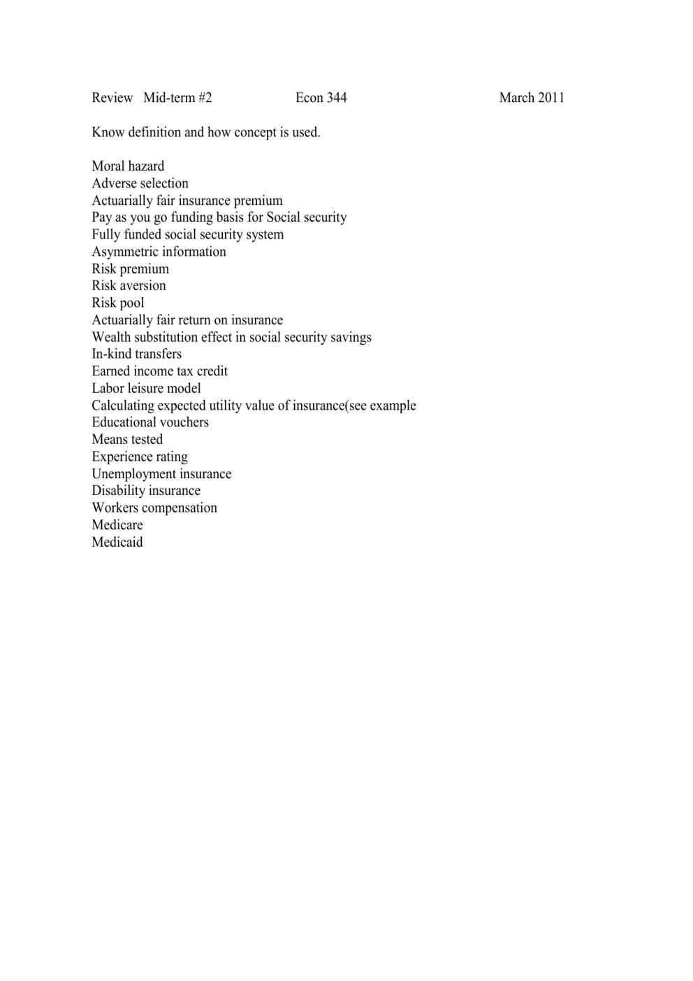 Review Mid-term #2 Econ 344 Know definition and how concept is used. Moral hazard Adverse selection Actuarially fair insurance premium Pay as you go funding basis for Social security Fully funded social security system Asymmetric information Risk premium Risk aversion Risk pool Actuarially fair return on insurance Wealth substitution effect in social security savings In-kind transfers Earned income tax credit Labor leisure model Calculating expected utility value of insurance(see example Educational vouchers Means tested Experience rating Unemployment insurance Disability insurance Workers compensation Medicare Medicaid March 2011 2.VinDiesel drives cars and is thinking about insurance. He has a 5% probability of an accident that will cost him $10,000. His utility ftn is U(I)=√I and his income is $40k • • • a. What is the expected income • c. What is the actuarially fair premium for insurance • d. What is utility of full insurance • e. What is utility of 50% partial insurance? b. what is his expected utility of not buying ins. • f. Should he insure? 1.VinDiesel drives cars and is thinking about insurance. He has a 5% probability of an accident that will cost him $10,000. His utility ftn is U(I)=√I and his income is $40k • a. EU=p*U(inc if hurt) + (1-p)U(inc.not hurt) (Expected utility is weighted average of utilities of incomes in different future states— weights are probabilities) .05*√(40000-10000) + .95* √(40000) =198.66 • • • • • b. .05*10000 + .95*0=$500 (actuarially fair premium is the premium that allows insurance company to breakeven) c. .05* √(40000-500) +.95(40000-500)=198.75 d..05* √(30000-250+5000) +.95* √(40000-250) =198.72 e. yes, full 3. Suppose that the demand for medical services can be characterized by the equation X = 500 – P/3. Suppose further that the supply of health services can be characterized by the equation X = P – 100. (A) What is the equilibrium quantity and price in the market for health services? (B) In an effort to make health services more affordable, the government restricts the price of health services to be no greater than $250. What will happen to the quantity of health services in the market? Ans: (A) Set 1,500 – 3X = 100 + X to get that X* = 350 and P* = $450. (B) At a price of $250, a shortage of health services will occur. X* will now be only 150. 4. Suppose the government introduces an income maintenance program for low-income people that offers a basic grant of $200 per month. For any earnings, the grant is reduced dollar for dollar (100% tax) a. Assume Lois can earn $10 per hour and has no other income. Sketch her monthly budget constraint with and without the program in effect. Carefully label axes, intercepts and all kink points. At how many hours of work is the grant reduced to 0? b. According to economic theory, what would happen to Lois’ hour worked and total income if the government instituted this program? c. Suppose the government decides to keep the grant of $200 but to lower the implicit tax rate to 50% (Lois can keep $.50 of each dollar she earns) Draw the new budget constraint. d. Which program provides more incentive for Lois to enter the work force? --the 50% tax plan (See diagram) 5. A voucher for housing is an example of an in-kind transfer. An individual with a monthly income of $800 receives a housing voucher for $200. a. Draw this person’s initial budget constraint for housing and all other goods. b. Illustrate how the housing voucher affects his budget constraint. c. Illustrate the cases where the voucher yields lower utility than a cash transfer and the case where utility is the same as a cash transfer. (see diagram below) 3. Suppose that a family with one child has $20,000 per year to spend on private goods and education, and further suppose that all education is privately provided. Draw this family’s budget constraint. Suppose now that an option of free public education with spending of $4,000 per pupil is introduced to this family. Draw three different indifference curves corresponding to the following three situations: (a) a free public education would increase the amount of money that is spent on the child’s education; (b) a free public education would decrease the amount of money that is spent on the child’s education; and (c) a free public education would not affect the amount of money spent on the child’s education.