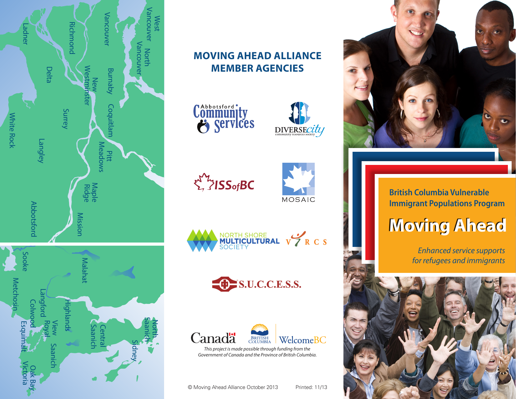 British Columbia Vulnerable Immigrant Populations Program Moving Ahead LangleyLangley Surrey Surrey New New Westminster Westminster Richmond Richmond Delta Delta Ladner Ladner White Rock White Rock Abbotsford Abbotsford Coquitlam Coquitlam Pitt Pitt VancouverBurnabyBurnaby ncouver Meadows Meadows Maple Maple Ridge Ridge MissionMission est West Vancouver North ouver North Vancouver Vancouver MOVING AHEAD ALLIANCE MEMBER AGENCIES Printed: 11/13 © Moving Ahead Alliance October 2013 Central Central SaanichSaanich Sidney Sidney North North SaanichSaanich This project is made possible through funding from the Government of Canada and the Province of British Columbia. View View SaanichSaanich Royal Royal Langford Langford Colwood Colwood Oak BayOak Sooke Sooke VictoriaVicto Esquimalt Esquimalt Metchosin Metchosin Highlands Highlands MalahatMalahat Enhanced service supports for refugees and immigrants MOVING AHEAD PROGRAM Moving Ahead is a collaborative, case-managed service model for the delivery of comprehensive, holistic and client-centred programming. The program chiefly utilizes outreach and in-home consultation and support as a foundation for service delivery to the most vulnerable refugees and immigrants in British Columbia. Moving Ahead provides eligible refugee and immigrant clients with the following services: • • • • • intake and assessment; case management of individual client files; social and emotional support; settlement information and counselling; life skills, literacy and essential skills development; • practical assistance; and • supported access to services. Eligibility includes refugees and immigrants who: • need to learn about Canadian systems; • experience complex life situations; or • have defined hardships and difficulties. Moving Ahead provides service in more than 40 languages including S’gaw and P’wo (Karen languages), Nuer and Nuba, Somali, Arabic, Assyrian, Kirundi and Kinyarwanda, Chin, Farsi, Dari, Pashto, Nepali, French, Vietnamese, Burmese, Swahili, Oromo, Amharic and Tigrinya. THE BC VIPP ALLIANCE Moving Ahead was established in 2012 by the BC Vulnerable Immigrant Populations Program (VIPP Alliance). The VIPP Alliance is comprised of seven leading refugee- and immigrant-serving organizations: • Abbotsford Community Services • DIVERSEcity Community Resources Society • Immigrant Services Society of BC • MOSAIC • North Shore Multicultural Society • S.U.C.C.E.S.S. • Victoria Immigrant and Refugee Centre Society The BC VIPP Alliance is committed to ensuring a better future for B.C.’s vulnerable newcomers. Together we are committed to implementing a cross-regional approach that will ensure vulnerable refugee and immigrant populations receive consistent levels of service regardless of their geographic location. The BC VIPP Alliance works collaboratively in the following ways: • establishing cross-regional and cross-sectoral referral protocols to facilitate more effective service delivery; • standardizing assessment and monitoring forms and processes; and • sharing cross-regional information, as well as the development of key competencies. CONTACT INFORMATION (October 1, 2012 - March 31, 2014) Abbotsford Community Services Abbotsford phone: 604-859-7544 ext 227 [email protected] www.abbotsfordcommunityservices.com DIVERSEcity Community Resources Society Surrey, Langley, North Delta phone: 604-954-4015 [email protected] www.dcrs.ca Immigrant Services Society of BC (ISS of BC) Tri-Cities, Maple Ridge phone: 778-383-1438 [email protected] www.issbc.org MOSAIC Burnaby, New Westminster phone: 604-636-4712 [email protected] www.mosaicbc.com North Shore Multicultural Society (NSMS) North Vancouver phone: Farah Yekanifard at 604-988-2931 [email protected] www.nsms.ca S.U.C.C.E.S.S. Vancouver, Richmond, South Delta phone: 604-760-5090 [email protected] www.successbc.ca Victoria Immigrant and Refugee Centre Society (VIRCS) Victoria phone: 250-361-9433 ext. 244 [email protected] www.vircs.ca