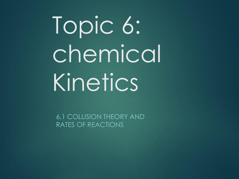 Topic 6: chemical Kinetics 6.1 COLLISION THEORY AND RATES OF REACTIONS Overview Major Understandings Species react as a result of collisions of sufficient energy and proper orientation. The rate of reaction is expressed as the chance in concentration of a particular reactant/product per unit time. Concentration changes in a reaction can be followed indirectly by monitoring the changes in a mass, volume, and color. Activation Energy is the minimum energy that colliding molecules need in order to have successful collisions leading to a reaction. By decreasing Ea, a catalyst increases the rate fo a chemical reaction, without itself being permanently chemically changed. We Are Here Chemical Kinetics Thermodynamics – does a reaction take place? Kinetics – how fast does a reaction proceed? Reaction rate is the change in the concentration of a reactant or a product with time (M/s). 13.1 Collision Theory Particles have to collide to react. Have to hit hard enough Things that increase this increase rate High temp – faster reaction High concentration – faster reaction Small particles = greater surface area means faster reaction Kinetics The study of reaction rates. Spontaneous reactions are reactions that will happen - but we can’t tell how fast. Diamond will spontaneously turn to graphite – eventually. Reaction mechanism- the steps by which a reaction takes place. Factors that Affect Reaction Rates 1. The Physical State of the reactants Reactants must come together to react When reactants are in different phase the reaction is limited to their area of contact Factors that Affect Reaction Rates 2. The concentration of the reactants Most chemical reactions proceed faster if the concentration of one ore more of the reactants is increased As concentration increases the frequency with which the reactant molecules collide increases, leading to increase rates Factors that Affect Reaction Rates 3. The temperature at which the reaction occurs The rates of reaction increase as the temperature increases As molecules move more rapidly they collide more frequently and also with higher energy, leading to increased reaction rates Factors that Affect Reaction Rates 4. The presence of a catalyst Catalysts are agents that increase reaction rates without being used up Enzymes act as catalysts for several biochemical reactions Reaction Rates The Rate of Reactions In simple terms, the rate of a reaction can be thought of as its speed Some reactions are very fast Some reactions are very slow Defining the Rate of Reaction The rate of reaction is: Where: [ R] [ P] Rate t t ∆[R] is change in concentration of reactants ∆[P] is change in concentration of products ∆t is change in time Units: mol dm-3 s-1 (moles per decimetre cubed per second) A [A] rate = t [B] rate = t B Reaction Rate Change in concentration (conc) of a reactant or product per unit time. conc of A at time t 2 - conc of A at time t1 Rate = t 2 - t1 [A ] t Chemical Kinetics A B [A] rate = t [A] = change in concentration of A over time period t [B] rate = t [B] = change in concentration of B over time period t Because [A] decreases with time, [A] is negative. Calculating Rates Average rates are taken over long intervals Instantaneous rates are determined by finding the slope of a line tangent to the curve at any given point because the rate can change over time C o n c e n t r a t i o n As the reaction progresses the concentration H2 goes down N2 + 3H2 → 2NH3 [H2] Time C o n c e n t r a t i o n As the reaction progresses the concentration N2 goes down 1/3 as fast N2 + 3H2 → 2NH3 [N2] [H2] Time C o n c e n t r a t i o n As the reaction progresses the concentration NH3 goes up 2/3 times N2 + 3H2 → 2NH3 [N2] [H2] [NH3] Time 12–22 12–23 Br2 (aq) + HCOOH (aq) 2Br– (aq) + 2H+ (aq) + CO2 (g) slope of tangent slope of tangent slope of tangent [Br2]final – [Br2]initial [Br2] average rate = – =– t tfinal - tinitial instantaneous rate = rate for specific instance in time 13.1 Rate Laws: An Introduction Rate Laws • Rate laws are always determined experimentally. • Reaction order is always defined in terms of reactant (not product) concentrations. • The order of a reactant is not related to the stoichiometric coefficient of the reactant in the balanced chemical equation. F2 (g) + 2ClO2 (g) 2FClO2 (g) rate = k [F2][ClO2] 1 13.2 Rate Laws Reactions are reversible. As products accumulate they can begin to turn back into reactants. Early on the rate will depend on only the amount of reactants present. We want to measure the reactants as soon as they are mixed. This is called the Initial rate method. The method of Initial Rates This method requires that a reaction be run several times. The initial concentrations of the reactants are varied. The reaction rate is measured just after the reactants are mixed. Eliminates the effect of the reverse reaction. Types of Rate Laws Differential Rate law - describes how rate depends on concentration. Integrated Rate Law - Describes how concentration depends on time. For each type of differential rate law there is an integrated rate law and vice versa. Rate laws can help us better understand reaction mechanisms. Rate Laws Rate k = n k[NO2] = rate constant n = rate order Rate Laws 12–32 Defining Rate We can define rate in terms of the disappearance of the reactant or in terms of the rate of appearance of the product. In our example [H2] t [NH3] t = 3[N2] t = -2[N2] t N2 + 3H2 2NH3 RATE LAWS: A SUMMARY 12–34 Summary of the Rate Laws The Integrated Rate Law Integrated Rate Law Expresses the reaction concentration as a function of time. Form of the equation depends on the order of the rate law (differential). Changes We will only work with n=0, 1, and 2 n Rate = [A] t Determining Rate Laws The first step is to determine the form of the rate law (especially its order). Must be determined from experimental data. For this reaction 2 N2O5 (aq) 4NO2 (aq) + O2(g) The reverse reaction won’t play a role b