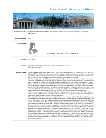 Agricultural University of Athens Institute full name: Agricultural University of Athens, Department of Natural Resources Development and Agricultural Engineering Institute acronym: AUA Institute logo: Website: www.aua.gr Address: Agricultural University of Athens Iera Odos 75, 11855 Athens, Greece Fax. +30210-5294081 Institute profile: The Agricultural University of Athens (AUA) is the third oldest University in Greece. Since 1831 as a rural school and from 1920 as a University, it has been making valuable contributions to Greek and European agricultural and economic development, by conducting basic and applied research in the agricultural sciences, and by producing high quality graduates as well as cutting edge scientific knowledge. The University is based on a 25-hectare campus that straddles both sides of the historic Iera Odos (the Sacred Avenue of antiquity), close to the Acropolis, at the heart of the ancient Olive Grove nearby the remnants of Plato’s Academy. Its buildings infrastructure comprise auditoriums, 41 fully equipped laboratories, a modern library, computer rooms, extensive applied agricultural facilities (an arboretum, vineyard, experimental fields, the Botanic garden of Athens, experimental hydraulic structures, greenhouses, alternative energy installations, animal husbandry installations, dairy installations, aquaculture tanks), museums, student center, indoor gym, and sports fields. The students are taught the principles of Applied Agricultural Sciences in ten semesters for their undergraduate Diploma, followed by M.Sc. and Ph. D. degrees offered by the Graduate School. AUA has seven departments: Agricultural Biotechnology, Agricultural Economics & Rural Development, Animal Science and Aquaculture, Crop Science, Food Science & Technology, Natural Resources Development & Agricultural Engineering and General Sciences Department. This formal learning and practical training has been and remains embedded within applied research addressing major challenges that Greece, Europe and by extension other Regions in the world are facing in the twenty-first century. In the past centuries, academic staff and graduate students firmly established Greece as well as contributed to EU added value by fostering: the distribution of arable land to landless farmers; refugee resettlement and feeding after the tragic events in the Asia Minor Greek catastrophe; early eradication of hunger in Greece by remarkably increasing farm production; initiation of export of quality agricultural products. As of the turn of the century, AUA continues to act as valued advisor to the Greek State and other national organizations, as well as to the European Commission and other European, UN and International Agencies on agricultural issues, and to conduct a wide array of advent-grade rural development projects. AUA contributions address a wide range of issues related to natural resources such as water and soil sciences, diet and environmental protection significantly affecting the daily lives of Greek and Europeans citizens: food quality and safety, water resources management, desertification mitigation, atmospheric and climate studies, irrigation and drainage engineering, biological farming, alternative energy sources, and biotechnological applications in agriculture. Involved personnel Name Contact details Key qualifications Prof. Christos A. Karavitis Tel: +30210 529 4073 [email protected] He is an Assistant Professor in Water Resources Management at the division of Water Resources Management (AUA). His areas of specialization include Integrated Water Resources Management, Decision Support Systems in Natural Resources, Drought and Flood Management, Contingency Planning and Risk Management, etc. He has participated as research leader in many research projects both in Europe and in USA Prof. Stavros Alexandris Tel: +30210 529 4078 [email protected] [email protected] He is a Lecturer at the division of Water Resources Management (AUA). His fields of interest include: Evapotranspiration, Crop Water Requirements, Experimental micrometeorology and Planning, Applications of Agrometeorology, Atmospheric radiation, Environmental monitoring systems. Prof. Kostas D. Kalabokidis Tel: +30 22510 36436 [email protected] He is an Associate Professor in the Geography of Hazards, who heads the Geography of Natural Disasters Lab (http://catastrophes.geo.aegean.gr/) at the University of the Aegean, Greece. His research interests include fire ecology and management, spatial modeling, GIS, natural disasters, human-environment relations, and applied geo-informatics. Univ. of the Aegean Dept. of Geography University Hill 81100 Mytilene Greece Branislav Todorovic, M.Sc Tel: +30210 529 4086 [email protected] [email protected] Researcher Associate in the Agricultural University of Athens (AUA) and in the National Technical University of Athens (NTUA), His background include 20 years of experience in GIS, CAD, computer control and measurement systems, programming and software development, 3D modeling and databases. Vassilia P. Fassouli, M.Sc PhD candidate in WRM Tel: +30210 529 4085 [email protected] She is a PhD Candidate in Water Resources Management in AUA, Dep. NRM&AE. She has an MSc in Environmental Management Her research interests include water resources management specifically in desertification, drought, climate change, modeling, crop – water requirements. Photo Dimitris E. Tsesmelis, M.Sc PhD candidate in WRM Tel: +30210 529 4086 [email protected] He has an MSc in Environmental Management and BSc in NRM&AE. His research interests include water resources management specifically in drought, erosion in extreme hydrological conditions, Web development and applications. Dimitris V. Stamatakos, MSc Tel: +30210529 4086 [email protected] He has an MSc in Environmental Management and BSc in NRM&AE (AUA). His research interests include water resources management specifically in drought, integrated catchment modeling, crop – wat