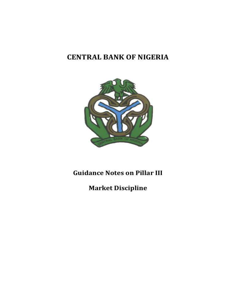 CENTRAL BANK OF NIGERIA Guidance Notes on Pillar III Market Discipline TABLE OF CONTENTS DISCLOSURE .......................................................................................................................................... 2 1.0 1.1 2.0 INTRODUCTION ........................................................................................................................ 3 General Disclosure Principle ............................................................................................. 3 Disclosure Requirements ..................................................................................................... 3 2.1 Organization of information and limitation of obligations ........................................ 3 2.2 Content and procedures for disclosing information ..................................................... 3 2.3 Disclosure eligibility requirements .................................................................................. 4 2.4 Derogations from disclosure requirements ................................................................... 4 2.5 Disclosure procedures and frequency ............................................................................. 4 2.6 Organization and controls ................................................................................................ 5 Definitions of Terms ........................................................................................................................... 6 ANNEX A .................................................................................................................................................. 7 Table 1: General requirements ................................................................................................... 7 Table 2: Scope of application ...................................................................................................... 7 Table 3: Regulatory capital structure ........................................................................................ 8 Table 4: Capital adequacy ............................................................................................................ 8 Table 5: Credit risk: general disclosures for all banks ........................................................ 10 Table 6: Credit risk: disclosures for portfolios treated under the standardized approach, specialized lending and equity exposures treated under IRB approaches .. 12 Table 7: Credit risk: disclosures for portfolios treated under IRB approaches ............ 12 Table 8: Risk mitigation techniques ........................................................................................ 15 Table 9: Counterparty risk ........................................................................................................ 16 Table 10: Securitization transactions ..................................................................................... 17 Table 11: Market risks: disclosures for banks using the internal models approach (IMA) for position risk, foreign exchange risk and commodity risk ................................ 20 Table 12: Operational risk ......................................................................................................... 21 Table 13: Equity exposures: disclosures for banking book positions .............................. 21 Table 14: Interest rate risk on positions in the banking book ........................................... 22 2 1.0 INTRODUCTION The aim of Pillar III is to promote market discipline by allowing market participants to access information on risk exposure and risk management policies and procedures through disclosures. This section sets out the disclosure requirements under the guideline with respect to procedure, frequency and content of information to be disclosed. 1.1 General Disclosure Principle Banks should have a formal disclosure policy approved by the board of directors that addresses the bank’s approach for determining what disclosures it will make and the internal controls over the disclosure process. In addition, banks should implement a process for assessing the appropriateness of their disclosures, including validation and frequency of them. (BCBS June 2006, Par 821) 2.0 DISCLOSURE REQUIREMENTS 2.1 Organization of information and limitation of obligations The information whose disclosure is governed by these regulations is listed in Annex A. 2.2 • Content and procedures for disclosing information Banks shall disclose information relating to their core activities, risks profiles and methodologies used. • In order to ensure the comprehensiveness of disclosures, references to other sources is not allowed. • Banks are expected to make adequate disclosure consistent with their organizational complexity and the type of business they engage in, taking into account their internal reporting systems to the board and management. 3 2.3 • Disclosure eligibility requirements For banks that adopt internal systems to calculate capital requirements for credit or operational risks and for those using credit risk mitigation techniques, compliance with specific disclosure requirements (Disclosure Eligibility Requirements) shall be a necessary condition for the recognition of such approach and the effects of such techniques for regulatory capital purposes. These disclosure requirements are marked by an asterisk in the annexed tables. 2.4 • Derogations from disclosure requirements Banks may omit the disclosure of information that is not considered material, with the exception of information that represents a disclosure eligibility requirement. • In exceptional cases, banks may omit the disclosure of proprietary or confidential information (including information that represents a disclosure eligibility requirement), provided that they specify the information that is not disclosed and the reasons for non-‐disclosure, and publish more general information on the matter in question. 2.