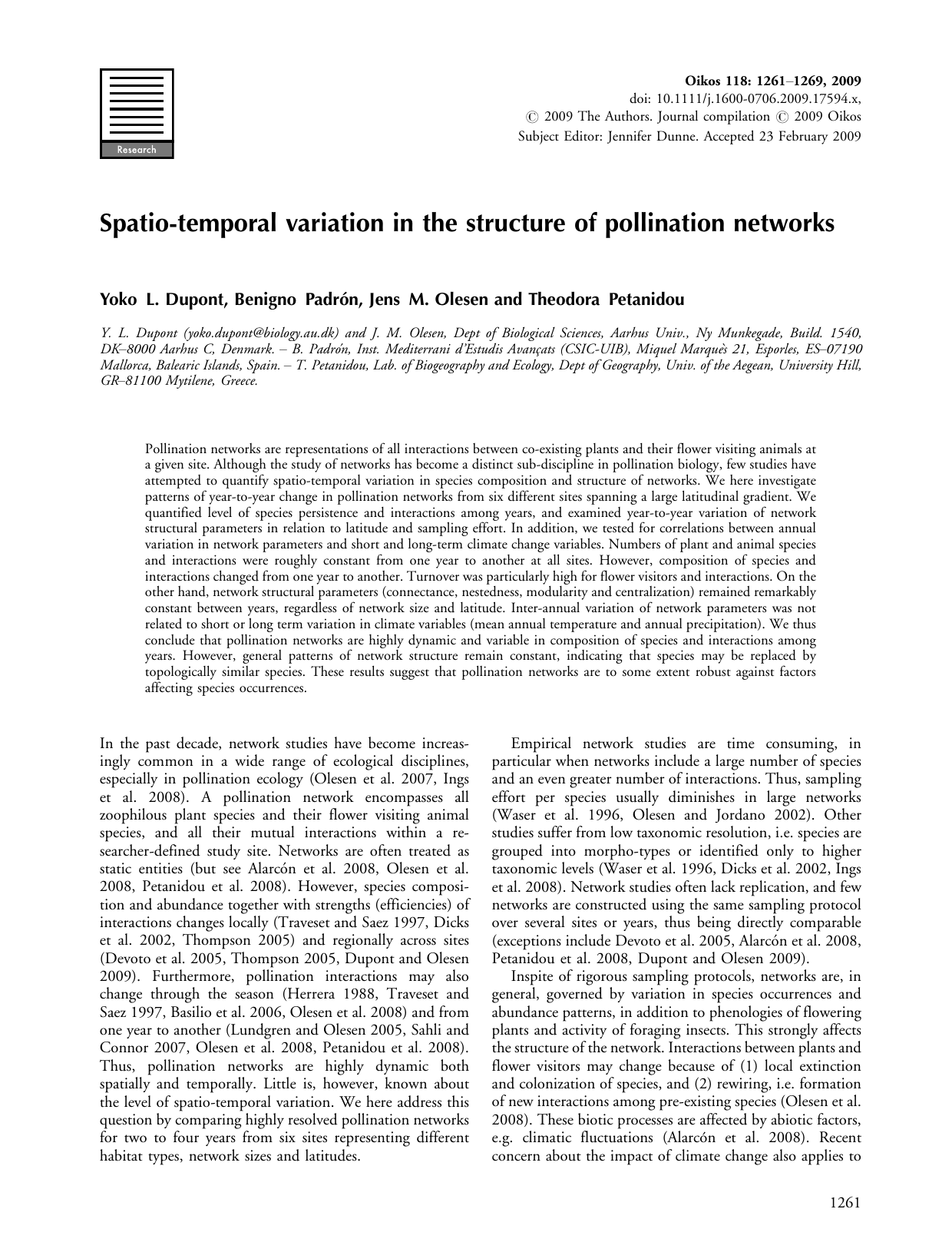 Oikos 118: 12611269, 2009 doi: 10.1111/j.1600-0706.2009.17594.x, # 2009 The Authors. Journal compilation # 2009 Oikos Subject Editor: Jennifer Dunne. Accepted 23 February 2009 Spatio-temporal variation in the structure of pollination networks Yoko L. Dupont, Benigno Padrón, Jens M. Olesen and Theodora Petanidou Y. L. Dupont ([email protected]) and J. M. Olesen, Dept of Biological Sciences, Aarhus Univ., Ny Munkegade, Build. 1540, DK8000 Aarhus C, Denmark. B. Padro´n, Inst. Mediterrani d’Estudis Avançats (CSIC-UIB), Miquel Marque`s 21, Esporles, ES07190 Mallorca, Balearic Islands, Spain. T. Petanidou, Lab. of Biogeography and Ecology, Dept of Geography, Univ. of the Aegean, University Hill, GR81100 Mytilene, Greece. Pollination networks are representations of all interactions between co-existing plants and their flower visiting animals at a given site. Although the study of networks has become a distinct sub-discipline in pollination biology, few studies have attempted to quantify spatio-temporal variation in species composition and structure of networks. We here investigate patterns of year-to-year change in pollination networks from six different sites spanning a large latitudinal gradient. We quantified level of species persistence and interactions among years, and examined year-to-year variation of network structural parameters in relation to latitude and sampling effort. In addition, we tested for correlations between annual variation in network parameters and short and long-term climate change variables. Numbers of plant and animal species and interactions were roughly constant from one year to another at all sites. However, composition of species and interactions changed from one year to another. Turnover was particularly high for flower visitors and interactions. On the other hand, network structural parameters (connectance, nestedness, modularity and centralization) remained remarkably constant between years, regardless of network size and latitude. Inter-annual variation of network parameters was not related to short or long term variation in climate variables (mean annual temperature and annual precipitation). We thus conclude that pollination networks are highly dynamic and variable in composition of species and interactions among years. However, general patterns of network structure remain constant, indicating that species may be replaced by topologically similar species. These results suggest that pollination networks are to some extent robust against factors affecting species occurrences. In the past decade, network studies have become increasingly common in a wide range of ecological disciplines, especially in pollination ecology (Olesen et al. 2007, Ings et al. 2008). A pollination network encompasses all zoophilous plant species and their flower visiting animal species, and all their mutual interactions within a researcher-defined study site. Networks are often treated as static entities (but see Alarcón et al. 2008, Olesen et al. 2008, Petanidou et al. 2008). However, species composition and abundance together with strengths (efficiencies) of interactions changes locally (Traveset and Saez 1997, Dicks et al. 2002, Thompson 2005) and regionally across sites (Devoto et al. 2005, Thompson 2005, Dupont and Olesen 2009). Furthermore, pollination interactions may also change through the season (Herrera 1988, Traveset and Saez 1997, Basilio et al. 2006, Olesen et al. 2008) and from one year to another (Lundgren and Olesen 2005, Sahli and Connor 2007, Olesen et al. 2008, Petanidou et al. 2008). Thus, pollination networks are highly dynamic both spatially and temporally. Little is, however, known about the level of spatio-temporal variation. We here address this question by comparing highly resolved pollination networks for two to four years from six sites representing different habitat types, network sizes and latitudes. Empirical network studies are time consuming, in particular when networks include a large number of species and an even greater number of interactions. Thus, sampling effort per species usually diminishes in large networks (Waser et al. 1996, Olesen and Jordano 2002). Other studies suffer from low taxonomic resolution, i.e. species are grouped into morpho-types or identified only to higher taxonomic levels (Waser et al. 1996, Dicks et al. 2002, Ings et al. 2008). Network studies often lack replication, and few networks are constructed using the same sampling protocol over several sites or years, thus being directly comparable (exceptions include Devoto et al. 2005, Alarcón et al. 2008, Petanidou et al. 2008, Dupont and Olesen 2009). Inspite of rigorous sampling protocols, networks are, in general, governed by variation in species occurrences and abundance patterns, in addition to phenologies of flowering plants and activity of foraging insects. This strongly affects the structure of the network. Interactions between plants and flower visitors may change because of (1) local extinction and colonization of species, and (2) rewiring, i.e. formation of new interactions among pre-existing species (Olesen et al. 2008). These biotic processes are affected by abiotic factors, e.g. climatic fluctuations (Alarcón et al. 2008). Recent concern about the impact of climate change also applies to 1261 mutualistic networks (Memmott et al. 2007, Tylianakis et al. 2008). In the high arctic, which is exposed to the highest level of global warming, a recent study documented a rapid advancement of phenologies in various taxa (flowering, insect emergence, and egg laying in birds), some by up to 30 days during the last decade (Høye et al. 2007). If plant and flower visitor species respond differently to climate change, phenological shifts may result in flower visitor species suffering shortage of floral reward supplies (i.e. none of its food plants are blooming) during part of its activity period (Memmott et al. 2007, Tylianakis et al. 2008, Hegland et al. 2009). Similarly, 