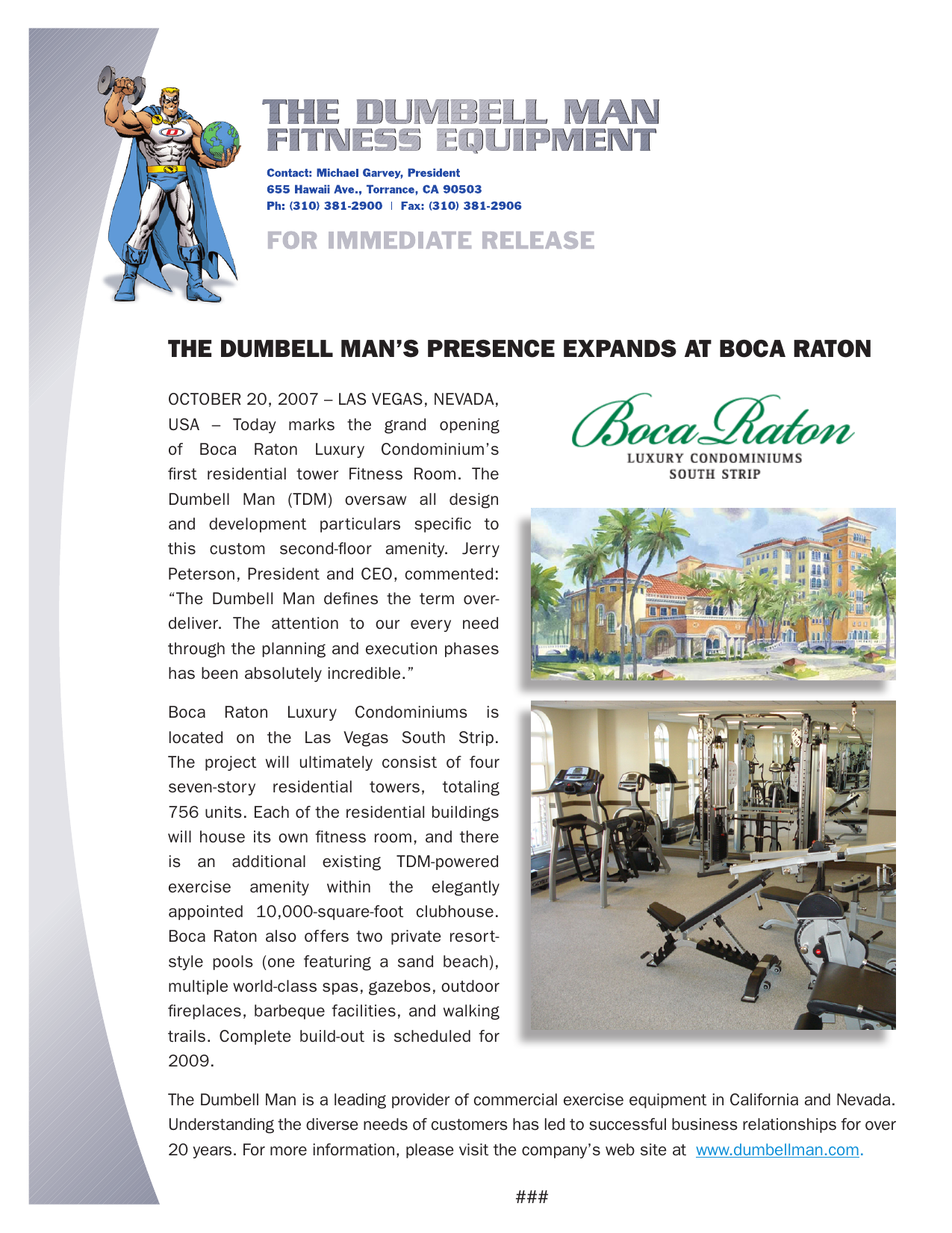 The Dumbell Man’s Presence Expands at Boca Raton October 20, 2007 – Las Vegas, Nevada, USA – Today marks the grand opening of Boca Raton Luxur y Condominium’s first residential tower Fitness Room. The Dumbell Man (TDM) oversaw all design and development particulars specific to this custom second-floor amenity. Jerr y Peterson, President and CEO, commented: “The Dumbell Man defines the term overdeliver. The attention to our ever y need through the planning and execution phases has been absolutely incredible.” Boca Raton Luxur y Condominiums is located on the Las Vegas South Strip. The project will ultimately consist of four seven-stor y residential towers, totaling 756 units. Each of the residential buildings will house its own fitness room, and there is an additional existing TDM-powered exercise amenity within the elegantly appointed 10,000-square-foot clubhouse. Boca Raton also offers two private resortstyle pools (one featuring a sand beach), multiple world-class spas, gazebos, outdoor fireplaces, barbeque facilities, and walking trails. Complete build-out is scheduled for 2009. The Dumbell Man is a leading provider of commercial exercise equipment in California and Nevada. Understanding the diverse needs of customers has led to successful business relationships for over 20 years. For more information, please visit the company’s web site at www.dumbellman.com. ###
