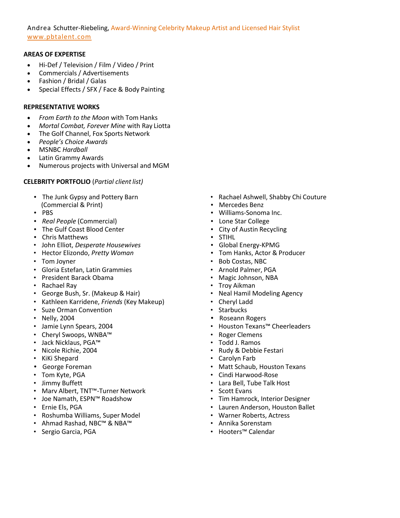 Andrea Schutter-Riebeling, Award-Winning Celebrity Makeup Artist and Licensed Hair Stylist www.pbtalent.com AREAS OF EXPERTISE Hi-Def / Television / Film / Video / Print Commercials / Advertisements Fashion / Bridal / Galas Special Effects / SFX / Face & Body Painting REPRESENTATIVE WORKS From Earth to the Moon with Tom Hanks Mortal Combat, Forever Mine with Ray Liotta The Golf Channel, Fox Sports Network People’s Choice Awards MSNBC Hardball Latin Grammy Awards Numerous projects with Universal and MGM CELEBRITY PORTFOLIO (Partial client list) The Junk Gypsy and Pottery Barn • • • • • • • • • • • • • • • • • • • • • • • (Commercial & Print) PBS Real People (Commercial) The Gulf Coast Blood Center Chris Matthews John Elliot, Desperate Housewives Hector Elizondo, Pretty Woman Tom Joyner Gloria Estefan, Latin Grammies President Barack Obama Rachael Ray George Bush, Sr. (Makeup & Hair) Kathleen Karridene, Friends (Key Makeup) Suze Orman Convention Nelly, 2004 Jamie Lynn Spears, 2004 Cheryl Swoops, WNBA™ Jack Nicklaus, PGA™ Nicole Richie, 2004 KiKi Shepard George Foreman Tom Kyte, PGA Jimmy Buffett Marv Albert, TNT™-Turner Network Joe Namath, ESPN™ Roadshow Ernie Els, PGA Roshumba Williams, Super Model Ahmad Rashad, NBC™ & NBA™ Sergio Garcia, PGA • Rachael Ashwell, Shabby Chi Couture Mercedes Benz Williams-Sonoma Inc. Lone Star College City of Austin Recycling STIHL Global Energy-KPMG Tom Hanks, Actor & Producer • Bob Costas, NBC • Arnold Palmer, PGA • Magic Johnson, NBA • Troy Aikman • Neal Hamil Modeling Agency • Cheryl Ladd • Starbucks Roseann Rogers • Houston Texans™ Cheerleaders • Roger Clemens • Todd J. Ramos • Rudy & Debbie Festari • Carolyn Farb • Matt Schaub, Houston Texans • Cindi Harwood-Rose • Lara Bell, Tube Talk Host • Scott Evans • Tim Hamrock, Interior Designer • Lauren Anderson, Houston Ballet • Warner Roberts, Actress • Annika Sorenstam • Hooters™ Calendar INDUSTRY EXPERIENCE Makeup Artist / Licensed Hair Stylist / Owner Fabulous and Flawless, Houston, Texas –2000 to 2014 Managed business operations and creative services for this unique studio featuring hair and makeup services for special events, bridal, galas, corporate photo shoots, commercials, film and television. The studio featured hard-to-find products, designed by professional makeup artists for special offering to the studio’s clientele. Directed a creative staff of licensed hairdressers and professionally trained award-winning makeup artists. Additionally conducted makeup lessons, beauty consultations and workshops. Key Makeup Artist Film / Television Production Companies, Los Angeles, California and Orlando, Florida –1997 to 2000 Worked on contract basis with several major production studios and networks. Managed all aspects of makeup department for several films, including pre-production planning, hiring additional team members, staff scheduling, and supervision during production. Defined technical aspects of makeup requirements in pre-production stage by analyzing scenes of scripts. Collaborated with key hair designer, costume designer, set designer and director of lighting throughout production to ensure attainment of creative requirements, industry standards and deadlines. Traveled to production sites and remained on locations for duration of production. Additionally, provided makeup artistry to photography shoots and video studio productions for short- term projects, both individually and as member of artistic team. Image Consultant / Key Makeup Artist The Golf Channel / Fox Sports, Orlando, Florida – 1995 to 1997 Provided makeup artistry, hair styling and wardrobe selection for on-air commentators for Golf Talk Live, Gold Academy and Golf Central, as well as guest celebrities. Worked with nearly every ADDITIONAL EXPERIENCE Marketing Representative Lancôme, Prescriptives, Revlon and Bobbi Brown Cosmetics / Luminess Air, Florida, Texas & nationwide Represented Lancôme Cosmetics for 3 years; Revlon for 2 years and Chanel for 1 year in various capacities. Traveled as a member of the national team with Estee Lauder-Prescriptives Cosmetics for 4 years. Part of team that launched Bobbi Brown cosmetic line at Neiman Marcus. Created marketing campaigns for Luminess Air to include photo shoots, TV info commercials and training / selling tools. Member of their national team for 3 years. CREDENTIALS / AFFILIATIONS Joe Blasco Make-Up Artist Training Center, Orlando, Florida (1993) – Completed in-depth program sanctioned by International Alliance of Theatrical Stage Employees (IATSE). A New York 798 Union-Tested Makeup Artist ADDY Award for a Special Effect Video Licensed Hairstylist Memberships – Women in Networking (Board Member); Fashion Group International (Board Member); IATSE Make-up Artists and Hairstylists Guild Link to The Junk Gypsy for PBteen: http://www.youtube.com/watch?v=wX4I1HNOKsc&sns=em BIO Andrea has an extensive list of credits in television, movies, video, advertising, and fashion industries. Her 25+ years of experience include pre-production planning, television appearances, special events, galas, weddings, fashion commercials, print advertisements, and direction of artistic staff. Her services include on-set touchups and complete hair and makeup for television and film productions. Andrea has extensive experience as a key makeup artist and assistant and is able to maintain continuity through detailed character photos and logs. Her work in special effects has garnered her several awards. As a seasoned professional, she collaborates with the full spectrum of the creative team to achieve desired outcomes. Not only is she valued for her artistic talents but also for her ability to keep the project moving forward. Andrea’s clients have included members of the political, corporate and entertainment A-list. Her superior ability to manage “difficult” situations and personalities wi