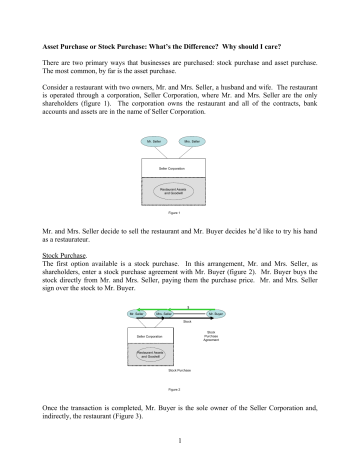 Asset Purchase or Stock Purchase: What’s the Difference? Why should I care? There are two primary ways that businesses are purchased: stock purchase and asset purchase. The most common, by far is the asset purchase. Consider a restaurant with two owners, Mr. and Mrs. Seller, a husband and wife. The restaurant is operated through a corporation, Seller Corporation, where Mr. and Mrs. Seller are the only shareholders (figure 1). The corporation owns the restaurant and all of the contracts, bank accounts and assets are in the name of Seller Corporation. Mr. Seller Mrs. Seller Seller Corporation Restaurant Assets and Goodwill Figure 1 Mr. and Mrs. Seller decide to sell the restaurant and Mr. Buyer decides he’d like to try his hand as a restaurateur. Stock Purchase. The first option available is a stock purchase. In this arrangement, Mr. and Mrs. Seller, as shareholders, enter a stock purchase agreement with Mr. Buyer (figure 2). Mr. Buyer buys the stock directly from Mr. and Mrs. Seller, paying them the purchase price. Mr. and Mrs. Seller sign over the stock to Mr. Buyer. $ Mr. Seller Mrs. Seller Mr. Buyer Stock Stock Purchase Agreement Seller Corporation Restaurant Assets and Goodwill Stock Purchase Figure 2 Once the transaction is completed, Mr. Buyer is the sole owner of the Seller Corporation and, indirectly, the restaurant (Figure 3). 1 The tax situation with a stock sale is straight forward. Mr. and Mrs. Seller pay tax on the “gain” they receive (basically, the profit) at capital gains tax rates, usually fifteen percent (15%). Mr. Seller Mrs. Seller $ $ Mr. Buyer Seller Corporation Restaurant Assets and Goodwill Stock Purchase Figure 3 Stock purchase transactions work well where there are multiple owners and one wants out. For example, a few years ago, two men who owned a technology consulting business used a stock purchase to amicably part ways. These owners had built a successful company with multiple consultants calling on customers throughout the Orlando metropolitan area. One was the outside sales person and the other the inside administrative partner. They began to have disagreements over the amount of work each was doing and the management of the company. One wanted the other to be in the office and the other wanted to be selling to new accounts. But, even though the owners weren’t getting along, the company itself had a good reputation, healthy client base and distinctive name. So, rather than start from scratch, one owner agreed to buy the stock of the other. This allowed the purchaser to continue the business, benefit from the goodwill with the customers and avoid any competition from the seller. The seller was able to get money for his new non-competing business. Asset Purchase. The second and most common method is the asset purchase. With this arrangement, the corporation owned by Mr. and Mrs. Seller sells all of its assets to a corporation owned by Mr. Buyer (we’ll call this “Buyer Corporation”) (Figure 4). All or, in most cases, a portion of the purchase price (the down payment) is put into the Buyer Corporation’s bank account by Mr. Buyer. Then, Buyer Corporation writes a check to the corporation owned by Mr. and Mrs. Seller, the Seller Corporation. In turn, the Seller 2 Corporation transfers its assets to the Buyer Corporation. And, finally, Seller Corporation distributes the money it receives to Mr. and Mrs. Seller. Usually, these assets include all of the furniture, fixtures and equipment (also known as “FF&E”) of Seller Corporation, its business name and goodwill. Buyer Corporation also assumes all or a portion of Seller Corporation’s contracts and liabilities, including, the lease for Seller Corporation’s store or offices. Mr. Seller $ Mrs. Seller Mr. Buyer (Optional) $ $ Seller Corporation Asset Purchase Agreement Buyer Corporation Restaurant Assets and Goodwill Asset Purchase Figure 4 When the asset purchase is complete, the business and assets are owned by Buyer Corporation and the Seller Corporation either has the cash from the purchase price or, most often, the cash and a promissory note from Buyer Corporation (Figure 5). The note represents the seller financing of the purchase by Seller Corporation and its shareholders. Mr. Seller Mrs. Seller Mr. Buyer Seller Corporation Buyer Corporation Cash and Promissory Note from Buyer Corporation Restaurant Assets and Goodwill Asset Purchase Figure 5 The tax situation for Mr. and Mrs. Seller with an asset purchase transaction is a bit more complicated. It depends on whether Seller Corporation is taxed as a “C” corporation or an “S” corporation, the profits of Seller Corporation to date, and the value of the FF&E and amount of depreciation taken. 3 If Seller Corporation is a “C” corporation, then Seller Corporation pays taxes on the gain from the sale of the assets. Then when Seller Corporation pays a dividend to Mr. and Mrs. Seller, they include their dividend as income on their tax return. As a result, the income is taxed twice, once to the corporation and then again to the shareholder when they receive the proceeds. The tax rates vary, but the combined rate is greater than the 15% capital gains rate paid in the stock purchase transaction. If Seller Corporation is a “S” corporation, then Mr. and Mrs. Seller pay taxes on the Seller Corporation’s gain and profits. Unlike the “C” corporation, this income is taxed only once, to Mr. and Mrs. Seller. The tax rates vary based on the factors listed above. But, a portion of the income will probably be taxed at the higher ordinary income rates (up to 35%) and the overall tax rate will be more than the capital gains rate of 15% used for the stock purchase. In short, the tax advantages of a stock sale benefit the seller. Why an Asset Sale? So, why are small business sales almost always structures as asset sales? The two most important reasons that buyers purchase only the assets of the business are: • Liabilities. • Depreciation. L
