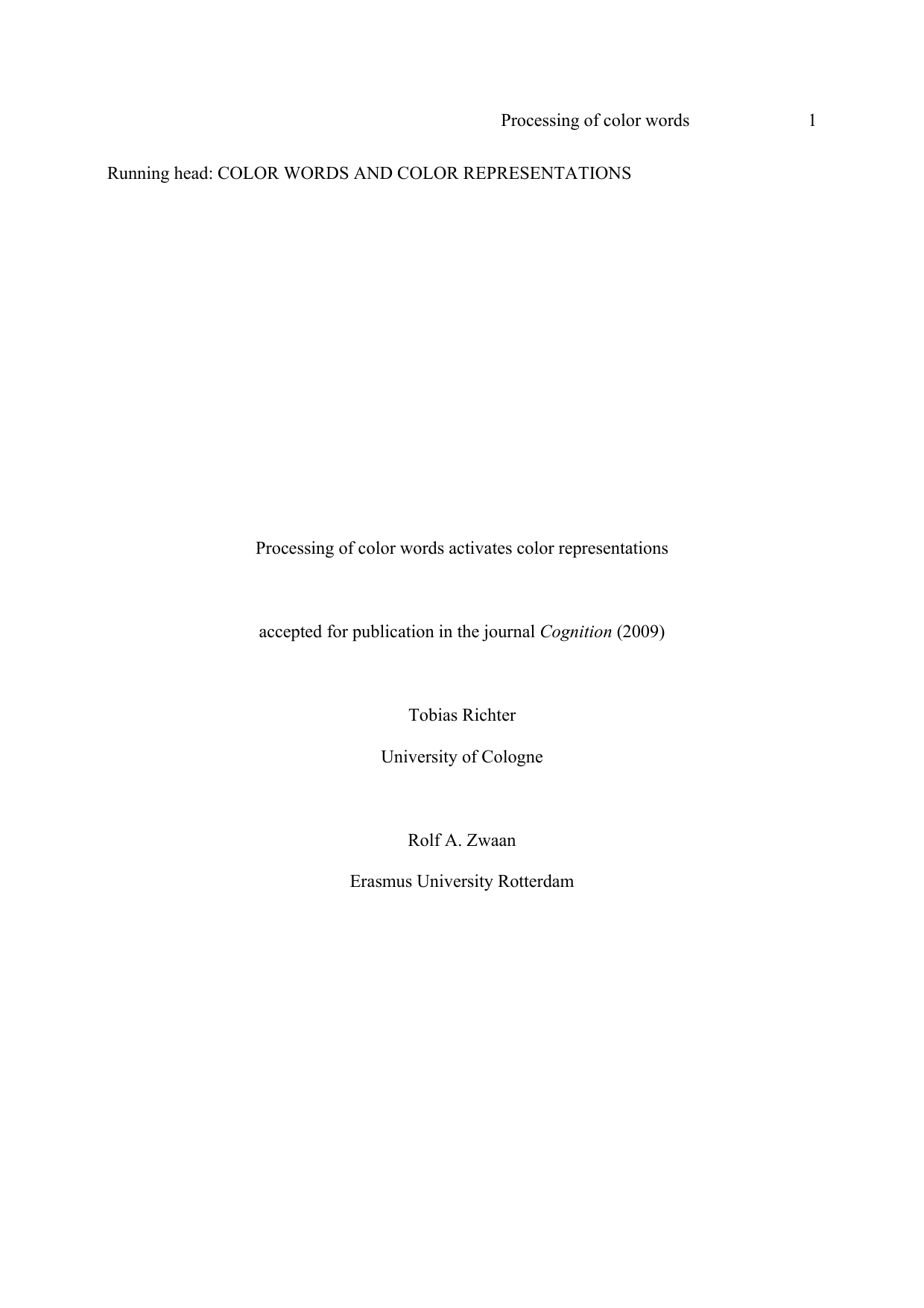Processing of color words Running head: COLOR WORDS AND COLOR REPRESENTATIONS Processing of color words activates color representations accepted for publication in the journal Cognition (2009) Tobias Richter University of Cologne Rolf A. Zwaan Erasmus University Rotterdam 1 Processing of color words Abstract Two experiments were conducted to investigate whether color representations are routinely activated when color words are processed. Congruency effects of colors and color words were observed in both directions. Lexical decisions on color words were faster when preceding colors matched the color named by the word. Color-discrimination responses were slowed down when preceding color words mismatched the test color even if no task had to be performed on these words. These findings are consistent with the experiential view of language comprehension according to which color perception and the comprehension of color words are based on overlapping representational resources. Key words: Color – embodied cognition –experiential view – language comprehension – Stroop effect. 2 Processing of color words 3 Processing of color words activates color representations The emerging experiential view of language comprehension assumes that the representations underlying language comprehension are of the same kind as the representations involved in sensory experiences and perceptions (e.g., Barsalou, 1999; MacWhinney, 1999; Zwaan, 2004) rather than amodal symbolic representations such as propositions. According to the experiential view, individuals understand language by engaging in a perceptual simulation of the objects and events described in a linguistic expression. In support of this general claim, a number of experiments have demonstrated that perceptual information such as shape (e.g., Zwaan, Stanfield, & Yaxley, 2002), motion (e.g., Meteyard, Bahrami, & Vigliocco, 2007; Zwaan, Madden, Yaxley, & Aveyard, 2004) or orientation (Stanfield & Zwaan, 2001) is routinely activated when words or sentences are processed that explicitly or implicitly convey this information (see Zwaan, 2004, for an overview). In contrast to spatial and shape characteristics, the role of color information in language comprehension has received little attention, with the exception of Connell (2007). The goal of the present research was to fill this gap by investigating the role of color representations in the comprehension of color words. The experiential view implies that color representations are activated whenever specific colors or objects with typical colors are mentioned in a linguistic expression. For example, words that denote color-diagnostic objects (Tanaka, Weiskopf, & Williams, 2001) as well as color words themselves should routinely activate color representations akin or identical to those that are involved in color perception. Previous neuroimaging and behavioral studies on the relationship of color and word processing do not provide a clear picture on this issue. For example, a study by Chao and Martin (1999) based on positron emission tomography failed to provide evidence for the assumption that providing color names for achromatic objects – a task requiring conceptual processing of color information – involves the same cortical regions that Processing of color words 4 subserve color perception. The regions activated by generating color names were located in the left parietal cortex (left inferior temporal, left frontal, and left posterior parietal cortex) and in the left fusiform gyrus but lateral to the occipital regions that are activated in color perception. In contrast, a recent fMRI study by Simmons and coworkers provided support for the assumption of the experiential view that color perception and conceptual processes involving color information are based on the same neural substrate (Simmons, Ramjee, Beauchamp, McRae, Martin, & Barsalou, 2007). In this study, a property verification task with linguistic stimuli (object and color words) activated a region of the left fusiform gyrus that was also active in color perception. However, the property-verification task used by Simmons et al. likely involves strategic imagerybased responses. For this reason, it is not clear whether their results extend to routine language processing. The only previous study with behavioral data on the topic (Connell, 2007) yielded results are difficult to interpret theoretically. Connell presented sentences that implied a specific color and measured latencies in a subsequent object recognition task. In contrast to the present experiments and similar experiments on other perceptual properties (e.g., Zwaan et al., 2002), she observed faster responses for pictures in a color that mismatched the color implied by the sentence. Thus, to date, there is just one neuroimaging study providing evidence for overlapping representational resources of colors and color words whereas direct behavioral evidence is still lacking. Even the extensive literature on the Stroop effect (Stroop, 1935) with hundreds of experiments on the relationship between color and word processing provides only sparse information on the issue. The reason is that most researchers have concentrated on response conflicts as the explanation for the Stroop effect (e.g., Posner & Snyder, 1975; Cohen & Huston, 1994). Accordingly, the vast majority of experiments in this area made no attempt to dissociate effects on the response level from those at the representational level, with the result that both Processing of color words 5 potential sources of facilitation or interference are confounded. Nevertheless, some experiments provide indirect evidence for the assumptions of the experiential view. For example, not only color words but also words denoting color-diagnostic objects have found to produce interference with color naming, with stronger interference effects for words that denote objects with higher color diagnosticity (e.g., Klein, 1964; Scheibe, Shaver, & Car