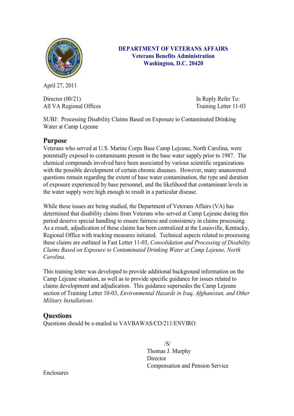 DEPARTMENT OF VETERANS AFFAIRS Veterans Benefits Administration Washington, D.C. 20420 April 27, 2011 Director (00/21) All VA Regional Offices In Reply Refer To: Training Letter 11-03 SUBJ: Processing Disability Claims Based on Exposure to Contaminated Drinking Water at Camp Lejeune Purpose Veterans who served at U.S. Marine Corps Base Camp Lejeune, North Carolina, were potentially exposed to contaminants present in the base water supply prior to 1987. The chemical compounds involved have been associated by various scientific organizations with the possible development of certain chronic diseases. However, many unanswered questions remain regarding the extent of base water contamination, the type and duration of exposure experienced by base personnel, and the likelihood that contaminant levels in the water supply were high enough to result in a particular disease. While these issues are being studied, the Department of Veterans Affairs (VA) has determined that disability claims from Veterans who served at Camp Lejeune during this period deserve special handling to ensure fairness and consistency in claims processing. As a result, adjudication of these claims has been centralized at the Louisville, Kentucky, Regional Office with tracking measures initiated. Technical aspects related to processing these claims are outlined in Fast Letter 11-03, Consolidation and Processing of Disability Claims Based on Exposure to Contaminated Drinking Water at Camp Lejeune, North Carolina. This training letter was developed to provide additional background information on the Camp Lejeune situation, as well as to provide specific guidance for issues related to claims development and adjudication. This guidance supersedes the Camp Lejeune section of Training Letter 10-03, Environmental Hazards in Iraq, Afghanistan, and Other Military Installations. Questions Questions should be e-mailed to VAVBAWAS/CO/211/ENVIRO. /S/ Thomas J. Murphy Director Compensation and Pension Service Enclosures Processing Disability Claims Based on Exposure to Contaminated Drinking Water at Camp Lejeune I. Background United States Marine Corps Base Camp Lejeune, NC, was established in 1941. In the early 1980s, it was discovered that two on-base water-supply systems were contaminated with the volatile organic compounds (VOCs) trichloroethylene (TCE), a metal degreaser, and perchloroethylene (PCE), a dry cleaning agent. The main source of TCE contamination was on-base industrial activities, while the main source of PCE was an offbase dry cleaning facility. Benzene, vinyl chloride, and other VOCs were also found to be contaminating the water-supply systems. These water systems served housing, administrative, and recreational facilities, as well as the base hospital. Department of the Navy estimates indicate that as many as 630,000 active duty personnel may have been exposed. The contaminated wells supplying the water systems were identified and shut down by February 1985. The Agency for Toxic Substances and Disease Registry (ATSDR), a branch of the Department of Health and Human Services, conducted a Public Health Assessment of Camp Lejeune in 1997, which did not determine whether base personnel experienced any long-term health effects from consumption of the contaminated water. However, the assessment indicated that the drinking water contaminants at Camp Lejeune created a “past public health hazard.” Follow up studies by ATSDR focused on potential birth defects experienced by mothers exposed to the drinking water. In 2008, as public awarness of Camp Lejeune increased, the Navy sent an informational outreach letter to those individuals who could be identified as having served there between 1957 and 1987. Apparently, the Navy felt that including individuals serving until 1987 would cover potential exposure from any residual contaminants present in the water beyond the well closings in 1985. The letter notified these former service members that “unregulated chemicals were discoved in some of the base drinking water systems” and encouraged them to participate in a registry so as to receive information from new health-related scientific studies initiated by the Navy. These studies involved the National Academy of Sciences’ National Research Council (NRC) and ATSDR. Based on a congressional mandate, the Navy requested that NRC undertake a study to assess the potential long-term health effects for individuals who served at Camp Lejeune during the period of water contamination. In the resulting report, Contaminated Water Supplies at Camp Lejeune, Assessing Potential Health Effects (June 2009), NRC reviewed previous work done by ATSDR, including computerized water flow modeling, and concluded that additional studies may not produce definitive results because of the difficulties inherent in attempting to reconstruct past events and determine the amount of exposure experienced by any given individual. To address potential long-term health effects, NRC focused on diseases associated with TCE, PCE, and other VOCs. Based on analyses of scientific studies involving these chemicals, NRC provided an assessment of the potential association between certain diseases and exposure to the chemical contaminants. 2 The NRC analysis utilized categories of potential disease “health outcomes.” The categories included: (1) sufficient evidence of a causal relationship; (2) sufficient evidence of an association; (3) limited/suggestive evidence of an association; (4) inadequate/insufficient evidence to determine whether an association exists; and (5) limited suggestive evidence of no association. The analysis found that no diseases fell into the categories of sufficient evidence of a causal relationship or sufficient evidence of an association with the chemical contaminants. However, fourteen diseases were placed into the category of limited/suggestive evidence of an association. A number of diseases were also identified that fell into the category of
