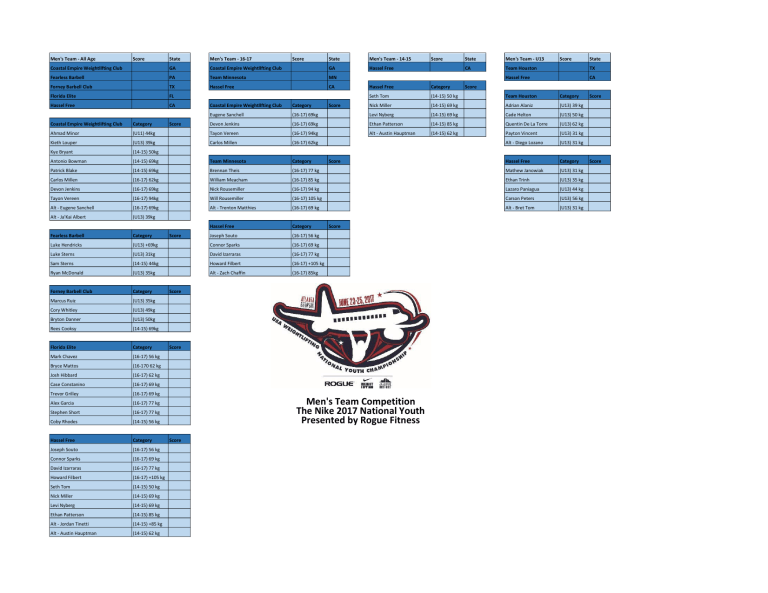 Men's Team - All Age State Men's Team - 16-17 State Men's Team - 14-15 Coastal Empire Weightllfting Club GA Coastal Empire Weightllfting Club GA Hassel Free Fearless Barbell PA Team Minnesota MN Forney Barbell Club TX Hassel Free CA Florida Elite FL Hassel Free CA Coastal Empire Weightlifting Club Score Category Score Score State Men's Team - U13 CA Team Houston Score TX Hassel Free CA Hassel Free Category Seth Tom (14-15) 50 kg Team Houston Category Nick Miller (14-15) 69 kg Adrian Alaniz (U13) 39 kg Category Eugene Sanchell (16-17) 69kg Levi Nyberg (14-15) 69 kg Cade Helton (U13) 50 kg Devon Jenkins (16-17) 69kg Ethan Patterson (14-15) 85 kg Quentin De La Torre (U13) 62 kg Alt - Austin Hauptman (14-15) 62 kg (U11) 44kg Tayon Vereen (16-17) 94kg Kieth Louper (U13) 39kg Carlos Millen (16-17) 62kg Kye Bryant (14-15) 50kg Payton Vincent (U13) 31 kg Alt - Diego Lozano (U13) 31 kg Antonio Bowman (14-15) 69kg Team Minnesota Category Hassel Free Category Patrick Blake (14-15) 69kg Brennan Theis (16-17) 77 kg Mathew Janowiak (U13) 31 kg Carlos Millen (16-17) 62kg William Meacham (16-17) 85 kg Ethan Trinh (U13) 35 kg Devon Jenkins (16-17) 69kg Nick Rousemiller (16-17) 94 kg Lazaro Paniagua (U13) 44 kg Tayon Vereen (16-17) 94kg Will Rousemiller (16-17) 105 kg Carson Peters (U13) 56 kg Alt - Eugene Sanchell (16-17) 69kg Alt - Trenton Matthies (16-17) 69 kg Alt - Bret Tom (U13) 31 kg Alt - Ja'Kai Albert (U13) 39kg Hassel Free Category Fearless Barbell Category Joseph Souto (16-17) 56 kg Score Luke Hendricks (U13) +69kg Connor Sparks (16-17) 69 kg Luke Sterns (U13) 31kg David Izarraras (16-17) 77 kg Sam Sterns (14-15) 44kg Howard Filbert (16-17) +105 kg Ryan McDonald (U13) 35kg Alt - Zach Chaffin (16-17) 85kg Forney Barbell Club Category Marcus Ruiz (U13) 35kg Cory Whitley (U13) 49kg Bryton Danner (U13) 50kg Rees Cooksy (14-15) 69kg Florida Elite Category Mark Chavez (16-17) 56 kg Bryce Mattos (16-170 62 kg Josh Hibbard (16-17) 62 kg Case Constanino (16-17) 69 kg Trevor Grilley (16-17) 69 kg Alex Garcia (16-17) 77 kg Stephen Short (16-17) 77 kg Coby Rhodes (14-15) 56 kg Hassel Free Category Joseph Souto (16-17) 56 kg Connor Sparks (16-17) 69 kg David Izarraras (16-17) 77 kg Howard Filbert (16-17) +105 kg Seth Tom (14-15) 50 kg Nick Miller (14-15) 69 kg Levi Nyberg (14-15) 69 kg Ethan Patterson (14-15) 85 kg Alt - Jordan Tinetti (14-15) +85 kg Alt - Austin Hauptman (14-15) 62 kg Score Score Score Score Men's Team Competition The Nike 2017 National Youth Presented by Rogue Fitness Score State Score Coastal Empire Weightllfting Club Ahmad Minor Score Score Score Score Women's Team - All Age State Women's Team - 16-17 State Women's Team - 14-15 Coastal Empire Weightllfting Club Score GA Team Minnesota MN AMP Training AMP Training FL Hassle Free CA Bear Canyon Crossfit NM Florida Elite FL Team Minnesota Hassle Free CA Ellie Stodden (16-17) 58 kg Marr-Khie Desvarieux (14-15) +69kg East Coast Gold WL Category Libertie Ryan (16-17) 63 kg Gabriella Swajanen (14-15) 53kg Xyliak Rodriguez (U13) 31kg (U13) +58KG Category Score Score AMP Training Category Kiara Akuna (14-15) 48kg State Women's Team - U13 FL East Coast Gold WL PA Calavera Barbell NV Hassle Free CA Score Score Coastal Empire Weightlifting Club Category Alexandra Becker (16-17) 75 kg Nicole Neubeuer A'lyah Bowman (U11) 44kg Taz'ana Jackson (16-17) 69 kg Kiele Swistak (U13) 35kg Kaiya Bryant (U13) 44kg Alt - Skylar Mielke (16-17) 58 kg Allison Shurak (U13) 39kg Alt - Eliana Barnett (U13) 50kg Hassle Free Category Nia Walker (14-15) +69kg Avery Owens (14-15) +69kg Score Score (16-17) 75kg Alexia Gama (16-17) 48kg Calavera Barbell Category Janiah Jones (16-17) (69kg) Claire Mackey (16-117) 69 kg Penelope Myers (U13) 31kg Alt - Tacara Frazier (14-15) +69kg Kuinini Manumua (16-17) +75 kg Callie Cronick (U13) 31kg Amy Plante (16-17) +75 kg Olivia Barclay (U13) 48kg Alt - Katherine Hull (16-17) 58 kg AMP Training Category Gabriella Swajanen (14-15) 53kg Hassle Free Category Kiara Akuna (14-15) 48kg Haley Trinh (U13) 53 kg Marr-Khie Desvarieux (14-15) +69kg Mia Antonio (U13) 53 kg Jillian Malphurs (16-17) 53kg Julia Yun (U13) +58 kg Simone Gomaa (16-17) 58kg Sage landis von-jones (U13) +58 kg Alt - Shidelle Sterling (U13) +58 kg Bear Canyon Crossfit Category Madyson Ramkowsky (16-17) 75kg Florida Elite Category Elle Fields (14-15) 44 kg Madison Hankison (16-17) 44 kg Olivia Chardon (14-15) 48 kg Kaela Stephano (16-17) 53 kg Maryah Collins (16-17) 53 kg Julitte Chang-Fane (16-17) 63 kg Emily Hearn (16-17) 63 kg Kylanimae Secor (16-17) 75 kg Alt - Chloe Holland (16-17) 53 kg Hassle Free Category Alexia Gama (16-17) 48kg Claire Mackey (16-117) 69 kg Kuinini Manumua (16-17) +75 kg Amy Plante (16-17) +75 kg Haley Trinh (U13) 53 kg Mia Antonio (U13) 53 kg Julia Yun (U13) +58 kg Sage landis von-jones (U13) +58 kg Alt - Katherine Hull (16-17) 58 kg Alt - Shidelle Sterling (U13) +58 kg Score Score Women's Team Competition The Nike 2017 National Youth Presented by Rogue Fitness Score Score Score Na'Erykah Goodwin Score State Score Score
