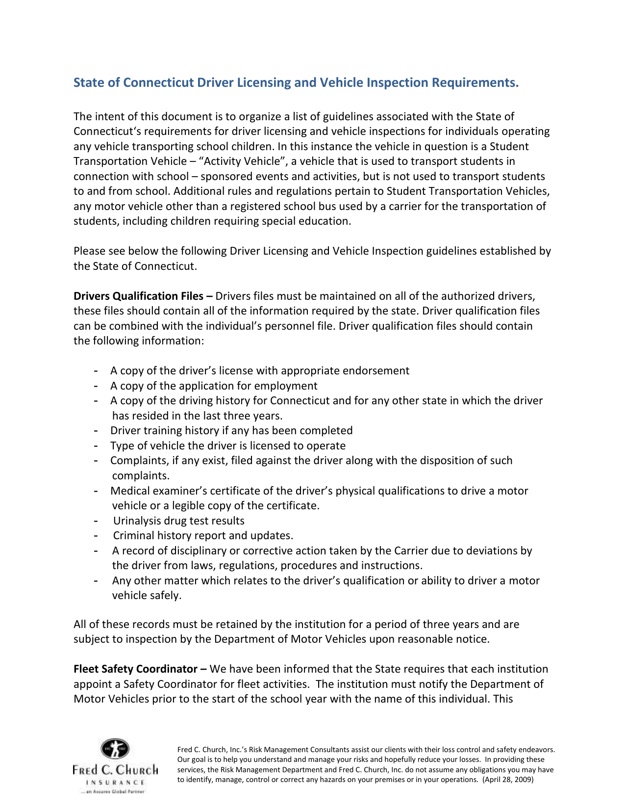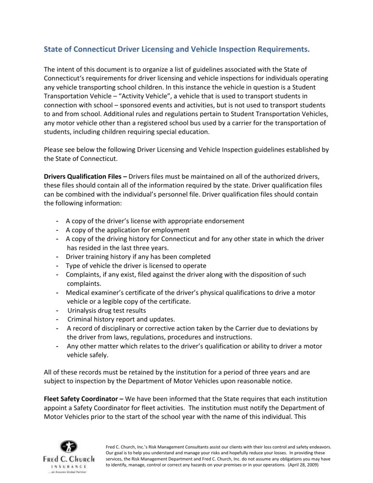 State of Connecticut Driver Licensing and Vehicle Inspection Requirements. The intent of this document is to organize a list of guidelines associated with the State of Connecticut‘s requirements for driver licensing and vehicle inspections for individuals operating any vehicle transporting school children. In this instance the vehicle in question is a Student Transportation Vehicle – “Activity Vehicle”, a vehicle that is used to transport students in connection with school – sponsored events and activities, but is not used to transport students to and from school. Additional rules and regulations pertain to Student Transportation Vehicles, any motor vehicle other than a registered school bus used by a carrier for the transportation of students, including children requiring special education. Please see below the following Driver Licensing and Vehicle Inspection guidelines established by the State of Connecticut. Drivers Qualification Files – Drivers files must be maintained on all of the authorized drivers, these files should contain all of the information required by the state. Driver qualification files can be combined with the individual’s personnel file. Driver qualification files should contain the following information: - A copy of the driver’s license with appropriate endorsement A copy of the application for employment A copy of the driving history for Connecticut and for any other state in which the driver has resided in the last three years. Driver training history if any has been completed Type of vehicle the driver is licensed to operate Complaints, if any exist, filed against the driver along with the disposition of such complaints. Medical examiner’s certificate of the driver’s physical qualifications to drive a motor vehicle or a legible copy of the certificate. Urinalysis drug test results Criminal history report and updates. A record of disciplinary or corrective action taken by the Carrier due to deviations by the driver from laws, regulations, procedures and instructions. Any other matter which relates to the driver’s qualification or ability to driver a motor vehicle safely. All of these records must be retained by the institution for a period of three years and are subject to inspection by the Department of Motor Vehicles upon reasonable notice. Fleet Safety Coordinator – We have been informed that the State requires that each institution appoint a Safety Coordinator for fleet activities. The institution must notify the Department of Motor Vehicles prior to the start of the school year with the name of this individual. This Fred C. Church, Inc.’s Risk Management Consultants assist our clients with their loss control and safety endeavors. Our goal is to help you understand and manage your risks and hopefully reduce your losses. In providing these services, the Risk Management Department and Fred C. Church, Inc. do not assume any obligations you may have to identify, manage, control or correct any hazards on your premises or in your operations. (April 28, 2009) individual’s responsibility is to monitor and update all activities associated with the licensing and inspection requirements. DMV Regs 14-275c – 48, effective 1/25/94 Motor Vehicle Record Program – A Motor Vehicle Record must be secured prior to an individual operating an institutions vehicle carrying children. The driver record check must be an actual abstract from the Department of Motor Vehicles or a reputable outside source. This driving record must be compared for accuracy against the institutions annual review form. Motor Vehicle Records must be done on an annual basis. A policy should be established by the institution requiring drivers to notify them if there is any change in their driving history throughout the course of the year. The guidelines for acceptable driving record can be found on the Department of Motor Vehicles web site http://www.ct.gov/dmv/cwp/view.asp?a=798&q=423884 Criminal Background Checks – A criminal background check, both state and federal must be done upon application for employment. Once initially completed the criminal background check does not require an actual abstract annually. The institutions annual review form signed by the driver and the institution will meet the statutes. If there are any convictions they must be listed on the institutions annual review form. Section 14-275c-50 of the CT DMV Regulations require drivers to notify the carrier of any change in their driving or criminal status on an annual basis. Medical Examiner’s Certificate – Individuals operating vehicles transporting students must undergo an initial medical evaluation to include both drug and alcohol testing. Physicals are then required every two years. CDL drivers must carry a copy of their physical or an approved card (Form B-328) when they are driving a commercial motor vehicle. Drug Testing – Drivers must undergo an initial urinalysis drug test; they are also required to submit to random drug testing. This law requires that 50% of all drivers within an institution be randomly tested per year. Driver Training – Individuals with an” S” or “V” endorsement are required by the State of Connecticut to undergo training by a Certified Driver Training Instructor. There are ten hours of required pre- service training and six hours of required annual in – service training. Individuals operating Activity Vehicles requiring an “A” endorsement are not required to undergo training. Vehicle Inspections – Activity Vehicles, those transporting students to and from events must undergo annual inspections per the state requirements. The state also requires that these vehicles must be inspected by a qualified mechanic in intervals not to exceed three months. They do not define qualified mechanic. Brake inspections must be completed every six months. We highly recommend that these inspections be conducted by a licensed mechanic. Pre-and Post Vehicle Inspections – 