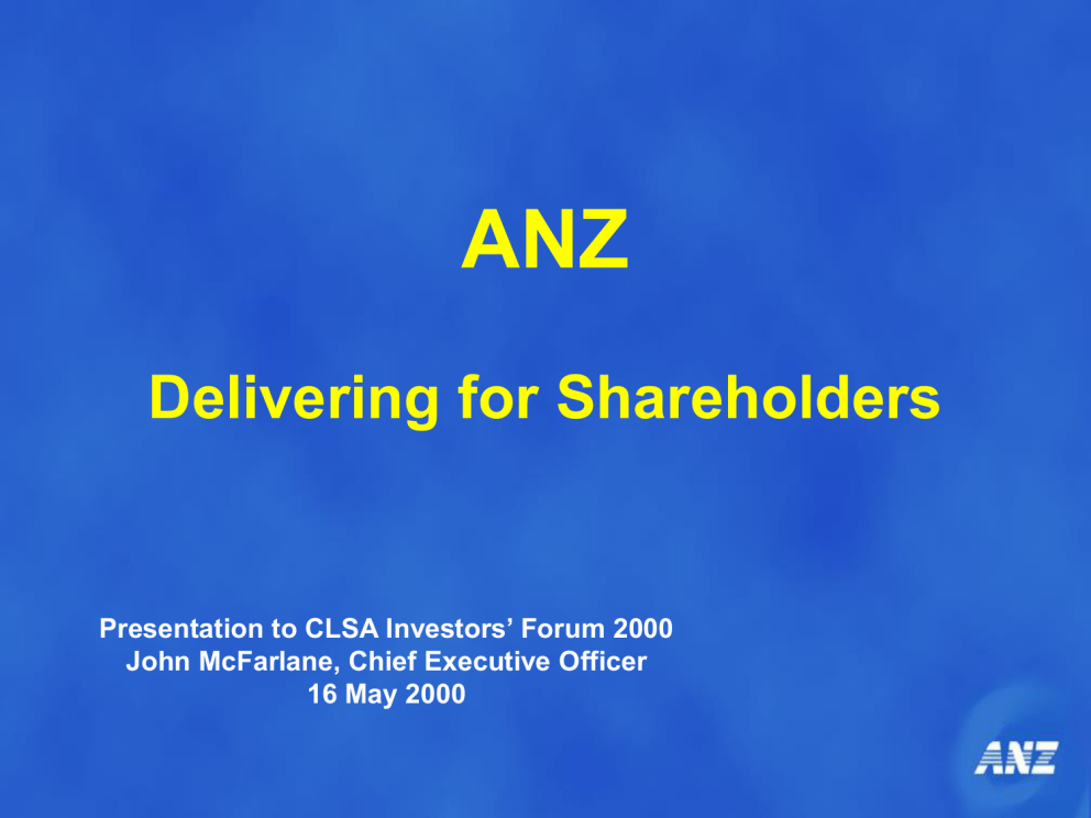 ANZ Delivering for Shareholders Presentation to CLSA Investors’ Forum 2000 John McFarlane, Chief Executive Officer 16 May 2000 ANZ One of the ‘Big Four” Australian banks. Provider of full range of financial services in Australia (since 1835) and New Zealand (since 1840) with leadership in Corporate Banking, Credit Cards and Trade, an emerging strong e-Commerce position and an offshore network in Asia and Pacific (Grindlays sale announced 27 April). Assets $167b Market Cap $17.5b Profit (first half 00) $817m Staff 28,940 Credit Rating AA-/Aa3 ANZ Headquarters 100 Queen Street Melbourne ANZ Delivers on Financial Commitments March 2000 Results Double-digit earnings growth 14%. EPS 10% Increase ROE towards 20% 17.8% (17.3%) 53% cost income ratio 51.4% Costs flat Reduce risk Matches peers ex Grindlays Achieve an optimal capital structure $500m buyback completed $1bn buyback announced Financial Performance EPS ¢ Tier 1 Ratio % 10 120 100 20 80 15 % 8 ROE 6 4 2 0 10 60 1997 1998 1999 1997 Mar-00 1998 1999 Mar-00 5 40 Lending Mix % 1997 1998 1999 Mar-00 % Cost Income Ratio 70 35 Mortgages 30 65 25 60 20 15 Emerging Markets 10 55 NAB 5 50 0 1998 1999 Mar-00 ProForma 1997 1998 1999 WBC CBA ANZ Mar-00 Business Unit Performance Other 8% International 9% A$ Personal 45% 400 350 Corporate 38% 300 250 200 150 100 50 0 Personal International Corporate 1H99 2H99 1H00 Other Change in Profit Other Income Other Fee 17 Growth 30 Doubtful Lending Fee Debts 20 Net Interest (4) Income 34 $m 850 800 764 750 Sale of Strategic Investments 33 Property Revaluation 30 Costs (9) 817 Tax (34) Restatement of Deferred Tax Balance (64) Significant one off items (1) 700 650 600 Second Half 1999 First Half 2000 Improving Asset Quality General Provision Non Accrual Loans $m $m Foreign Exchange Impact 2000 762 1500 886 (18) 1395 Net ELP Transfer to Charge Specific Provision 256 871 1000 444 1436 Surplus 944 (197) 900 657 428 500 554 0 1997 1998 Net Non Accrual Loans 1999 1H00 Specific Provisions Sep 99 Mar 00 APRA Guidelines Minimum Capital Management a Priority 12 % Ratios 10 8 6 4 2 0 1997 1998 Inner Tier 1 1999 1H00 Target Hybrid Tier 1 Net Tier 2 Capital management objective Increase ROE Maintain AA status Targets Tier 1 6.5 - 7.0% Inner Tier 1 6.0% - 6.5% Reducing excess $500m buyback completed $1bn buyback in process Good Progress on Business Strategies Business Strategy Accelerate growth in Personal Build on strength in Corporate Simplify and focus International Build leadership in e-Commerce Outcomes Mortgage & cards share up Personal 45% of group profit FM challenging, new team Leadership position enhanced ROA 0.9% (0.7%) Non accruals 0.4% (0.9%) Grindlays sale Latin America Offices closed Asia-Pacific e-Commerce focus Approaching leadership B2C Strong portfolio B2B Web enabled internal processes Numerous venture investments Momentum in Personal 14 Share of Housing Lending % % Share of Credit Card Spend 30 13 25 12 11 20 10 Jun-94 15 Jun-94 May-96 Apr-98 Mar-00 Internet Banking Registrations 240000 14.3 May-96 Apr-98 Mar-00 Internet Banking Users as % of Main Relationships 11 10.3 160000 10.2 4.9 80000 0 Oct 1998 Jan Apr Jul 1999 Oct Jan Apr 2000 ANZ WBC St George NAB CBA Source: Ord Minnett and Roy Morgan Research Leadership in Corporate Business Banking Relationships Australian Market Share 1999 (%) 26 7.5 NAB Leader in Treasury Products (FX, Risk Management) Esanda/UDC No1 Finance Company in Australia and New Zealand CBA Leading Structured Finance Specialist in Asia No 1 in Trade in Australia 19 WBC Customer Perception of Service Delivery 1999 (out of 10) 7.2 7.2 7 ANZ Pre-eminent Corporate Bank in Australia and New Zealand in terms of relationships and customer satisfaction 26 16 ANZ NAB CBA WBC Sale of Grindlays Price US$1.3 (A$2.2)bn – – Net Asset Value US$590 (A$990)m Goodwill US$750 ($A1,250)m Dividends $US0.5 (A$0.9) billion from Grindlays retained earnings Price multiples (excluding dividend) – 2.3 times net asset value, 14.2 times annualised first half 2000 earnings Cooperation Agreement with SCB to service ANZ customers Final consideration subject to Net Asset Value at completion Customary representations and warranties Indemnity regarding litigation matters including NHB Completion expected 3Q subject to regulatory approval ANZ Profile Group Growth Grindlays Assets $167b $14b $10b Profit $817m $53m $79m Staff 28,940 -1231 5400 Representation 39 ANZ Headquarters 100 Queen Street Melbourne 14 Delivering via the Web B2C B2B FX On-line (ANZ On-Line) Identrus Transformation E-Procurement Directors on line operations.com Employee PCs Sales & Service Platform ERP Enterprise Resource Planning Strategic Imperatives Accelerate the growth program across 3 horizons Radical transformation of the business Improve sustainability of core franchises Strategic Imperatives Accelerate the growth program across 3 horizons Reallocate investment towards current traditional growth opportunities Build substantial portfolio of e-products and businesses Build semi-global niche positions in trade, FX, structured finance, cards and e-Commerce Rapidly roll-out e-Commerce investments in Asia Strategic Imperatives Accelerate the growth program across 3 horizons Radical transformation of the business Revolutionise cost base to compete with new economy competitors Embrace web technology to achieve seamless integration Become a customer-centric company by organising around different customer segments Build culture and talent to compete in the new economy Strategic Imperatives Accelerate the growth program across 3 horizons Radical transformation of the business Improve sustainability of core franchises Continue to expand leadership in Corporate Complete domestic Personal footprint – organically – infill acquisitions Address retail funds management strategic position Medium-term search for transformational moves Improve capacity to participate in industry consolidation on our terms Financial Goals Going forward Earnings pe