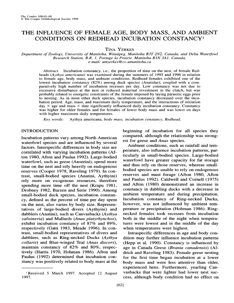 The Condor 1005-68 0 The Cooper Ornithological Society 1998 THE INFLUENCE CONDITIONS OF FEMALE AGE, BODY MASS, AND AMBIENT ON REDHEAD INCUBATION CONSTANCY’ TINA YERKES Departmentof Zoology, Universityof Manitoba, Winnipeg,Manitoba R3T 2N2, Canada, and Delta Waterjowl ResearchStation,R.R. I, Portage la Prairie, Manitoba RIN 3A1, Canada, e-mail: [email protected] Abstract. Incubation constancy,i.e., the proportion of time on the nest, of female Redheads (Aythya americana) was examined during the summersof 1995 and 1996 in relation to female age, body mass, and ambient conditions. Redhead females exhibited one of the lowest incubation constancy(82%) among duck species (Anatidae), coupled with a comparatively high number of incubation recessesper day. Low constancy was not due to excessive disturbanceat the nest or reduced maternal investment in the clutch, but was probably related to energeticconstraintsof the female imposedby laying parasiticeggsprior to nesting. As in most other duck species, incubation constancydecreasedover the incubation period. Age, mass,and maximum daily temperature,and the interactionsof initiation day X age and mass X date significantly influenced daily incubationconstancy.Constancy was higher for older females and for females of lower body mass and was lower on days with higher maximum daily temperatures. Key words: Aythya americana,body mass,incubationconstancy,Redhead. INTRODUCTION beginning of incubation for all species they compared, although the relationship was strongIncubation patternsvary among North American est for geese and Anas species. waterfowl speciesand are influenced by several Ambient conditions, such as rainfall and temfactors. Interspecific differences in body size are perature, also influence incubation patterns, parcorrelated with varying incubation patterns (Afticularly in small-bodied species. Large-bodied ton 1980, Afton and Paulus 1992). Large-bodied waterfowl have greater capacity for fat storage waterfowl, such as geese(Anserini), spendmore time on the nest and rely heavily on endogenous and thus rely on those reserves, whereas smallreserves (Cooper 1978, Raveling 1979). In con- bodied speciesare unable to rely on endogenous reserves and must forage (Afton 1980, Afton trast, small-bodied species (Anatini, Aythyini) rely more on exogenous resources, therefore and Paulus 1992). Caldwell and Cornell (1975) spending more time off the nest (Krapu 1981, and Afton (1980) demonstrated an increase in Drobney 1982, Barzen and Serie 1990). Among constancy in dabbling ducks with a decreasein small-bodied duck species, incubation constan- ambient temperature and during precipitation. cy, defined as the percent of time per day spent Incubation constancy of Ring-necked Ducks, on the nest, also varies by body size. Represen- however, was not influenced by ambient temtatives of large-bodied divers (Aythyini) and perature or precipitation (Hohman 1986). Ringdabblers (Anatini), such as Canvasbacks(Aythya necked females took recesses from incubation both in the middle of the night when temperavalisineria) and Mallards (Anus platyrhynchos), exhibit incubation constancy of 87% and 89%, tures were lowest and in the middle of the day respectively (Gatti 1983, Meade 1996). In con- when temperatureswere highest. trast, small-bodied representativesof divers and Intraspecific differences in age and body condabblers, such as Ring-necked Ducks (Aythya dition may further influence incubation patterns collaris) and Blue-winged Teal (Anus &cm-s), (Hepp et al. 1990). Constancy is influenced by maintain constancy of 82% and 80%, respec- age in Canada Geese (Brunta canadensis) (Altively (Harris 1970, Hohman 1986). Afton and drich and Raveling 1983). Female geesenesting Paulus (1992) determined that incubation con- for the first time began incubation at a lower stancy was positively related to body mass at the body mass and were less attentive than older, experienced hens. Furthermore, yearling Can‘Received 5 March 1997. Accepted 12 August vasbacks that were lighter had lower nest suc1997. cess, although body condition had no effect on 1621 REDHEAD hatchability of Redheads (Aythya americana) and adult Canvasbacks (Arnold et al. 1995). Lower incubation constancy may contribute to lower nest successof lighter, yearling Canvasbacks, but was not examined by Arnold et al. (1995). Arnold et al. (1995) may have failed to find a difference between age groups in Redheads due to few yearlings in the sample (n = INCUBATION CONSTANCY 63 METHODS Incubation data were collected in 1994 and 1995 near Minnedosa, Manitoba, Canada (50”10’N, 99’47’W). This area is characterized by numerous seasonally- to permanently-flooded wetlands, native aspen-parkland vegetation, and intensive agriculture. For a description of the study area see Stoudt (1982). 5). Redhead nests were located during daylight Body condition, often measured as body hours by searching emergent vegetation. Stage mass, may account for observed intraspecific of incubation was determined by field candling variation in constancy. Gatti (1983) demonstrat- (Weller 1956). At day 22-24 of incubation, hens ed that female Mallards in poor condition were were trapped on the nest to determine age and less attentive (lower constancy) during incuba- body mass. Age of hen was determined by tion as compared to those in better condition. plumage characteristics (Dane and Johnson Renesting ducks, whose reserves may be further 1975). Body mass to the nearest 2 5 g was dedepleted, incubate less attentively (Afton 1980). termined with Pesola scales. Body mass is a Additionally, Gloutney and Clark (1991) dem- good surrogate for condition in Redheads and onstrated that female Mallards and Northern was used as a comparative measure between feShovelers (Anus clypeatu) that were lighter at males (Bailey 1979, Johnsonet al. 1985; unpubl. the end of incubation had lower nest success, data). Weather data were recorded at Brandon Airpotentially 