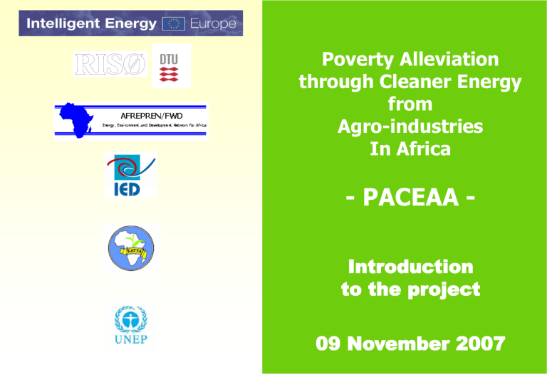 Poverty Alleviation through Cleaner Energy from Agro-industries In Africa - PACEAA Introduction to the project 09 November 2007 Objectives of PACEAA identify policy, commercial and regulatory barriers that restrict the use of cleaner energy from agro-industries; for rurql electrification, in selected countries, and propose ways of overcoming these barriers; develop detailed policy and regulatory guidelines and incentives for adoption of cleaner energy from agro-industries into rural electrification programmes as well as incorporate the packages into local rural electrification plans. enhance local and regional capacity of public institutions, private sector (financial institutions, agro-industries, rural stakeholders) for the effective utilisation of cogeneration and other cleaner energy systems from agro-industries in the rural electrification process; Context The PACEAA initiative will provide support to the Rural Electrification Components of the “Greening the Tea Industry in East Africa (GTIEA)” implemented by the East Africa Tea Trade Association (EATTA) and “Cogen for Africa” implemented by AFREPREN/FWD PACEAA has been approved by the European Commission as part of the COOPENER programme, for a 3 year period. The support will be in the form of technical expertise provided by UNEP Risoe Centre (Denmark) and IED (France). Work Programme Review of regulatory frameworks, best practices world wide, interest of stakeholders and selection of 4 Rural Electrification projects Elaboration of business models for rural electrification from agroindustries Elaboration of local Rural Electrification plans Training and capacity building Finalisation of Rural Electrification packages & Promotion to potential donors Communication and Dissemination activities Key tasks (1/2) Review of institutional frameworks, rural electrification targets and poverty reduction strategies in the 11 countries and world-wide experience ; needs assessment to improve regulatory frameworks Selection of most mature 4 projects (out of the project with detailed FS carried out by GTIEA and COGEN) for detailed study of the rural electrification component: Elaboration of business models, addressing financing and regulatory issues (ESCOs, Utility, Estate electrification,…) Elaboration of local rural electrification plan, including data collection, load forecast, local grid development plan, costing, financial analysis, organisational set-up, discussion of the plan with stakeholders Presentation / promotion of the rural electrification packages to potential donors, stimulation formation of user groups in beneficiary communities. Key tasks (2/2) Training and capacity building activities Least-cost options for rural electrification Local rural electrification planning Model contracts for rural electrification from excess energy generated by agro-industries Communication and Dissemination Web site, including a GIS/Internet presentation of the local rural electrification plans Case study brochure Articles and publication Final workshop open to the Agro-industry and other stakeholders from the Continent