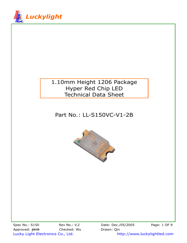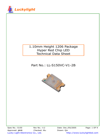 Luckylight 1.10mm Height 1206 Package Hyper Red Chip LED Technical Data Sheet Part No.: LL-S150VC-V1-2B Spec No.: S150 Rev No.: V.2 Date: Dec./05/2005 Approved: ZHOU Checked: Wu Drawn: Qin Lucky Light Electronics Co., Ltd. Page: 1 OF 9 http://www.luckylightled.com Luckylight Features: ◇ Package in 8mm tape on 7” diameter reel. ◇ Compatible with automatic placement equipment. ◇ Compatible with infrared and vapor phase reflow solder process. ◇ Mono-color type. ◇ The product itself will remain within RoHS compliant Version. Descriptions: ◇ The S150 SMD LED is much smaller than lead frame type components, thus enable smaller board size, higher packing. Density, reduced storage space and finally smaller equipment to be obtained. ◇ Besides, lightweight makes them ideal for miniature applications, etc. Applications: ◇ Automotive: Backlighting in dashboard and switch. ◇ Telecommunication: Indicator and backlighting in telephone and fax. ◇ Flat backlight for LCD, switch and symbol. ◇ General use. Spec No.: S150 Rev No.: V.2 Date: Dec./05/2005 Approved: ZHOU Checked: Wu Drawn: Qin Lucky Light Electronics Co., Ltd. Page: 2 OF 9 http://www.luckylightled.com Luckylight Package Dimension: 2 1.8 LED Die Cathode Mark 1 2 1.6 R0.25 1+ Polarity 3.2 2 1.8 LED Die 0.5 1.1 Resin PCB 3.2 Recommended Soldering Pad Dimensions 0.6 1 2 3.2 1.5 2 1.6 0.6 1.5 2 Soldering Terminal 1.5 1.5 2 Unit: mm Tolerance: ± 0.10mm 1. Soldering terminal may shift in x, y direction. 2. Polarity referring onto the cathode mark is reversed on the UR/HR/SR. Part No. Chip Material Lens Color Source Color LL-S150VC-V1-2B AlGaInP Water Clear Hyper Red Notes: 1. All dimensions are in millimeters (inches). 2. Tolerance is ± 0.10mm (.004″) unless otherwise specified. 3. Specifications are subject to change without notice. Spec No.: S150 Rev No.: V.2 Date: Dec./05/2005 Approved: ZHOU Checked: Wu Drawn: Qin Lucky Light Electronics Co., Ltd. Page: 3 OF 9 http://www.luckylightled.com Luckylight Absolute Maximum Ratings at Ta=25℃ Parameters Symbol Max. Unit Power Dissipation PD 60 mW Peak Forward Current (1/10 Duty Cycle, 0.1ms Pulse Width) IFP 100 mA Continuous Forward Current IF 25 mA Reverse Voltage VR 5 V Electrostatic Discharge ESD 2000 V Operating Temperature Range Topr -40℃ to +80℃ Storage Temperature Range Tstg -40℃ to +85℃ Soldering Temperature Tsld 260℃ for 5 Seconds Electrical Optical Characteristics at Ta=25℃ Parameters Symbol Min. Luminous Intensity * Typ. Max. Unit Test Condition IV 30 50 --- mcd IF=20mA (Note 1) 2θ1/2 --- 120 --- Deg IF=20mA (Note 2) Peak Emission Wavelength λp --- 632 --- nm IF=20mA Dominant Wavelength λd --- 624 --- nm IF=20mA (Note 3) Spectral Line Half-Width △λ --- 20 --- nm IF=20mA Forward Voltage VF 1.60 2.00 2.40 V IF=20mA Reverse Current IR --- --- 10 µA VR=5V Viewing Angle * Notes: 1. Luminous Intensity Measurement allowance is ± 10%. 2. θ1/2 is the off-axis angle at which the luminous intensity is half the axial luminous intensity. 3. The dominant wavelength (λd) is derived from the CIE chromaticity diagram and represents the single wavelength which defines the color of the device. Spec No.: S150 Rev No.: V.2 Date: Dec./05/2005 Approved: ZHOU Checked: Wu Drawn: Qin Lucky Light Electronics Co., Ltd. Page: 4 OF 9 http://www.luckylightled.com Luckylight Typical Electrical / Optical Characteristics Curves (25℃ Ambient Temperature Unless Otherwise Noted) Forward Current & Forward Voltage Ta=25℃ Ta=25℃ Forward Current IF (mA) 100 75 50 25 0 300 1000 400 500 600 700 Wavelength λp (nm) Luminous Intensity & Ambient Temperature 100 10 1 -60 -40 -20 0 20 40 60 80 100 Ambient Temperature Ta (℃) 50 40 30 20 10 0 800 1.6 1.8 2.0 2.2 2.4 2.6 Forward Voltage VF (V) Luminous Intensity & Forward Current Relative Luminous Intensity (%) Relative Luminous Intensity (%) Relative Luminous Intensity (%) Spectrum Distribution f=1KHz Duty=1/10 100 10 1 0 10 Forward Current Derating Curve Forward Current IF (mA) Ta=25℃ 1000 1 2 3 10 10 10 Forward Current IF (mA) Radiation Diagram 50 o 0 o 10 Ta=25℃ o 20 o 30 40 o 40 30 25 20 1.0 0.9 o 0.8 10 0 o 50 0.7 0 20 40 60 80 100 Ambient Temperature Ta (℃) 0.5 0.3 0.1 0 0.2 0.4 0.6 Spec No.: S150 Rev No.: V.2 Date: Dec./05/2005 Approved: ZHOU Checked: Wu Drawn: Qin Lucky Light Electronics Co., Ltd. 60 o 70 o 80o 90 Page: 5 OF 9 http://www.luckylightled.com Luckylight Reliability Test Items and Conditions: The reliability of products shall be satisfied with items listed below: Confidence level: 90%. LTPD: 10%. 1) Test Items and Results: No. Test Item Test Hours/Cycles Test Conditions Sample Size Ac/Re 1 Resistance to Soldering Heat 6 Min Tsld=260±5℃, Min. 5sec 25pcs 0/1 2 Thermal Shock 300 Cycles 25pcs 0/1 3 Temperature Cycle 300 Cycles 25pcs 0/1 4 5 6 7 High Temperature Storage DC Operating Life Low Temperature Storage High Temperature/ High Humidity H: +100℃ 5min ∫ 10 sec L: -10℃ 5min H: +100℃ 15min ∫ 5min L: -40℃ 15min 1000Hrs. Temp: 100℃ 25pcs 0/1 1000Hrs. IF=20mA 25pcs 0/1 1000Hrs. Temp: -40℃ 25pcs 0/1 1000Hrs. 85℃/85%RH 25pcs 0/1 2) Criteria for Judging the Damage: Criteria for Judgment Item Symbol Test Conditions Min Max Forward Voltage VF IF=20mA --- F.V.*)×1.1 Reverse Current IR VR=5V --- F.V.*)×2.0 Luminous Intensity IV IF=20mA F.V.*)×0.7 --- *) F.V.: First Value. Spec No.: S150 Rev No.: V.2 Date: Dec./05/2005 Approved: ZHOU Checked: Wu Drawn: Qin Lucky Light Electronics Co., Ltd. Page: 6 OF 9 http://www.luckylightled.com Luckylight Reel Dimensions: Carrier Tape Dimensions: Loaded quantity 3000 PCS per reel. Spec No.: S150 Rev No.: V.2 Date: Dec./05/2005 Approved: ZHOU Checked: Wu Drawn: Qin Lucky Light Electronics Co., Ltd. Page: 7 OF 9 http://www.luckylightled.com Luckylight Please read the following notes before using the product: 1. Over-current-proof Customer must apply resistors for protection, otherwise slight voltage shift will cause big current change (Burn out will happen). 2. Sto