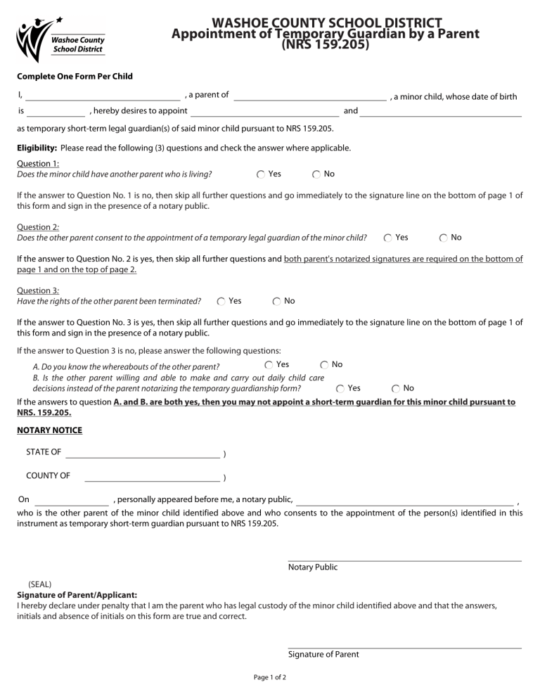WASHOE COUNTY SCHOOL DISTRICT Appointment of Temporary Guardian by a Parent (NRS 159.205) Complete One Form Per Child I, , a parent of is , a minor child, whose date of birth , hereby desires to appoint and as temporary short-term legal guardian(s) of said minor child pursuant to NRS 159.205. Eligibility: Please read the following (3) questions and check the answer where applicable. Question 1: Does the minor child have another parent who is living? Yes No If the answer to Question No. 1 is no, then skip all further questions and go immediately to the signature line on the bottom of page 1 of this form and sign in the presence of a notary public. Question 2: Does the other parent consent to the appointment of a temporary legal guardian of the minor child? Yes No If the answer to Question No. 2 is yes, then skip all further questions and both parent's notarized signatures are required on the bottom of page 1 and on the top of page 2. Question 3: Have the rights of the other parent been terminated? Yes No If the answer to Question No. 3 is yes, then skip all further questions and go immediately to the signature line on the bottom of page 1 of this form and sign in the presence of a notary public. If the answer to Question 3 is no, please answer the following questions: Yes No A. Do you know the whereabouts of the other parent? B. Is the other parent willing and able to make and carry out daily child care Yes No decisions instead of the parent notarizing the temporary guardianship form? If the answers to question A. and B. are both yes, then you may not appoint a short-term guardian for this minor child pursuant to NRS. 159.205. NOTARY NOTICE STATE OF ) COUNTY OF ) On , personally appeared before me, a notary public, , who is the other parent of the minor child identified above and who consents to the appointment of the person(s) identified in this instrument as temporary short-term guardian pursuant to NRS 159.205. Notary Public (SEAL) Signature of Parent/Applicant: I hereby declare under penalty that I am the parent who has legal custody of the minor child identified above and that the answers, initials and absence of initials on this form are true and correct. Signature of Parent Page 1 of 2 NOTARY NOTICE STATE OF ) ) ss. COUNTY OF On ) , personally appeared before me, a notary public, , who acknowledged to me that he/she has read and understood the within instrument and desires that the person(s) identified in this instrument accepts the appointment as temporary legal guardian of the minor child pursuant to NRS 159.205. Notary Public (SEAL) Signature of Parent/Applicant: I hereby declare under penalty that I am the parent who has legal custody of the minor child identified above and that the answers, initials and absence of initials on this form are true and correct. Signature of Parent Consent of Minor Child: If the minor child is fourteen (14) years of age or older, the minor child's written consent to the temporary short-term guardianship is required. DOB: Signature of minor child: DATE: Acceptance of Appointment of Guardianship: I/We and , do hereby accept this appointment as temporary short-term guardian for the minor child identified in this instrument and will accept responsibility for the care, custody, and control of said minor child, including all necessary authority and power to furnish and provide care and services to said minor child as may seem necessary, proper, or desirable in the child's best interest and welfare, including but not limited to food, clothing, shelter, education, and medical-surgical-dental care and treatment. I/We agree to abide by all federal, state and local laws including rules and regulations of the Washoe County School District. I/We understand this guardianship shall become effective upon my/our execution of this document in the presence of a notary public for a period of six (6) months and may be terminated by an instrument in writing signed by either parent of the minor child if that parent has not been deprived of the legal custody of said minor, or by any order of a court of competent jurisdiction. My/Our address and phone number are as follows: Address: Signature of Guardian Phone No. Signature of Guardian NOTARY NOTICE STATE OF ) COUNTY OF ) On ) ss: , personally appeared before me, a notary public, , and , who hereby accepted the appointment as temporary short-term guardian of the minor child identified above pursuant to NRS 159.205 beginning on this date. Notary Public (SEAL) Note: Please be aware that under NIAA policy (NAC 386.784.782 subsec.5) any student who transfers to another school is presumed ineligible to participate in any sanctioned sport at the school to which he transfers for 180 school days. Additionally, the NIAA will not recognize a temporary guardianship that is granted without the approval of a court pursuant to NRS 159.205 or 159.215. Page 2 of 2 Revised 7/2011
