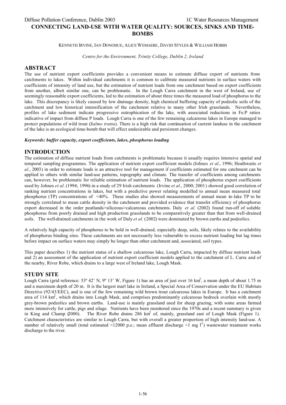 Diffuse Pollution Conference, Dublin 2003 1C Water Resources Management CONNECTING LAND-USE WITH WATER QUALITY: SOURCES, SINKS AND TIMEBOMBS KENNETH IRVINE, IAN DONOHUE, A LICE W EMAERE , DAVID STYLES & W ILLIAM HOBBS Centre for the Environment, Trinity College, Dublin 2, Ireland ABSTRACT The use of nutrient export coefficients provides a convenient means to estimate diffuse export of nutrients from catchments to lakes. Within individual catchments it is common to calibrate measured nutrients in surface waters with coefficients of intensity of land use, but the estimation of nutrient loads from one catchment based on export coefficients from another, albeit similar one, can be problematic. In the Lough Carra catchment in the west of Ireland, use of seemingly reasonable export coefficients, led to the estimation of about three times the measured load of phosphorus to the lake. This discrepancy is likely caused by low drainage density, high chemical buffering capacity of podzolic soils of the catchment and low historical intensification of the catchment relative to many other Irish grasslands. Nevertheless, profiles of lake sediment indicate progressive eutrophication of the lake, with associated reductions in Fe:P ratios indicative of impact from diffuse P loads. Lough Carra is one of the few remaining calcareous lakes in Europe managed to protect populations of wild trout (Salmo trutta). There is a high risk that continuation of current landuse in the catchment of the lake is an ecological time-bomb that will effect undesirable and persistent changes. Keywords: buffer capacity, export coefficients, lakes, phosphorus loading INTRODUCTION The estimation of diffuse nutrient loads from catchments is problematic because it usually requires intensive spatial and temporal sampling programmes. The application of nutrient export coefficient models (Johnes et al., 1996; Heathwaite et al., 2003) in order to estimate loads is an attractive tool for management if coefficients estimated for one catchment can be applied to others with similar land-use patterns, topography and climate. The transfer of coefficients among catchments can, however, be problematic for reliable estimation of nutrient loads. The application of phosphorus export coefficients used by Johnes et al. (1994; 1996) in a study of 29 Irish catchments (Irvine et al., 2000; 2001) showed good correlation of ranking nutrient concentrations in lakes, but with a predictive power relating modelled to annual mean measured total phosphorus (TP) concentrations of <40%. These studies also showed measurements of annual mean in-lake TP to be strongly correlated to mean cattle density in the catchment and provided evidence that transfer efficiency of phosphorus export decreased in the order peatlands>siliceous>calcareous catchments. Daly et al. (2002) found run-off of soluble phosphorus from poorly drained and high production grasslands to be comparatively greater than that from well-drained soils. The well-drained catchments in the work of Daly et al. (2002) were dominated by brown earths and podzolics. A relatively high capacity of phosphorus to be held in well-drained, especially deep, soils, likely relates to the availability of phosphorus binding sites. These catchments are not necessarily less vulnerable to excess nutrient loading but lag times before impact on surface waters may simply be longer than other catchment and, associated, soil types. This paper describes 1) the nutrient status of a shallow calcareous lake, Lough Carra, impacted by diffuse nutrient loads and 2) an assessment of the application of nutrient export coefficient models applied to the catchment of L. Carra and of the nearby, River Robe, which drains to a large west of Ireland lake, Lough Mask. STUDY SITE Lough Carra (grid reference: 53º 42’ N, 9º 13’ W, Figure 1) has an area of just over 16 km2 , a mean depth of about 1.75 m and a maximum depth of 20 m. It is the largest marl lake in Ireland, a Special Area of Conservation under the EU Habitats Directive (92/43/EEC), and is one of the few remaining wild brown trout calcareous lakes in Europe. It has a catchment area of 114 km2 , which drains into Lough Mask, and comprises predominantly calcareous bedrock overlain with mostly grey-brown podzolics and brown earths. Land-use is mainly grassland used for sheep grazing, with some areas farmed more intensively for cattle, pigs and silage. Nutrients have been monitored since the 1970s and a recent summary is given in King and Champ (2000). The River Robe drains 286 km2 of, mainly, grassland east of Lough Mask (Figure 1). Catchment characteristics are similar to Lough Carra, but with overall a greater proportion of high intensity land-use. A number of relatively small (total estimated <12000 p.e.; mean effluent discharge <1 mg l-1 ) wastewater treatment works discharge to the river. 1-56 Diffuse Pollution Conference, Dublin 2003 1C Water Resources Management Figure 1. Map of the Lough Mask catchment with the catchments of Lough Carra and the River Robe outlined. METHODS Two export coefficient models were used to estimate the current total annual phosphorus (TP) loading of Lough Carra. The model of Jordan et al. (2000) is based entirely on CORINE land cover data and was calibrated for lakes in Northern Ireland, while that of Johnes et al. (1996) utilises data on agricultural stocking densities, human populations, and rainfall in addition to land coverage, and was calibrated for a number of different catchment types in Britain. Export coefficients applied to this study were those used by Johnes et al. (1996) from lowland calcareous grassland dominated catchments in the southeast of England. All land cover data used in the modelling of TP loads were obtained from CORINE landcover maps using ArcView® Version 3.2 as the GIS interface, while data on animal stocking densities and human population sizes were obtained from the national agricultural and human population censuses fro