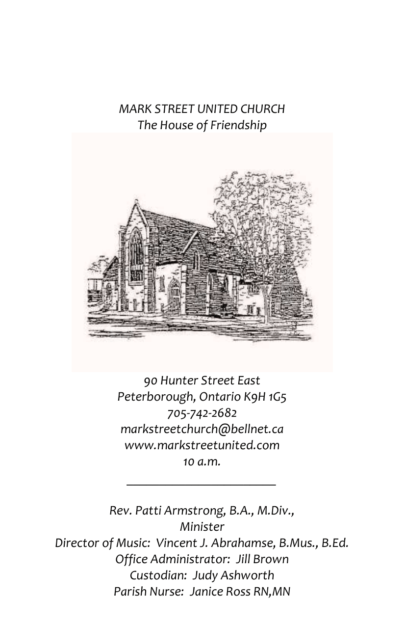 MARK STREET UNITED CHURCH The House of Friendship 90 Hunter Street East Peterborough, Ontario K9H 1G5 705-742-2682 [email protected] www.markstreetunited.com 10 a.m. _______________________ Rev. Patti Armstrong, B.A., M.Div., Minister Director of Music: Vincent J. Abrahamse, B.Mus., B.Ed. Office Administrator: Jill Brown Custodian: Judy Ashworth Parish Nurse: Janice Ross RN,MN 2 February 5th, 2017 Honouring Black History Month There is an old African proverb (with many variations around the continent): “Until lions start writing down their stories the hunters will always be glorified.” Deep thanks to Worship Leaders, Christine Bayeen, Flutists, Drumming Circle, Mark Street Choir and Vince Abrahamse, for sharing their gifts of Music. ___________________________________________ (* PLEASE STAND AS YOU ARE ABLE & CONGREGATION RESPOND IN BOLD) MUSICAL PRELUDE WELCOME & CENTERING OURSELVES IN THIS PLACE OF WORSHIP *PROCESSIONAL HYMN: VU 333 Love Divine, All Loves Excelling LIGHTING OF CHRIST CANDLE (text from a Traditional Spiritual): We heard the voice of Jesus say, “Come unto me and rest. Lay down thou weary one, Lay down thy head upon my breast.” With pitying eyes the Prince of Peace Beheld our helpless grief; He saw, and O amazing love! He came to our relief. 3 And the light from the light-house, shone on us. *CALL TO WORSHIP Friends, the God of hope is calling, Offering refreshment to those who are weary and heavy laden. Come to me, all you that are weary and are carrying heavy burdens, and I will give you rest. (Matthew 11:28) Come, O Holy Spirit. Friends, the God of peace is calling, Offering tender words of comfort to those in distress. Come children, how often I have longed to gather you together as a hen gathers her brood under her wings. (Matthew 23:37, alt.) O wise Spirit, come. Friends, the God of love is calling, Offering friendship and communion to those who feel alone. Come everyone who thirsts, come to the waters; and you that have no money, come buy and eat without money and without cost. (Isaiah 55:1, alt.) Come, O Holy Spirit, come, O wise Spirit, come. (VU 383) GREETING ONE ANOTHER OPENING PRAYER (based on A Song of Faith) Today in our worship, we lament anti-Black racism and violence in North America. We pray that the Spirit will reorient us: challenging us to live by grace rather than entitlement; expecting us to be a blessing to the earth. We pray that by acknowledging our brokenness, we will be closer to becoming a church where the good news is lived out: faith nurtured and hearts comforted, 4 gifts shared for the good of all, resistance to the forces that exploit and marginalize, fierce love in the face of violence, human dignity defended, members of a community held and inspired by God. Through our tears, may we witness to your love and grace. Amen. LIFE AND WORK OF THE CONGREGATION MUSIC & WORSHIP PRESENTATION SHARING OUR STORY-LAMENTATION THE LORD’S PRAYER (TOGETHER) Our Father, who art in heaven, hallowed be your Name. Your Kingdom come, Your will be done on earth as it is in heaven. Give us this day our daily bread; and forgive us our trespasses, as we forgive those who trespass against us; and lead us not into temptation, but deliver us from evil. For yours is the kingdom, and the power, and the glory, for ever and ever. Amen. PRAYER WITH CHILDREN God, with these ripped pieces of fabric, we name that we are broken, not yet whole. We ask for your help in mending our 5 torn heart back together, with the unbreakable bond of your love. Amen CHILDREN AND LEADERS MAY LEAVE FOR ACTIVITIES DOWNSTAIRS PRAYER OF LAMENTATION In many Black traditions, “hush” is a word of comfort, not a word of silencing. It is what a loving parent might say to console a child who has fallen and hurt themselves; it is a word of comfort, reassurance, and love often used when someone is acutely experiencing pain, grief, or suffering. Today, as we celebrate Black History Month, we pause to lament and sing words of comfort to those who are deeply feeling the pain of racism and anti-Black violence… God, we lament a world where the quality of a child’s life can still be accurately predicted by the colour of their skin; Black and Brown skin tones are perceived as weapons; White supremacy goes unchallenged; discrimination is expected and planned for; and racism is known to be woven into the fabric of society. Lord, what shall we do? “Hush! Hush!” [silence] God, we remember our children who have inherited racism overtly through the teaching of hate, and covertly through the lived experience of prejudice. We lament that children have the unfair burden to unlearn the lessons of discrimination that they have been taught. We lament that children are fighting against low expectations placed on them by a biased society. And we lament the children who 6 are angry when chastised for reflecting back the hateful language they have been taught. Lord, what shall we do? “Hush! Hush!” [silence] God, we remember our parents and guardians who have experienced friends, loved ones, and children dying from the physical and emotional wounds of anti-Black violence and who have worked thanklessly and prophetically for equality. We lament the protectors who feel helplessly unable to shield their loved ones from harm. We lament that our protestors are tired yet still persevere without signs of rest or progress. We lament that there are people who live in fear of hateful violence because of what they look like. Lord, what shall we do? “Hush! Hush!” [silence] God, we remember our elders, who created paths where there were none and sacrificed so that other generations could live in peace and freedom. We lament that they are being forced to relive the violence of racism in both different and familiar forms. We lament that they are not able to live with the peace and dignity that they fought for. We lament that they are forced to watch their children suffer. We lament the elders who are tired, weary