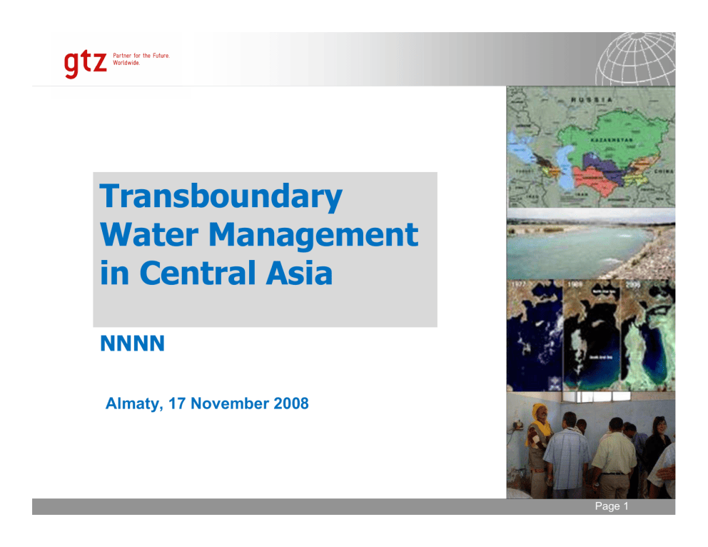 Transboundary Water Management in Central Asia Transboundary Water Management in Central Asia NNNN Almaty, 17 November 2008 19.01.2009 Page 1 Seite Transboundary Water Management in Central Asia German Water Initiative Five points of a German Water Initiative announced by Foreign Minister Steinmeier on 1 April 2008 Transboundary Water Management (based upon proposals from the region) Transfer of know-how regarding sustainable water management New course on sustainable water management at the Kazakh-German University, Almaty Networking among water experts from Germany, the EU and Central Asia Support for activities in Central Asia undertaken by Germany´s water industry, a world leader 19.01.2009 Page 2 Seite Transboundary Water Management in Central Asia Steps to develop a CA-German programme on Transboundary Water Management 01 April 08: announcement water initiative, Berlin June-July 08: Expert mission to all countries National planning workshops Follow-up conference on Berlin water initiative, 17-18 November, Almaty Start of programme: beginning 2009 Duration: until 2011/2012, possible extension 19.01.2009 Page 3 Seite Transboundary Water Management in Central Asia Expert Mission Date: 16 June 2008 – 1 August 2008 Countries: Uzbekistan, Tajikistan, Kyrgyzstan, Kazakhstan, Turkmenistan Institutions: Ministries (Foreign Affairs, Water, Energy, Environment) regional institutions (IFAS, SIC ICWC, SDIC, BVO) national institutes and organisations donor agencies 19.01.2009 Page 4 Seite Transboundary Water Management in Central Asia Programmatic Approach 19.01.2009 Page 5 Seite Transboundary Water Management in Central Asia Integration into existing activities GFZ CAIAG … Suisse Dev. Coop. World Bank ADB GTZ EU Projects (WARMAP) Central Asian Governments US AID ICWC IFAS UN ECE SPECA OSCE UNDP … 19.01.2009 Page 6 Seite Transboundary Water Management in Central Asia Proposal for a programmatic approach: 3 Components Regional Dialogue and Cooperation on Water Resources Management Implementation of Best Practices of River Basin Approach for Transboundary Rivers National Pilot Projects for Improved Water Management 19.01.2009 Page 7 Seite Transboundary Water Management in Central Asia C1: Regional Dialogue and Cooperation for Water Resources Management Regional Institutions on Water Cooperation Regional Framework for Water Management ( UN ECE Convention) Regional and Bilateral Agreements Regional Guidelines for Water Monitoring and Data Exchange 19.01.2009 Page 8 Seite Transboundary Water Management in Central Asia C2: River Basin Approach for Smaller Transboundary Rivers (1) Basin Assessment and Monitoring Administrative Structures Determination of River Basin Objectives Development of River Basin Management Plans (Long-term) Financing concepts for River Basin Infrastructure Transboundary Environmental and Social Impact Assessment Safety of Hydrotechnical Facilities and Dams 19.01.2009 Page 9 Seite Transboundary Water Management in Central Asia C2: River Basin Approach for Smaller Transboundary Rivers (2) Proposed Rivers: Isfara and Chadzhabarkan (Tjk- Kyrg) Murghab Basin (Turk- Afgh) Serafshan (Uzb- Tjk) Aral-Syrdarya basin (Kaz-Uzb) 19.01.2009 Page 10 Seite Transboundary Water Management in Central Asia C3: National pilot projects for improved water management (1) Institutional development of competence for Water, Climate Change and Energy (-> national competence centres?) Vulnerability analysis and adaptation strategies for Climate Change Development of criteria for hydropower utilisation Water reuse and sanitation Efficient use of water for irrigation – dissemination of good practices to selected river basins 19.01.2009 Page 11 Seite Transboundary Water Management in Central Asia C3: National pilot projects for improved water management (2) National proposals Support to solutions and action plans for Garauti irrigation area (Tjk) Support to increased safety and improvement of hydrotechnical facilities and dams (Kyrg) Support to solutions and action plans for safe use and reuse of water; improvement of water quality – Murghab river (Turk) 19.01.2009 Page 12 Seite Transboundary Water Management in Central Asia Next steps Narrowing down of topics: Complete national feed-backs Regional workshop for next planning steps? Start of programme beginning 2009 19.01.2009 Page 13 Seite Transboundary Water Management in Central Asia Thank you! Бољшoе спасибо! 19.01.2009 Page 14 Seite