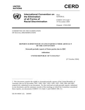 CERD UNITED NATIONS International Convention on the Elimination of all Forms of Racial Discrimination Distr. GENERAL CERD/C/452/Add.7 19 November 2004 Original: ENGLISH COMMITTEE ON THE ELIMINATION OF RACIAL DISCRIMINATION REPORTS SUBMITTED BY STATES PARTIES UNDER ARTICLE 9 OF THE CONVENTION Sixteenth periodic reports of States parties due in 2003 Addendum UNITED REPUBLIC OF TANZANIA* [27 October 2004] * This document contains the eighth to sixteenth periodic reports of the United Republic of Tanzania, due on 26 November 1987, 1989, 1991, 1993, 1995, 1997, 1999, 2001 and 2003 respectively, submitted in one document. For the sixth and seventh periodic reports, submitted in one document, and the summary records of the meetings at which the Committee considered those reports, see documents CERD/C/131/Add.11 and CERD/C/SR.112. GE.04-44684 (E) 260405 CERD/C/452/Add.7 page 2 CONTENTS Chapter Paragraphs Page Introduction ............................................................................... 1 3 I. GENERAL INFORMATION ................................................... 2-5 3 II. INFORMATION CONCERNING THE IMPLEMENTATION OF ARTICLES 2-7 OF THE CONVENTION ......................... 6 - 61 3 Article 2 .................................................................................... 6-9 3 Articles 3 and 4 ......................................................................... 10 - 11 4 Article 5 .................................................................................... 12 - 44 5 Article 6 .................................................................................... 45 - 56 12 Article 7 .................................................................................... 57 - 61 14 CONCLUSION ......................................................................... 62 16 III. CERD/C/452/Add.7 page 3 Introduction 1. This is the eighth to sixteenth periodic reports submitted by the Government of the United Republic of Tanzania in accordance with article 9 of the International Convention on the Elimination of All Forms of Racial Discrimination. This report has been prepared in accordance with the guidelines issued by the Committee on the Elimination of Racial Discrimination (CERD/C/70/Rev.5). I. GENERAL INFORMATION 2. The United Republic of Tanzania is a union between the Republic of Tanganyika and Zanzibar, which was sealed on 26 April 1964. Tanzania is located geographically in East Africa between 29° and 41° east and 1° and 12° south, covering an area of 942,600 km2. It borders the Republic of Kenya and Uganda in the north, Rwanda, Burundi and the Democratic Republic of the Congo in the west, Zambia, Malawi and Mozambique in the south and the Indian Ocean in the east. Tanzania experiences a tropical type of climate. According to the census of 2002, the United Republic of Tanzania has a population of 34,569,232 people, 51 per cent of whom are women and 49 per cent men. People under the age of 15 are 46 per cent of the total population. There are about 126 ethnic groups in the country speaking different ethnic languages. However, the majority of the population speaks Kiswahili, which is the national language. This language is the symbol of unity as it is the major means of communication and business transactions. 3. A classification of the demographic composition is not available, as one’s religious or spiritual belief or race is not one of the questions asked during the national census on population and housing. This was done to discourage tribalism and religious intolerance and encourage State socialism and nationhood. As pointed out in this report, Kiswahili has been promoted and adopted as the national language. 4. The United Republic of Tanzania’s legal framework is structured on the common law framework. The category of laws that operate in Tanzania include statutory laws, customary law, case law (precedent) and the Judicature and Application of Laws Ordinance of 1961. 5. The United Republic of Tanzania has been a multiparty State since 1992. There are 17 political parties. Article 4 of the Constitution of the United Republic of Tanzania provides that all the State authority in Tanzania shall be exercised and controlled by three organs of the State, which are the legislature (Parliament), the judiciary and the executive. The three organs are independent from each other. Tanzania also maintains the rule of law. II. INFORMATION CONCERNING THE IMPLEMENTANTION OF ARTICLES 2-7 OF THE CONVENTION Article 2 6. Discrimination of any kind is constitutionally prohibited under article 13 of the United Republic Constitution. Organs of State or authorities discharging public duties or rendering services are prohibited from discriminating against any person on the basis of colour, CERD/C/452/Add.7 page 4 origin, status in life, etc. Any person who feels that he has been or is being discriminated may seek redress in a court of law. Discrimination is adequately defined under article 13 of the Constitution. This description is consistent with the Convention definition. 7. Prior to independence, Tanzanian public service and political activities were carried out by non-Tanzanians. Tanzania undertook affirmative action in favour of local Tanzanians who had been marginalized during the colonial rule to take over these services. Although Tanzania has no specific laws on racial discrimination, there are express provisions which serve that purpose. For example, section 63 (b) (1) of the Penal Code, Cap 16, provides: “Any person who to any assembly makes any statement likely to raise discontent amongst any of the inhabitants of the United Republic or to promote feelings of ill-will between different classes or communities of persons of the United Republic, is guilty of a misdemeanour …” 8. In 1984 the Bill of Rights was incorporated into the Constitution of the United Republic of Tanzania. The rights contained in the Bill of Rights are justiciable under the Basic Rights and Dutie