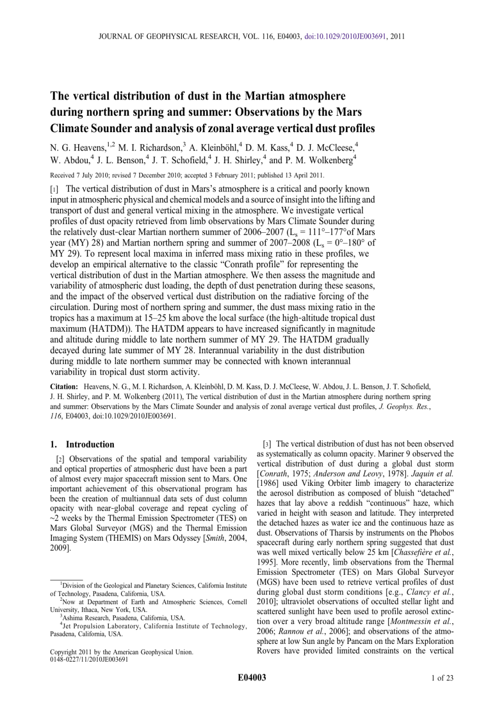 JOURNAL OF GEOPHYSICAL RESEARCH, VOL. 116, E04003, doi:10.1029/2010JE003691, 2011 The vertical distribution of dust in the Martian atmosphere during northern spring and summer: Observations by the Mars Climate Sounder and analysis of zonal average vertical dust profiles N. G. Heavens,1,2 M. I. Richardson,3 A. Kleinböhl,4 D. M. Kass,4 D. J. McCleese,4 W. Abdou,4 J. L. Benson,4 J. T. Schofield,4 J. H. Shirley,4 and P. M. Wolkenberg4 Received 7 July 2010; revised 7 December 2010; accepted 3 February 2011; published 13 April 2011. [1] The vertical distribution of dust in Mars’s atmosphere is a critical and poorly known input in atmospheric physical and chemical models and a source of insight into the lifting and transport of dust and general vertical mixing in the atmosphere. We investigate vertical profiles of dust opacity retrieved from limb observations by Mars Climate Sounder during the relatively dust‐clear Martian northern summer of 2006–2007 (Ls = 111°–177°of Mars year (MY) 28) and Martian northern spring and summer of 2007–2008 (Ls = 0°–180° of MY 29). To represent local maxima in inferred mass mixing ratio in these profiles, we develop an empirical alternative to the classic “Conrath profile” for representing the vertical distribution of dust in the Martian atmosphere. We then assess the magnitude and variability of atmospheric dust loading, the depth of dust penetration during these seasons, and the impact of the observed vertical dust distribution on the radiative forcing of the circulation. During most of northern spring and summer, the dust mass mixing ratio in the tropics has a maximum at 15–25 km above the local surface (the high‐altitude tropical dust maximum (HATDM)). The HATDM appears to have increased significantly in magnitude and altitude during middle to late northern summer of MY 29. The HATDM gradually decayed during late summer of MY 28. Interannual variability in the dust distribution during middle to late northern summer may be connected with known interannual variability in tropical dust storm activity. Citation: Heavens, N. G., M. I. Richardson, A. Kleinböhl, D. M. Kass, D. J. McCleese, W. Abdou, J. L. Benson, J. T. Schofield, J. H. Shirley, and P. M. Wolkenberg (2011), The vertical distribution of dust in the Martian atmosphere during northern spring and summer: Observations by the Mars Climate Sounder and analysis of zonal average vertical dust profiles, J. Geophys. Res., 116, E04003, doi:10.1029/2010JE003691. 1. Introduction [2] Observations of the spatial and temporal variability and optical properties of atmospheric dust have been a part of almost every major spacecraft mission sent to Mars. One important achievement of this observational program has been the creation of multiannual data sets of dust column opacity with near‐global coverage and repeat cycling of ∼2 weeks by the Thermal Emission Spectrometer (TES) on Mars Global Surveyor (MGS) and the Thermal Emission Imaging System (THEMIS) on Mars Odyssey [Smith, 2004, 2009]. 1 Division of the Geological and Planetary Sciences, California Institute of Technology, Pasadena, California, USA. 2 Now at Department of Earth and Atmospheric Sciences, Cornell University, Ithaca, New York, USA. 3 Ashima Research, Pasadena, California, USA. 4 Jet Propulsion Laboratory, California Institute of Technology, Pasadena, California, USA. Copyright 2011 by the American Geophysical Union. 0148‐0227/11/2010JE003691 [3] The vertical distribution of dust has not been observed as systematically as column opacity. Mariner 9 observed the vertical distribution of dust during a global dust storm [Conrath, 1975; Anderson and Leovy, 1978]. Jaquin et al. [1986] used Viking Orbiter limb imagery to characterize the aerosol distribution as composed of bluish “detached” hazes that lay above a reddish “continuous” haze, which varied in height with season and latitude. They interpreted the detached hazes as water ice and the continuous haze as dust. Observations of Tharsis by instruments on the Phobos spacecraft during early northern spring suggested that dust was well mixed vertically below 25 km [Chassefière et al., 1995]. More recently, limb observations from the Thermal Emission Spectrometer (TES) on Mars Global Surveyor (MGS) have been used to retrieve vertical profiles of dust during global dust storm conditions [e.g., Clancy et al., 2010]; ultraviolet observations of occulted stellar light and scattered sunlight have been used to profile aerosol extinction over a very broad altitude range [Montmessin et al., 2006; Rannou et al., 2006]; and observations of the atmosphere at low Sun angle by Pancam on the Mars Exploration Rovers have provided limited constraints on the vertical E04003 1 of 23 E04003 HEAVENS ET AL.: MARTIAN VERTICAL DUST DISTRIBUTION distribution of dust within 30 km of the surface [Lemmon et al., 2004]. [4] Measurements of the vertical distribution of dust in particular (as opposed to the column opacity) provide insight into the mechanisms by which dust enters and leaves the atmosphere. Conrath [1975] attributed the vertical distribution to the competing effects of sedimentation and vertically uniform vertical eddy diffusion. This simple picture has been complicated by (1) the possibility of additional removal processes such as the enhancement of sedimentation by the condensation of volatiles on dust particles [Nelli and Murphy, 2002]; (2) modeling of vertical transport above the boundary layer due to dynamical processes such as the thermal tides [Wilson and Hamilton, 1996]; (3) more detailed treatment of mixing within the boundary layer [Taylor et al., 2007]; (4) explicit consideration in models of dust particle size and its variability [Kahre et al., 2008]; and (5) consideration of the sources of dust such as mountain slope circulations [Lee et al., 1982; Rafkin et al., 2002] and dry convective vortices (“dust devils”) [Kahre et al., 2006; Cantor et al., 2006; Greeley et al.