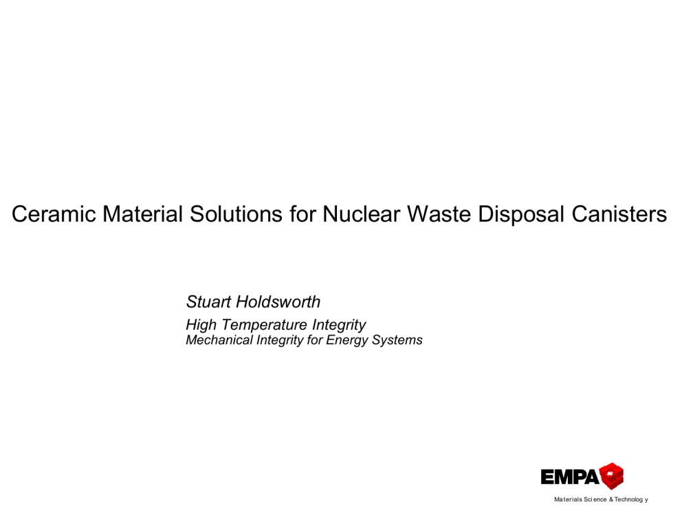 Ceramic Material Solutions for Nuclear Waste Disposal Canisters Stuart Holdsworth High Temperature Integrity Mechanical Integrity for Energy Systems Ma terials Sci ence & Technolog y Ceramic solutions for nuclear waste disposal canisters ENSI presentation (5.Nov-2015) Background Mechanical and Introduction integrity Susceptibility Large to environmental damage and impact on geological barrier product-form fabrication Container sealing solutions Coatings Concluding remarks EMPA, SRH\ENSIholdsworth.pptx, 5.Nov-2015 Ma terials Sci ence & Technolog y 2 Ceramic solutions for nuclear waste disposal canisters NAGRA canister review: Canister dimensions Disposal of spent fuel (SF) 5m long x 760mm ID, with t ~150mm (depending on material solution) Alternative configurations possible, but length is fixed Disposal of vitrified high level waste (HLW) 3m(1.5m) long x 450mm ID, with t ≥ 50mm (depending on material solution) HLW cylinders are typically 1.34m long x 430mm diam. EMPA, SRH\ENSIholdsworth.pptx, 5.Nov-2015 Ma terials Sci ence & Technolog y 3 Ceramic solutions for nuclear waste disposal canisters NAGRA canister review: Canister logistics Disposal of spent fuel (SF) 5m long x 760mm ID, with t ~150mm (depending on material solution) Alternative configurations possible, but length is fixed Disposal of vitrified high level waste (HLW) 3m(1.5m) long x 450mm ID, with t ≥ 50mm (depending on material solution) HLW cylinders are typically 1.34m long x 430mm diam. HOT CELL Fill with SF/VHLW Final seal Inspection T 400-450°C EMPA, SRH\ENSIholdsworth.pptx, 5.Nov-2015 Ma terials Sci ence & Technolog y 4 Ceramic solutions for nuclear waste disposal canisters NAGRA canister review: NAB-14-90 evaluation categories Mechanical integrity Load cases: handling, disposal Environmental damage ‘Short-time’ aerobic (dry) phase; ‘Long-time’ anaerobic (moist) phase General corrosion, localised corrosion, microbial induced corrosion, stress corrosion and hydrogen induced cracking Impact on geological barrier Robustness of lifetime prediction Very long time (>10,000y) corrosion damage predictions Fabrication Canister manufacture, final sealing, inspection Costs Development costs, unit costs EMPA, SRH\ENSIholdsworth.pptx, 5.Nov-2015 Ma terials Sci ence & Technolog y 5 Ceramic solutions for nuclear waste disposal canisters Defect integrity: Failure assessment diagram sapp 1.0 F FAILURE 0.8 Kr= Kapp/KIC a f 0.6 NO FAILURE sapp 0.4 K app s app . a.Y a,f, F 0.2 Failure assessment envelope 0.0 0.0 0.2 0.4 0.6 0.8 1.0 1.2 1.4 Lr = sref/Rpx EMPA, SRH\ENSIholdsworth.pptx, 5.Nov-2015 Ma terials Sci ence & Technolog y 6 Ceramic solutions for nuclear waste disposal canisters NAGRA canister review: Candidate material solutions Carbon steel (with corrosion allowance) Copper shell with internal cast iron support Copper (or nickel alloy) coating of carbon steel Titanium or nickel alloy shell with carbon steel support Ceramics EMPA, SRH\ENSIholdsworth.pptx, 5.Nov-2015 Ma terials Sci ence & Technolog y 7 Ceramic solutions for nuclear waste disposal canisters Candidate ceramics Gross density (g/cm3) Flexural strength (MPa) Compressive strength (MPa) Fracture toughness (MPam) Elastic modulus, dynamic (GPa) Vickers hardness (GPa) Thermal conductivity (W/mK) Thermal expansion, CTE (10-6/ºC) Maximum operating temperature (ºC) Melting point (ºC) SiO2MgO Al2O3 (96-99.1%) Al2O3 (99.8%) ZrO2MgO ZrO2Y2O3 TiO2 SiC Si3N4Y2O3 2.2-2.8 110-180 3.80-3.82 280-350 2000 3.96 500 4000 5.74 500 1600 6.08 1000 2200 4.26 69-103 3.10 350 2000 3.21 750 3000 4.0 4.3 8.1 10.0 2.5 3.8 7.0 70-120 270-340 380 210 210 283 350 305 2-5 14-17 24-28 18 30 13 3 13 2.5 8.8 25 100 16 21 4-7 7.1-7.3 7.5 10.2 10.4 9.4 3.5 3.2 1000 1400 1500 850 1000 1800 1600 2700 2700 EMPA, SRH\ENSIholdsworth.pptx, 5.Nov-2015 2015 2700 1840 Ma terials Sci ence & Technolog y 8 Ceramic solutions for nuclear waste disposal canisters Previous experience Swedish evaluation programme Al203 fabricated by sintering under isostatic pressure Sealing by diffusion bonding with TiO2 powder Some environmental damage evaluation Programme terminated in ~1980 due to progress with copper canister development German evaluation programme Focus on Al2O3 Pre-stressed mechanical solution adopted for sealing Significant environmental damage testing No indication of programme continuing after 1990s BNL/Nucon (US) evaluation programme MgAl2O4 spinel (one of Yucca Mountain solutions) Sealing by diffusion bonding with local microwave heating No environmental damage test results identified Evaluation programme no longer continuing NAGRA feasibility studies ANDRA evaluation of Al2O3-SiO2 solutions (P72) EMPA first review [NAB 12-45] EMPA second review (as part of [NAB 14-90]) Greater focus on SiC EMPA, SRH\ENSIholdsworth.pptx, 5.Nov-2015 Ma terials Sci ence & Technolog y 9 Ceramic solutions for nuclear waste disposal canisters Al2O3-SiO2 and SiC solutions EMPA, SRH\ENSIholdsworth.pptx, 5.Nov-2015 Al2O3/SiO2 (50mm) Al2O3/SiO2 (50mm) a = 2mm 1.2 a = 2mm 1.2 UNSAFE 1.0 1.0 UNSAFE 0.8 Kr Kr 0.8 SAFE 0.6 0.6 SAFE 0.4 0.4 0.2 0.2 0.0 0.0 0.0 0.2 0.4 0.6 0.8 1.0 1.2 1.4 0.0 0.2 0.4 0.6 Lr 0.8 1.0 1.2 1.0 1.2 1.4 Lr 1.4 1.4 SSiC (50mm) SSiC (50mm) a = 2mm 1.2 a = 2mm 1.2 1.0 UNSAFE 1.0 UNSAFE 0.8 0.8 Kr Silicon carbide (SiCeram) There are a number of variants: SSiC, SiSiC, RSiC, LPSSiC, Sif/Si3N4 SSiC exhibits better properties, but prone to high porosity levels (up to 20%), in particular in large sections (could be overcome by Hipping) SiSiC – low porosity, lower mechanical properties, prone to leaching Sealing by laser beam heating with glass ceramic solders (Y2O3-Al2O3-SiO2) – currently only feasible for small sections 1.4 1.4 Kr ANDRA evaluation Main focus on Al2O3-SiO2 HLW canister feasibility Half scale body manufacture of this size feasible Sealing is still an unresolved problem, requiring significant R&D activity – diffusion bonding is promising except for very high temperatures required 0.6 0.6 SAFE 