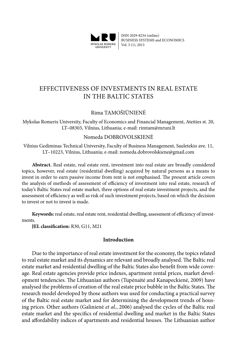 ISSN 2029-8234 (online) BUSINESS SYSTEMS and ECONOMICS Vol. 3 (1), 2013 EFFECTIVENESS OF INVESTMENTS IN REAL ESTATE IN THE BALTIC STATES Rima TAMOŠIŪNIENĖ Mykolas Romeris University, Faculty of Economics and Financial Management, Ateities st. 20, LT–08303, Vilnius, Lithuania; e-mail: [email protected] Nomeda DOBROVOLSKIENĖ Vilnius Gediminas Technical University, Faculty of Business Management, Sauletekio ave. 11, LT–10223, Vilnius, Lithuania; e-mail: [email protected] Abstract. Real estate, real estate rent, investment into real estate are broadly considered topics, however, real estate (residential dwelling) acquired by natural persons as a means to invest in order to earn passive income from rent is not emphasised. The present article covers the analysis of methods of assessment of efficiency of investment into real estate, research of today’s Baltic States real estate market, three options of real estate investment projects, and the assessment of efficiency as well as risk of such investment projects, based on which the decision to invest or not to invest is made. Keywords: real estate, real estate rent, residential dwelling, assessment of efficiency of investments. JEL classification: R30, G11, M21 Introduction Due to the importance of real estate investment for the economy, the topics related to real estate market and its dynamics are relevant and broadly analysed. The Baltic real estate market and residential dwelling of the Baltic States also benefit from wide coverage. Real estate agencies provide price indexes, apartment rental prices, market development tendencies. The Lithuanian authors (Tupėnaitė and Kanapeckienė, 2009) have analysed the problems of creation of the real estate price bubble in the Baltic States. The research model developed by those authors was used for conducting a practical survey of the Baltic real estate market and for determining the development trends of housing prices. Other authors (Galinienė et al., 2006) analysed the cycles of the Baltic real estate market and the specifics of residential dwelling and market in the Baltic States and affordability indices of apartments and residential houses. The Lithuanian author Rima TAMOŠIŪNIENĖ, Nomeda DOBROVOLSKIENĖ. EFFECTIVENESS OF INVESTMENTS IN REAL ESTATE IN THE BALTIC STATES 49 Mačernytė (2011) conducted an overview of the real estate market of the Baltic States and created a Vector Autoregression Model that allowed forecasting the real estate market of the Baltic States. The Baltic real estate market deserves greater attention, but investments into real estate in the Baltic States, especially into residential dwelling, are far from being a frequently elaborated theme. Meanwhile the collapse of Snoras Bank in Lithuania and Parex bank in Latvia once again reminded that investing into real estate is substantial. With a view to protect personal savings, residents cannot rely on commercial banks only. The best protection of savings is comprehensive diversification of the investment portfolio, including both financial instruments and investment into real estate. Many Lithuanian authors (Bikas and Laurinavičius, 2009; Laurinavičius, 2011; Bivainis and Volodzkienė, 2008; Kvedaravičienė, 2008; Tamošiūnienė, 2009; Galinienė et al., 2006), analysing the investing problem that is an extremely relevant issue for residents, suggest investing into real estate in Lithuania through the formation of an investment portfolio from the Lithuanian securities and real estate in Vilnius. However, real estate (residential dwelling) acquired by natural persons as investing means to earn passive income from rent is not emphasised. Investing into residential dwelling by natural persons is analysed more seldom than investing into securities or own business. Investing into residential dwelling is often seen as investing into construction business and earning profit from new apartments sold. Income earned from rent is commonly related to commercial real estate. Therefore, there is a need to make a comparison and efficiency assessment of investment into residential dwelling with a view to rent it and earn income as well as to determine whether it is efficient to invest into real estate in the Baltic States. The object of this paper is the investments in real estate (residential dwelling) in the Baltic States. The aim of this article is to determine whether investing into real estate (residential dwelling) in the Baltic States is efficient when income is earned from renting a dwelling. The objectives of this article are as follows: (1) to reveal the key theoretical and practical aspects of the assessment of efficiency of investing into real estate; (2) to review the Baltic real estate market; (3) to assess efficiency of real estate investment projects in the Baltic States. Methods of research: comparative analysis of scientific literature, other sources of information, logical analysis, statistical analysis. Methods of assessment of efficiency of investing into real estate The main criterion in choosing real estate investment project is P/E (Price/ Earnings) ratio of return on investment into real estate, which shows the number of years after which the investment into real estate will start paying dividends in case of leasing it. It is considered that when P/E exceeds 15 – the object of investment is overrated (Brown and Matysiak, 2000; Cappoza et al., 2004; Ginevičius et al., 2009). Contemporary science of economics offers a rather large number of investment efficiency assessment methods. Methods to assess financial and economic efficiency of 50 BUSINESS SYSTEMS and ECONOMICS Vol. 3 (1), 2013 the project, often not integrating risk assessment indicators and not taking qualitative factors into consideration, are commonly applied in practice. The analysis of scientific literature demonstrated that the efficiency of investment projects was assessed by the following project assessment methods: total capital, eq