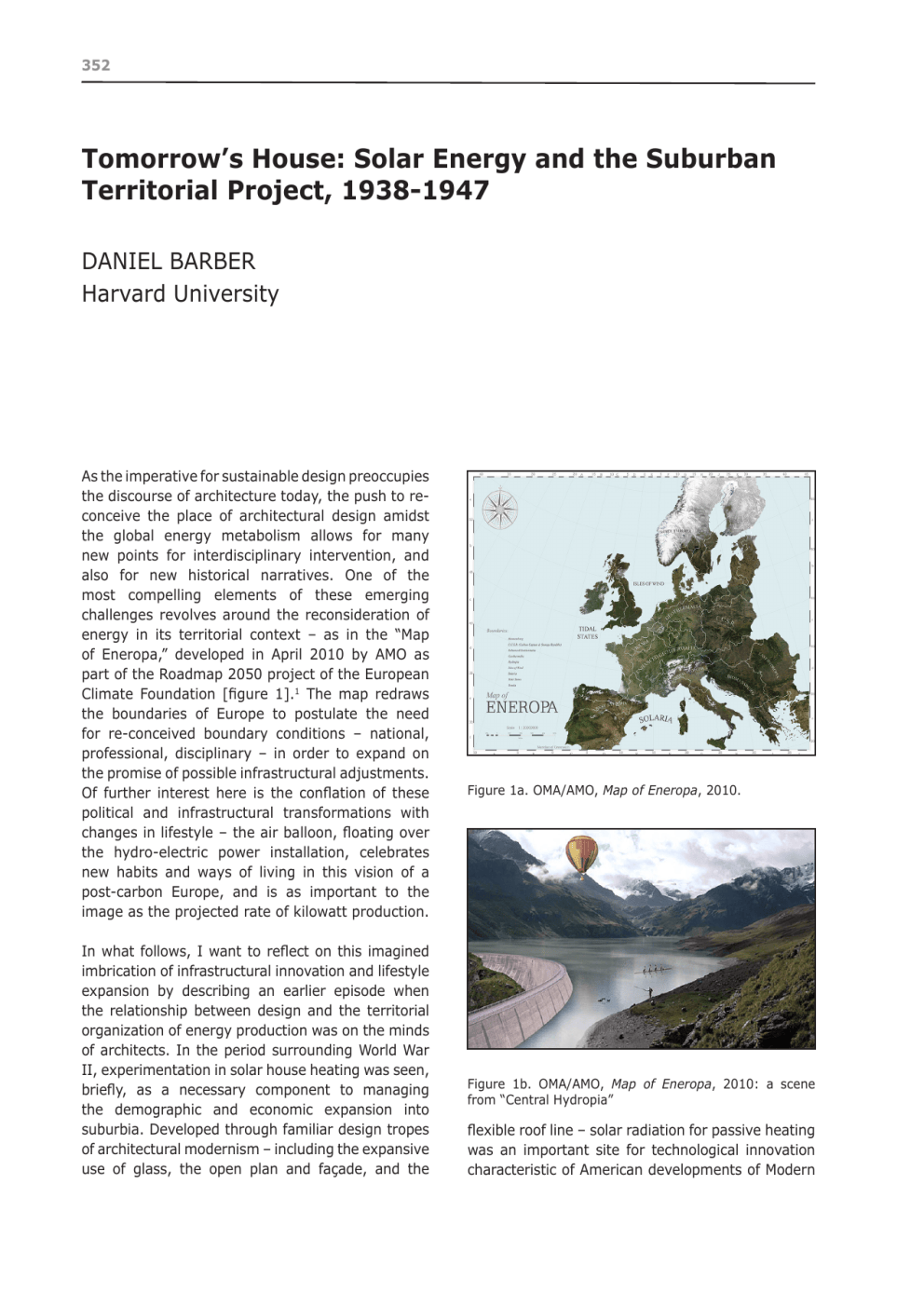 352 WHERE DO YOU STAND Tomorrow’s House: Solar Energy and the Suburban Territorial Project, 1938-1947 DANIEL BARBER Harvard University As the imperative for sustainable design preoccupies the discourse of architecture today, the push to reconceive the place of architectural design amidst the global energy metabolism allows for many new points for interdisciplinary intervention, and also for new historical narratives. One of the most compelling elements of these emerging challenges revolves around the reconsideration of energy in its territorial context – as in the “Map of Eneropa,” developed in April 2010 by AMO as part of the Roadmap 2050 project of the European Climate Foundation [figure 1].1 The map redraws the boundaries of Europe to postulate the need for re-conceived boundary conditions – national, professional, disciplinary – in order to expand on the promise of possible infrastructural adjustments. Of further interest here is the conflation of these political and infrastructural transformations with changes in lifestyle – the air balloon, floating over the hydro-electric power installation, celebrates new habits and ways of living in this vision of a post-carbon Europe, and is as important to the image as the projected rate of kilowatt production. In what follows, I want to reflect on this imagined imbrication of infrastructural innovation and lifestyle expansion by describing an earlier episode when the relationship between design and the territorial organization of energy production was on the minds of architects. In the period surrounding World War II, experimentation in solar house heating was seen, briefly, as a necessary component to managing the demographic and economic expansion into suburbia. Developed through familiar design tropes of architectural modernism – including the expansive use of glass, the open plan and façade, and the Figure 1a. OMA/AMO, Map of Eneropa, 2010. Figure 1b. OMA/AMO, Map of Eneropa, 2010: a scene from “Central Hydropia” flexible roof line – solar radiation for passive heating was an important site for technological innovation characteristic of American developments of Modern TOMORROW’S HOUSE Architecture in the period; it also allows us to expand on the relationship between the suburban house, its infrastructure, and the attendant geopolitical complications of energy provision. At stake is not only the excavation of a compelling historical precedent for architects exploring the global problematics of energy and the environment, but even more so the spatial and territorial implications of cultural practices. 1: “THE PROVEN MERITS OF THE SOLAR HOUSE” In order to arrive at the solar house and its infrastructural implications, we start with brief reference to a familiar episode: the Case Study House program, organized by the journal Arts and Architecture from 1945-1963. Widely considered “one of the landmark chapters in post-World War II architecture,” the Case Study houses are also seen by many as the moment when the international architectural discourse shifted its attention from Europe to the United States.2 In a 1989 appreciation of the program, Esther McCoy, who had chronicled the Case Study Houses from the early 50s, wrote as follows: 353 More than the indication of the poor judgment of the youthful architect, then, the “Greenbelt House” drawing is symptomatic of the heated debates over the ramifications of energy infrastructure that preoccupied politicians, technologists, and even some architects during World War II; we will return to it at some length below. Rapson, part of the generation of architects trained in modern design strategies by European émigrés in the late 30s was, like many of his colleagues, enmeshed in discussions of technological possibility. For our purposes today, Rapson operates as an effective guide to the expanded technological disposition of the modern house during the war – a disposition that, on the one hand, included the solar house as an important experimental component and that, on the other hand, directly connected technological experimentation in architecture to wartime debates over the infrastructure of energy and the need for new forms of living in the post-war future. The most innovative of the early projects was Ralph Rapson’s #4, of 1945, which he called a ‘greenbelt house’. It describes well the yearnings of mid 1940s. Rapson’s rendering of the house showed a helicopter hovering over the flat roof, as if the owner was coming home to the suburbs from his day at the office. His wife is waving to him. Where is she? Hanging out diapers in the drying yard. Rapson’s money was on the wrong machine. 3 Already, then, a trace of the contested social implications of technological innovations [figure 2]. While the clothes dryer soon replaced the drying yard as part of the post-war consumer boom in domestic appliances, Rapson’s gamble on the helicopter not only prefigures AMO’s air balloon but also registers a persistent hope, in the architectural discourse, for how the industrial war machine would be repurposed for peacetime uses – the domestic helicopter was a frequent image in wartime advertising as an “anticipatory tease” for the flowering of applied technology once atrocities, and the industrial engine that conditioned them, subsided.4 In this sense, aerial commutation was, like the solar house, a vision of the promise of modernity. Figure 2. Ralph Rapson, Case Study House #4: the Greenbelt House, 1945. Rapson trained at Cranbrook under Eliel Saarinen, graduating in 1939. He joined Saarinen’s office to work on Demountable Space, one of the more prominent pre-war attempts at designing a prefabricated building system. In 1941 Rapson left for Chicago, and entered the office of Keck and Keck Architects while also, as we will see below, working on a number of speculative projects. Rapson arrived in 354 WHERE DO YOU STAND Chicago just as George Fred Keck, th