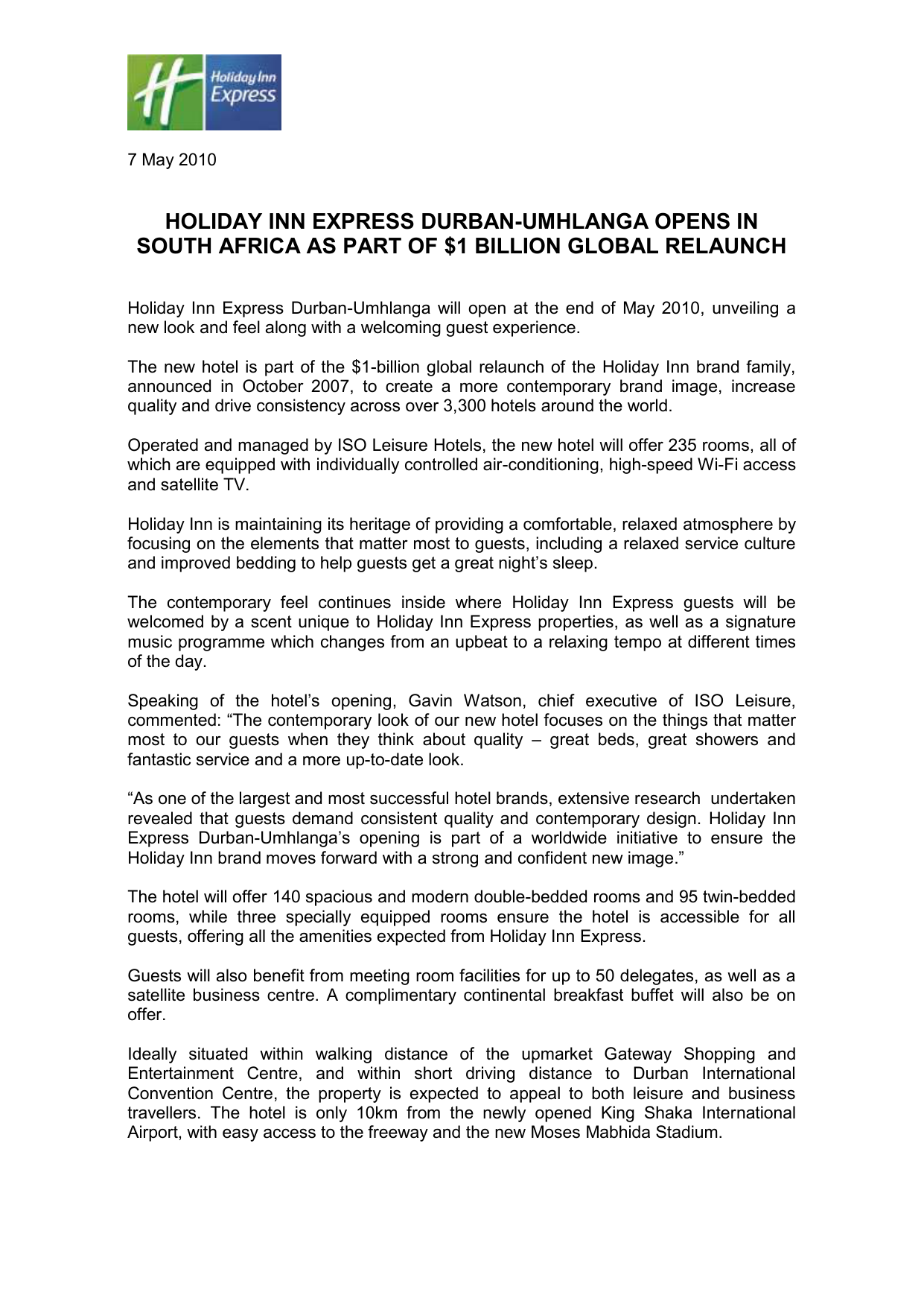 7 May 2010 HOLIDAY INN EXPRESS DURBAN-UMHLANGA OPENS IN SOUTH AFRICA AS PART OF $1 BILLION GLOBAL RELAUNCH Holiday Inn Express Durban-Umhlanga will open at the end of May 2010, unveiling a new look and feel along with a welcoming guest experience. The new hotel is part of the $1-billion global relaunch of the Holiday Inn brand family, announced in October 2007, to create a more contemporary brand image, increase quality and drive consistency across over 3,300 hotels around the world. Operated and managed by ISO Leisure Hotels, the new hotel will offer 235 rooms, all of which are equipped with individually controlled air-conditioning, high-speed Wi-Fi access and satellite TV. Holiday Inn is maintaining its heritage of providing a comfortable, relaxed atmosphere by focusing on the elements that matter most to guests, including a relaxed service culture and improved bedding to help guests get a great night’s sleep. The contemporary feel continues inside where Holiday Inn Express guests will be welcomed by a scent unique to Holiday Inn Express properties, as well as a signature music programme which changes from an upbeat to a relaxing tempo at different times of the day. Speaking of the hotel’s opening, Gavin Watson, chief executive of ISO Leisure, commented: “The contemporary look of our new hotel focuses on the things that matter most to our guests when they think about quality – great beds, great showers and fantastic service and a more up-to-date look. “As one of the largest and most successful hotel brands, extensive research undertaken revealed that guests demand consistent quality and contemporary design. Holiday Inn Express Durban-Umhlanga’s opening is part of a worldwide initiative to ensure the Holiday Inn brand moves forward with a strong and confident new image.” The hotel will offer 140 spacious and modern double-bedded rooms and 95 twin-bedded rooms, while three specially equipped rooms ensure the hotel is accessible for all guests, offering all the amenities expected from Holiday Inn Express. Guests will also benefit from meeting room facilities for up to 50 delegates, as well as a satellite business centre. A complimentary continental breakfast buffet will also be on offer. Ideally situated within walking distance of the upmarket Gateway Shopping and Entertainment Centre, and within short driving distance to Durban International Convention Centre, the property is expected to appeal to both leisure and business travellers. The hotel is only 10km from the newly opened King Shaka International Airport, with easy access to the freeway and the new Moses Mabhida Stadium. The global relaunch was announced in October 2007 and is on track to be completed by the end of 2010. As part of this process, all Express by Holiday Inn hotels will become Holiday Inn Express hotels to create global consistency. In the interim, as the hotels implement the relaunch, both the existing and new Holiday Inn brand family identities will be used. For more information regarding the relaunch, click here or visit the site at www.ihg.com/corporate. For more information or to make a reservation visit www.IGH.COM Media enquiries: Dani Isaacs on +27 21 465 1345 or +27 83 308 6260 or email: [email protected] About the Holiday Inn Relaunch: The Holiday Inn relaunch focuses on the things that matter most to guests – a contemporary hotel with efficient, friendly service offering a great night’s sleep. Relaunched hotels feature: Upgraded and de-cluttered lobby areas A Holiday Inn scent and sound New bedding Upgraded showers and bathroom amenities New exterior lighting and landscaping New signage with the redesigned logo All Holiday Inn employees undergo an extensive “Stay Real” training programme to ensure guests receive the level of service they expect The Holiday Inn brand was founded by Kemmons Wilson in 1952 with the first hotel opening in Memphis, Tennessee. Fifty eight years on, Holiday Inn and Holiday Inn Express exist in 100 countries worldwide and welcome over 100-million people every year. To showcase its hospitality and expertise worldwide, Holiday Inn has been named as the official hotel services provider to the London 2012 Olympic and Paralympics Games. As a sponsor, Holiday Inn will be providing expertise in accommodation and services before and during the Games. About InterContinental Hotels Group: InterContinental Hotels Group (IHG) [LON:IHG, NYSE:IHG (ADRs)] is the world's largest hotel group by number of rooms. IHG owns, manages, leases or franchises, through various subsidiaries, over 4,400 hotels and more than 645,000 guest rooms in 100 countries and territories around the world. The Group owns a portfolio of wellrecognised and respected hotel brands including InterContinental Hotels & Resorts, Hotel Indigo, Crowne Plaza Hotels & Resorts, Holiday Inn Hotels and Resorts, Holiday Inn Express, Staybridge Suites and Candlewood Suites and also manages the world's largest hotel loyalty programme, Priority Club Rewards, with 48-million members worldwide. IHG has 1,400 hotels in its development pipeline, which will create 140,000 jobs worldwide over the next few years. InterContinental Hotels Group PLC is the Group’s holding company and is incorporated in Great Britain and registered in England and Wales. IHG offers information and online reservations for all its hotel brands at www.ihg.com and information for the Priority Club Rewards programme at www.priorityclub.com. For the latest news from IHG, visit our online Press Office at www.ihg.com/media About ISO Leisure Holdings (Pty) ISO Leisure Holdings (Pty) Ltd is a leading leisure industry developer and operator established in 2007. Its principal shareholders include Amabubesi Investments (Pty) Ltd and a consortium of South African investors. Gavin Watson is Chief Executive and Gary Foster the Group Operations Director. ISO Leisure Holdings (Pty) Ltd has signed an exclusive franchise agreement with InterContinental Hotel Group 