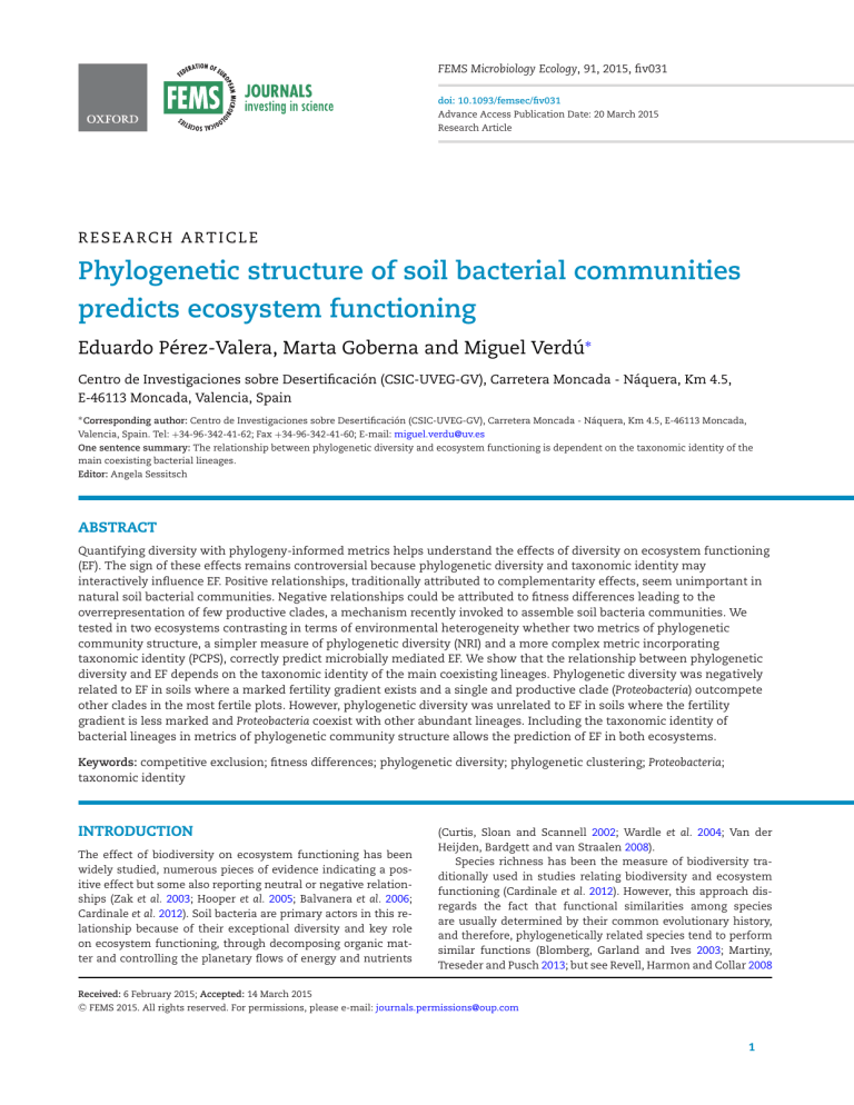 FEMS Microbiology Ecology, 91, 2015, fiv031 doi: 10.1093/femsec/fiv031 Advance Access Publication Date: 20 March 2015 Research Article RESEARCH ARTICLE Phylogenetic structure of soil bacterial communities predicts ecosystem functioning Eduardo Pérez-Valera, Marta Goberna and Miguel Verdú∗ Centro de Investigaciones sobre Desertificación (CSIC-UVEG-GV), Carretera Moncada - Náquera, Km 4.5, E-46113 Moncada, Valencia, Spain ∗ Corresponding author: Centro de Investigaciones sobre Desertificación (CSIC-UVEG-GV), Carretera Moncada - Náquera, Km 4.5, E-46113 Moncada, Valencia, Spain. Tel: +34-96-342-41-62; Fax +34-96-342-41-60; E-mail: [email protected] One sentence summary: The relationship between phylogenetic diversity and ecosystem functioning is dependent on the taxonomic identity of the main coexisting bacterial lineages. Editor: Angela Sessitsch ABSTRACT Quantifying diversity with phylogeny-informed metrics helps understand the effects of diversity on ecosystem functioning (EF). The sign of these effects remains controversial because phylogenetic diversity and taxonomic identity may interactively influence EF. Positive relationships, traditionally attributed to complementarity effects, seem unimportant in natural soil bacterial communities. Negative relationships could be attributed to fitness differences leading to the overrepresentation of few productive clades, a mechanism recently invoked to assemble soil bacteria communities. We tested in two ecosystems contrasting in terms of environmental heterogeneity whether two metrics of phylogenetic community structure, a simpler measure of phylogenetic diversity (NRI) and a more complex metric incorporating taxonomic identity (PCPS), correctly predict microbially mediated EF. We show that the relationship between phylogenetic diversity and EF depends on the taxonomic identity of the main coexisting lineages. Phylogenetic diversity was negatively related to EF in soils where a marked fertility gradient exists and a single and productive clade (Proteobacteria) outcompete other clades in the most fertile plots. However, phylogenetic diversity was unrelated to EF in soils where the fertility gradient is less marked and Proteobacteria coexist with other abundant lineages. Including the taxonomic identity of bacterial lineages in metrics of phylogenetic community structure allows the prediction of EF in both ecosystems. Keywords: competitive exclusion; fitness differences; phylogenetic diversity; phylogenetic clustering; Proteobacteria; taxonomic identity INTRODUCTION The effect of biodiversity on ecosystem functioning has been widely studied, numerous pieces of evidence indicating a positive effect but some also reporting neutral or negative relationships (Zak et al. 2003; Hooper et al. 2005; Balvanera et al. 2006; Cardinale et al. 2012). Soil bacteria are primary actors in this relationship because of their exceptional diversity and key role on ecosystem functioning, through decomposing organic matter and controlling the planetary flows of energy and nutrients (Curtis, Sloan and Scannell 2002; Wardle et al. 2004; Van der Heijden, Bardgett and van Straalen 2008). Species richness has been the measure of biodiversity traditionally used in studies relating biodiversity and ecosystem functioning (Cardinale et al. 2012). However, this approach disregards the fact that functional similarities among species are usually determined by their common evolutionary history, and therefore, phylogenetically related species tend to perform similar functions (Blomberg, Garland and Ives 2003; Martiny, Treseder and Pusch 2013; but see Revell, Harmon and Collar 2008 Received: 6 February 2015; Accepted: 14 March 2015 C FEMS 2015. All rights reserved. For permissions, please e-mail: [email protected] 1 2 FEMS Microbiology Ecology, 2015, Vol. 91, No. 5 for other processes producing trait resemblance among close relatives). This is the reason why phylogenetically informed measures of diversity tend to be more informative than traditional richness measures (Lozupone and Knight 2007; Cadotte, Cardinale and Oakley 2008). Empirical evidence on the effect of phylogenetic diversity on ecosystem functioning is widespread across the tree of life (e.g. bacteria, Gravel et al. 2012; fungi, Maherali and Klironomos 2007; plants, Cadotte, Cardinale and Oakley 2008; Cadotte 2013; Navarro-Cano et al. 2014). Most of these studies have found a positive relationship between phylogenetic diversity and ecosystem functioning parameters, as expected when distantly related taxa perform complementary functions. However, neutral and negative relationships have also been described, particularly in bacteria, because phylogenetic diversity and taxonomic diversity may interactively influence ecosystem functioning (Severin, Östman and Lindström 2013; Venail and Vives 2013). Phylogenetic diversity of bacterial communities in soils is low compared to those in other natural environments, contrasting with their extremely high species richness and diversity (Lozupone and Knight 2007). This paradoxical situation could be explained by adding a phylogenetic context to the modern coexistence theory (Chesson 2000; Mayfield and Levine 2010; HilleRisLambers et al. 2012; Godoy, Kraft and Levine 2014). The phylogenetic structure of soil bacterial communities is primarily driven by abiotic factors, such as acidity (Jones et al. 2009) and availability of organic resources (Goberna, Garcı́a and Verdú 2014), that overrepresent certain clades. The composition of ecological communities is further determined by the balance between mechanisms shaping niche differences and fitness differences between lineages (Chesson 2000). Coexistence is maximized under large niche differences (i.e. absence of niche overlap), a situation where species do not compete for resources. This increases both diversity and productivity since the functional complementarity of coexisting organisms allows a more complete usage of reso