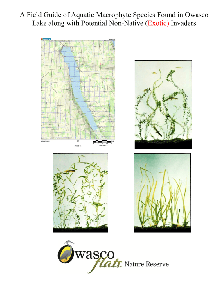 A Field Guide of Aquatic Macrophyte Species Found in Owasco Lake along with Potential Non-Native (Exotic) Invaders This Field Guide is dedicated to Pam Sullivan, former President of the Owasco Lake Homeowners Association. Pam as a resident on Owasco Lake strived to raise awareness of Owasco’s water quality through education of the Lake’s many stakeholders. In the sprite of raising water quality awareness, this guide for Owasco Lake stakeholders provides examples of submersed or floating native aquatic plants that are very important for a healthy Owasco Lake ecosystem. An abundant diverse population of native macrophytes in the littoral zone of Owasco Lake provides valuable habitat for waterfowl, fish and invertebrates. Macrophytes also provide the very important function of breaking wind driven wave action that re-suspends bottom sediments as well as eroding the shoreline. This guide does not address the identification of the problematic excessive growth of the other major plant group in the lake, phytoplankton, mostly blue-green algae or cyanobacteria. The dense algae blooms seen most often from mid to late summer are responding to excessive nutrients in the water column and can have a much greater impact on the use of Owasco Lake than excessive macrophyte growth. While most macrophytes can secure an unlimited supply of nutrients from the bottom sediments for their growth, the phytoplankton consumes their nutrients from the water column. Therefore, for stakeholders to limit excessive algae blooms in Owasco Lake, nutrients from the watershed need to be limited. Support for this publication came from a grant from Parks & Trails New York www.ptny.org, the Owasco Flats Nature Reserve http://owascoflatsnaturereserve.blogspot.com/, numerous volunteers, Cornell University Research Ponds and Racine-Johnson Aquatic Ecologists. 1 The following plant photographs and descriptions are an introduction to higher aquatic plant (macrophyte) identification for Owasco Lake stakeholders. The purpose of this plant summary is to inform lakeshore residents, anglers, and other recreational users about the different types of submersed and floating aquatic plants in contrast to the phytoplankton algae that they may encounter while at the lake. This booklet is not a taxonomic text for identification of specific plant species. You can use several excellent books listed in the references for a more in-depth study of submersed and floating aquatic plants, many of which are in Owasco Lake. We do not include emergent wetland plants that are very common in the Owasco watershed. We encourage lake users to associate names with the plants they encounter while on the lake. Our goal is to promote a public understanding that not all aquatic plants are a nuisance and that, in fact, most are beneficial to the lake ecosystem. We include native plants that are indigenous to the surrounding area and to New York State. Native plants species are essential to the health of the lake. While at times these plants may become overabundant and detract from the utility of the lake, we usually find them at low densities and not an impediment to recreation. A high diversity and moderate density of native plants is the most favorable plant mix for the lake’s ecosystem. We also include non-native (exotic) plants that are not native to Owasco and neighboring lakes, but some are in Owasco Lake while others could invade in the future. These plants deserve special attention because many become over abundant and will push out desirable native species. These plants do provide important habitat for very large populations of invertebrates and small fish. However, we do not list the habitat value of these exotic plants because the potential for a negative impact on the Owasco Lake ecosystem from these plant species is often high. We include some non-native (exotic) plant species not in Owasco Lake and these are species that stakeholders need to be on the lookout for. These plant species have the potential to adapt and may enter Owasco Lake at sometime in the future and that introduction needs documentation and possible action. While this plant grouping is in no way an encyclopedia of aquatic plants and does not include all of the species found in Owasco Lake, it is an important tool for the public to use to identify major higher plant species (macrophytes) in the lake. The following plant pictorial summary depicts natives with a black label and non-natives have red labels. We note in the field guide the plant species commonly found in Owasco Lake. Photos and text by Robert L. Johnson, Senior Aquatic Biologist at the Cornell University Research Ponds, Ecology and Evolutionary Biology Department, Corson Hall, Cornell University, Ithaca, NY 14853. January 2011 2 Native Aquatic Plants are plants indigenous to the area and NYS Ceratophyllum demersum – Coontail 4 Chara vulgaris - Chara, muskgrass 5 Elodea sp. (E. canadensis, E. nuttallii) - Elodea, waterweed 6 Lemna minor - Common duckweed, lesser duckweed 7 Lemna trisulca - Forked duckweed, star duckweed, ivy leaf duckweed 8 Myriophyllum heterophyllum - Variable watermilfoil 9 Myriophyllum sibiricum - Northern watermilfoil 10 Najas flexilis - Slender/bushy naiad 11 Najas guadalupensis - Southern naiad 12 Nymphaea odorata - White water lily 13 Potamogeton amplifolius - Large-leaf pondweed, bass weed and musky weed 14 Potamogeton foliosus - Leafy pondweed 15 Potamogeton nodosus - Long-leaf pondweed 16 Potamogeton pusillus - Small pondweed 17 Ranunculus longirostris – Stiff white water buttercup/crowfoot 18 Spirodela polyrhiza - Great duckweed 19 Stuckenia vaginata - Sheathed pondweed 20 Vallisneria americana - Wild celery, eel grass, tape grass 21 Wolffia Columbiana - Common water meal 22 Zosterella dubia - Water stargrass 23 Non-Native Plants (Exotic) Cabomba caroliniana Fanwort 24 Egeria densa - Brazilian elodea 25 Hydrilla verticillata – Hydrilla 26 Myriophyllum spicatum - Eurasian watermilfoil
