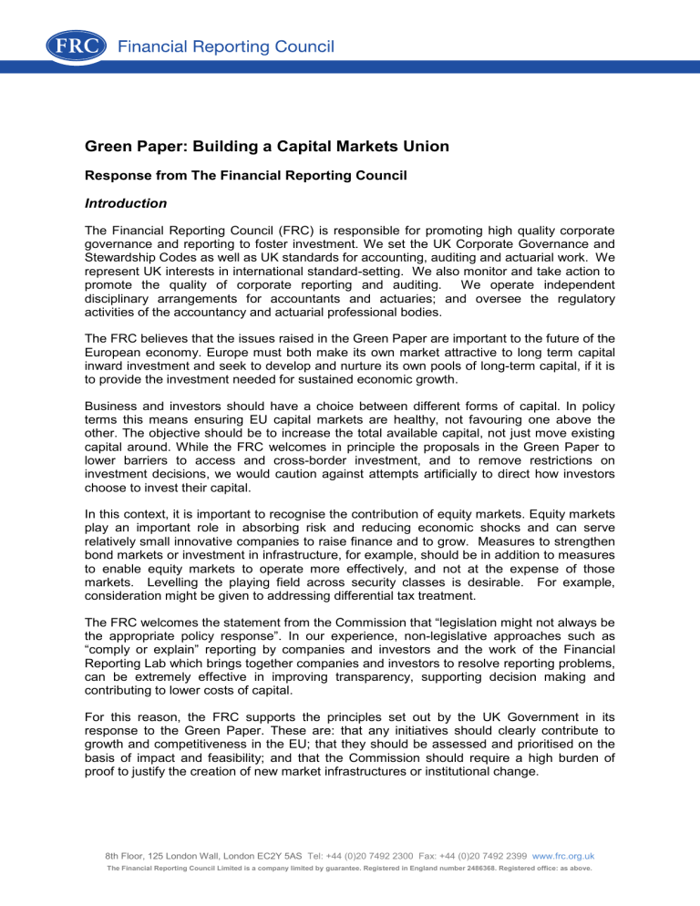 Green Paper: Building a Capital Markets Union Response from The Financial Reporting Council Introduction The Financial Reporting Council (FRC) is responsible for promoting high quality corporate governance and reporting to foster investment. We set the UK Corporate Governance and Stewardship Codes as well as UK standards for accounting, auditing and actuarial work. We represent UK interests in international standard-setting. We also monitor and take action to promote the quality of corporate reporting and auditing. We operate independent disciplinary arrangements for accountants and actuaries; and oversee the regulatory activities of the accountancy and actuarial professional bodies. The FRC believes that the issues raised in the Green Paper are important to the future of the European economy. Europe must both make its own market attractive to long term capital inward investment and seek to develop and nurture its own pools of long-term capital, if it is to provide the investment needed for sustained economic growth. Business and investors should have a choice between different forms of capital. In policy terms this means ensuring EU capital markets are healthy, not favouring one above the other. The objective should be to increase the total available capital, not just move existing capital around. While the FRC welcomes in principle the proposals in the Green Paper to lower barriers to access and cross-border investment, and to remove restrictions on investment decisions, we would caution against attempts artificially to direct how investors choose to invest their capital. In this context, it is important to recognise the contribution of equity markets. Equity markets play an important role in absorbing risk and reducing economic shocks and can serve relatively small innovative companies to raise finance and to grow. Measures to strengthen bond markets or investment in infrastructure, for example, should be in addition to measures to enable equity markets to operate more effectively, and not at the expense of those markets. Levelling the playing field across security classes is desirable. For example, consideration might be given to addressing differential tax treatment. The FRC welcomes the statement from the Commission that “legislation might not always be the appropriate policy response”. In our experience, non-legislative approaches such as “comply or explain” reporting by companies and investors and the work of the Financial Reporting Lab which brings together companies and investors to resolve reporting problems, can be extremely effective in improving transparency, supporting decision making and contributing to lower costs of capital. For this reason, the FRC supports the principles set out by the UK Government in its response to the Green Paper. These are: that any initiatives should clearly contribute to growth and competitiveness in the EU; that they should be assessed and prioritised on the basis of impact and feasibility; and that the Commission should require a high burden of proof to justify the creation of new market infrastructures or institutional change. 8th Floor, 125 London Wall, London EC2Y 5AS Tel: +44 (0)20 7492 2300 Fax: +44 (0)20 7492 2399 www.frc.org.uk The Financial Reporting Council Limited is a company limited by guarantee. Registered in England number 2486368. Registered office: as above. These same tests should be applied to existing EU requirements, and any that create unjustified barriers to investment or market access should be revised or removed. The FRC welcomes the Commission’s decision to review the Prospectus Directive, and endorses the list of priority issues to be considered set out in the UK Financial Conduct Authority’s response to that consultation. Specific answers Our answers to the specific questions in which we have a direct interest are set out below Question 8: Is there value in developing a common EU level accounting standard for small and medium-sized companies listed on MTFs? Should such a standard become a feature of SME growth markets? If so, under which conditions? The FRC is not persuaded that the need for new EU wide accounting standards or credit reporting requirements for unlisted SMEs has been demonstrated. If there is clear evidence to suggest that such an accounting standard would enable such entities to attract more cross-border investment, we suggest that the Commission seek to use established standards as a base. Investors place a value on comparability. Consideration could be given to using an IFRS recognition and measurement framework with reduced disclosures (an “IFRS minus” basis). Alternatively making the IFRS for SMEs available for use in the EU with modifications as appropriate (an “IFRS for SMEs plus” basis) may provide a proportionate solution. We have incorporated both bases into UK GAAP. We have developed a new national accounting standard for those entities that do not apply full IFRS. We have used the IFRS for SMEs as the starting point and made modifications to ensure that the standard is suitable for a range of entities as well as being consistent with the law. For entities in a group which prepares consolidated accounts on an IFRS basis when preparing their individual company accounts we have introduced a separate standard which allows them to apply IFRS policies but with reduced disclosures. We have recently undertaken a project to consider the quality of reporting by such companies (including those on the AIM growth market as well as those listed on the Main Market of the London Stock Exchange), the full results of which will be published in June. One of the questions considered as part of the project was whether the reporting regime, and in particular the requirement to report under IFRS, is appropriate for smaller listed companies or whether there is any appetite for a less complex accounting framework such as UK GAAP. The overwhelming response we have received is that IFRS recognit