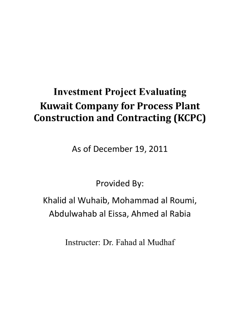 Investment Project Evaluating Kuwait Company for Process Plant Construction and Contracting (KCPC) As of December 19, 2011 Provided By: Khalid al Wuhaib, Mohammad al Roumi, Abdulwahab al Eissa, Ahmed al Rabia Instructer: Dr. Fahad al Mudhaf Summary and Recommendation: Stock Price: 300 fils Fundamental Vale: 305 fils Recommendation: (Hold and don’t Buy) Based on our investigation of the stocks value we recommend to hold this stock and wait for further market reaction but: 1- (Buy if): if price reaches 325 fils by January or 300 by February 2- (Short sell if): if Price decreased by 5% Based on the following premise: - Fundamentally: the price is between 292 fils and 319 fils. But should check on 2011 annual sales growth and check if earning provide higher fundamental Value because there is a current decrease in earnings due decrease in sales. - Technical: There is current downward trend unbroken with a current resistance of 325 fils and a 300 fils by February. Company Overview: The Kuwait Company for Process Plant Construction and Contracting (KCPC) is a Kuwaiti based company (The Parent Company) and also owned subsidiaries K.C.P.C Construction in Dubai, United Arab Emirates and Mass International Company In Oman. The main line of business of KCPC is divided into two categories: contracting and commercial, but it is more focused on the contracting. The objective of the company is to civil, mechanical and electrical engineering and also maintenance contracting, also another objective of KCPC is the installation and maintenance of elevators, swimming pools, water treatment and fire alarm equipment, and there assets also consist of ownership of real estate and land, and also they invest in surplus funds through portfolio managers. The Parent Company is listed in the Kuwait Stock Exchange under the services sector. The KCPC have a strong asset base and they have cash on hand, demand and time deposit with maturities less than 3 months which classified as cash equivalents, also there inventories are valued at the lower of weighted average cost and net realizable value , also they have investment property such as land and building which is meant for long term rental yield and not occupied by the Group ,and their property plant and equipment are stated at historic cost less accumulated depreciation and accumulated impairment loss. Also the company have intangible assets and they are measured at cost on original recognition, and the Group have post employment benefit as they are liable under various labor laws including the Kuwait Labor Law and Labor Law of the countries which the Group subsidiaries operates. As it was mentioned above, KCPC has a number of strength points that should be pointed out and it may be indicators of the company's performance in the following years, the company owns subsidiaries in both of Oman and Dubai, which are both emerging markets, and should the industrial sector in both countries are recovering, the company will be exposed to a great investing opportunities, it also enjoys an excellent management that earned it the ISO 9001:2008. Moving on to the weaknesses unfortunately the company suffered greatly, along with any other company in the same sector from the mortgage crisis which dropped the sales of the company greatly, also in the same matter the Dubai market which it owns a subsidiary as well suffered more from the crisis. If we are to discuss opportunities, on a national level the parliament has successfully agreed to the Kuwait development plan which aims to transfer Kuwait into a trading and financial hub, in particular the construction of Silk city, Kuwait new airport (terminal two) and the new University in the city of Shedadiah, this opens a new horizon for the company to expand its operations on both the contraction side as well as the commercial services the company provides. As for the threats facing the company it's still hasn't recovered from the mortgage crisis in 2008, all the indicators in fact are stating that the performance of the company is going on a downward sloping path, and also unfortunately the political system in Kuwait isn't stable enough to carry the Kuwait development plan successfully. Industry Analysis: Kuwait’s economy preview: According to CIA world fact book from 2010 estimation, Kuwait’s GDP is composed of 48% on the industrial sector and 51.7% on the services sector, Kuwait is a rich of crude oil, it owns about 9% of the world reserve of oil. In pre 2008 crisis year Kuwait’s growth has been witnessing a steady growth but unfortunately Kuwait’s economy has been exposed and affected from the 2008 economic crisis resulted from the U.S., according to Global Kuwait’s Economy overview, Kuwait’s nominal GDP trend took a hard fall from 23% increase in nominal GDP to a decrease of 21%, which took a toll in every economic indicators and the triggering a decline in Equity, real estate and oil prices which slowed the economy down in the year 2009, although in the recent years 2010-2011 nominal GDP is showing an improvement and a positive growth as well as real GDP. Kuwait is currently trying to reduce the dependence of exporting crude oil as the main source of income of the country, and because of that the parliament has successfully approved KDP (the Kuwait Development plan), which allows the government to spend about 135bn USD (37bn KD) in order to revive Kuwait’s economy that has been suffering from recessionary pressures resulted from 2008 crisis, and it’s the first part towards the 2035 Kuwait vision, which aims to make Kuwait the Financial and trade center for investment. The KDP ‘s goal is to diversify Kuwait’s economy away from the dependence of crude oil only; the plan has about 1000 projects that will be either in private sector and government, it should be noted that the private sector would follow the B.O.T. (Build, own, transfer) scheme in handling those projects. KDP largest projects include: Industry Anal