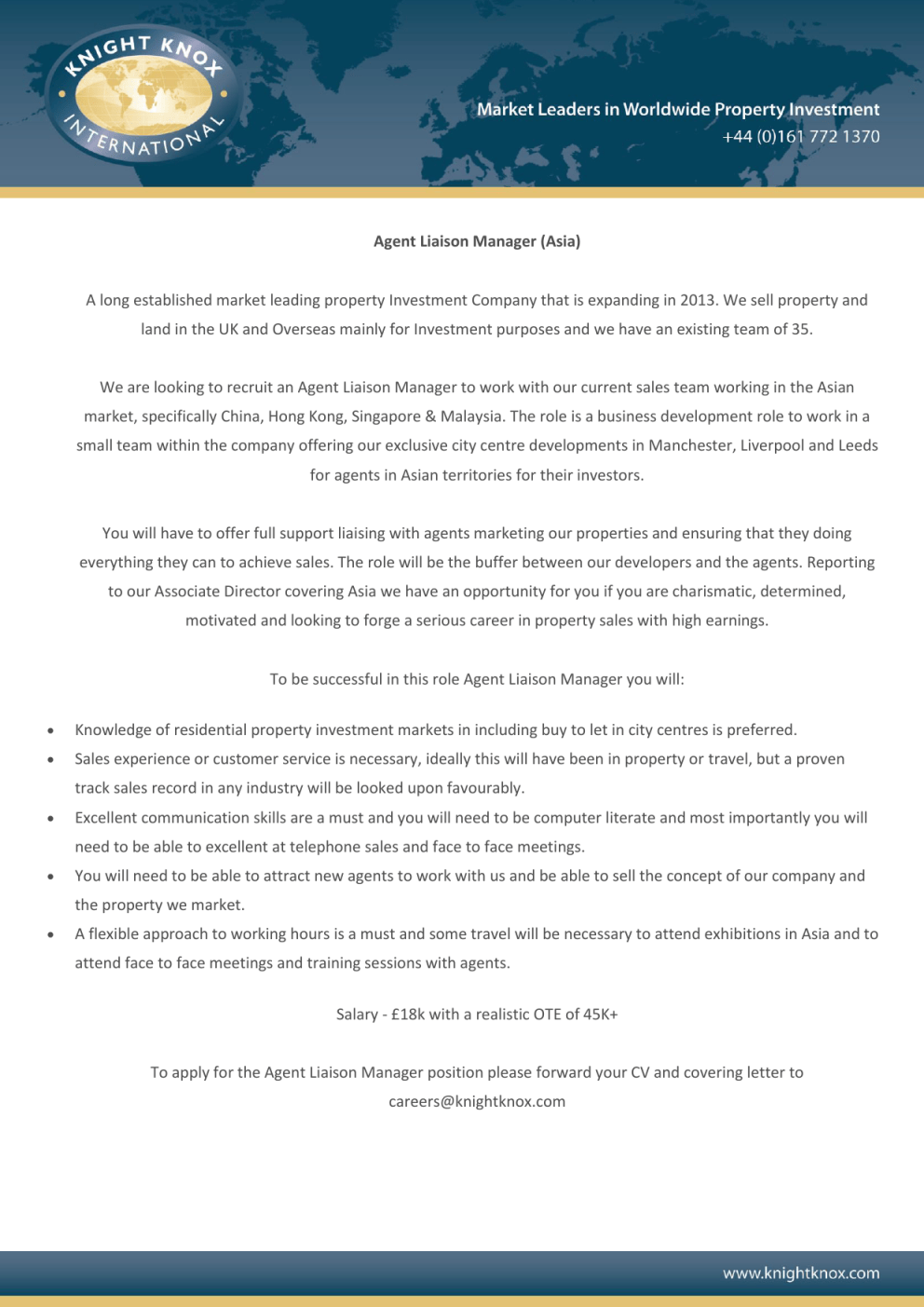 Agent Liaison Manager (Asia) A long established market leading property Investment Company that is expanding in 2013. We sell property and land in the UK and Overseas mainly for Investment purposes and we have an existing team of 35. We are looking to recruit an Agent Liaison Manager to work with our current sales team working in the Asian market, specifically China, Hong Kong, Singapore & Malaysia. The role is a business development role to work in a small team within the company offering our exclusive city centre developments in Manchester, Liverpool and Leeds for agents in Asian territories for their investors. You will have to offer full support liaising with agents marketing our properties and ensuring that they doing everything they can to achieve sales. The role will be the buffer between our developers and the agents. Reporting to our Associate Director covering Asia we have an opportunity for you if you are charismatic, determined, motivated and looking to forge a serious career in property sales with high earnings. To be successful in this role Agent Liaison Manager you will: Knowledge of residential property investment markets in including buy to let in city centres is preferred. Sales experience or customer service is necessary, ideally this will have been in property or travel, but a proven track sales record in any industry will be looked upon favourably. Excellent communication skills are a must and you will need to be computer literate and most importantly you will need to be able to excellent at telephone sales and face to face meetings. You will need to be able to attract new agents to work with us and be able to sell the concept of our company and the property we market. A flexible approach to working hours is a must and some travel will be necessary to attend exhibitions in Asia and to attend face to face meetings and training sessions with agents. Salary - £18k with a realistic OTE of 45K+ To apply for the Agent Liaison Manager position please forward your CV and covering letter to [email protected]