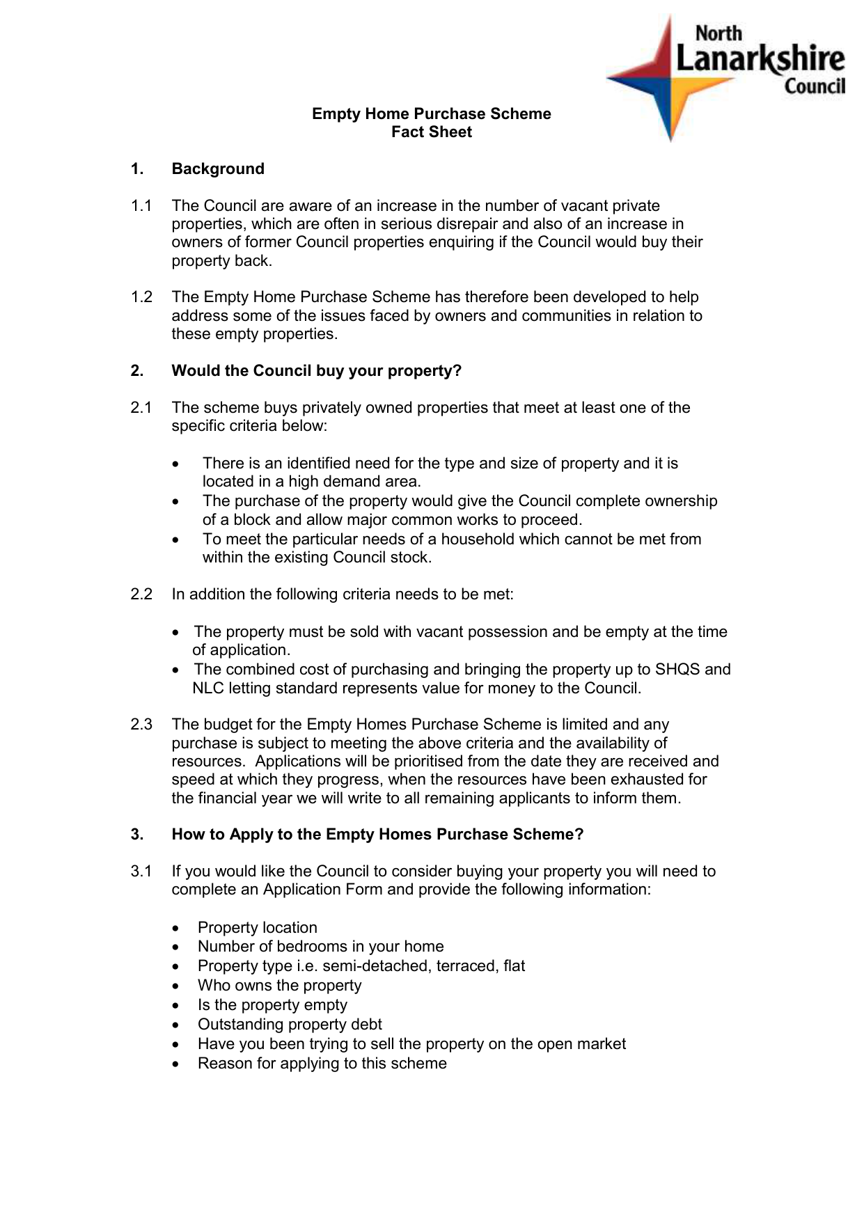 Empty Home Purchase Scheme Fact Sheet 1. Background 1.1 The Council are aware of an increase in the number of vacant private properties, which are often in serious disrepair and also of an increase in owners of former Council properties enquiring if the Council would buy their property back. 1.2 The Empty Home Purchase Scheme has therefore been developed to help address some of the issues faced by owners and communities in relation to these empty properties. 2. Would the Council buy your property? 2.1 The scheme buys privately owned properties that meet at least one of the specific criteria below: 2.2 There is an identified need for the type and size of property and it is located in a high demand area. The purchase of the property would give the Council complete ownership of a block and allow major common works to proceed. To meet the particular needs of a household which cannot be met from within the existing Council stock. In addition the following criteria needs to be met: The property must be sold with vacant possession and be empty at the time of application. The combined cost of purchasing and bringing the property up to SHQS and NLC letting standard represents value for money to the Council. 2.3 The budget for the Empty Homes Purchase Scheme is limited and any purchase is subject to meeting the above criteria and the availability of resources. Applications will be prioritised from the date they are received and speed at which they progress, when the resources have been exhausted for the financial year we will write to all remaining applicants to inform them. 3. How to Apply to the Empty Homes Purchase Scheme? 3.1 If you would like the Council to consider buying your property you will need to complete an Application Form and provide the following information: Property location Number of bedrooms in your home Property type i.e. semi-detached, terraced, flat Who owns the property Is the property empty Outstanding property debt Have you been trying to sell the property on the open market Reason for applying to this scheme 3.2 This information will be used to assess your application and we will then contact you to let you know if your property meets the criteria. 4. What happens next? 4.1 If your property meets the eligibility criteria then we will arrange for Council staff to attend your property to consider the market value and repairs or maintenance required to meet the Scottish Housing Quality Standard and the North Lanarkshire Letting Standard. This information will be used to assist the Council’s Valuer to come to a decision about the value of your property. The Council will then carry out a value for money assessment on your property to ensure we are making best use of our limited resources. 4.2 If the value for money assessment is successful then we will contact you to arrange making an offer on your property. 5. Selling your property to the Council 5.1 If you agree to sell your property to the Council you will need to appoint an independent Solicitor to act on your behalf. 5.2 If your property has been marketed for sale from 1 December 2008 you are required by law to provide a valid Home Report to the purchaser (the Council in this case), if your property has been up for sale since before this date or you have never marketed the property then there will be no requirement for a Home Report. 5.3 The Council will carry out their own valuation of your property, however, you can also obtain an independent valuation at your own expense if you wish. 5.4 In addition it is essential that any property purchased under this Scheme will be purchased with vacant possession. 6. Contact Details 6.1 Catriona Arbuckle Empty Homes Officer 4th Floor, Dalziel Building Scott Street Motherwell ML1 1SX Telephone: 01698 274105 Fax: 01698 403005 Email: [email protected]