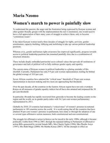 Maria Nzomo Women’s march to power is painfully slow To understand the passion, the anger and the frustration being expressed by Kenyan women and other gender-friendly groups with the implementation the new Constitution, one would need to have a full appreciation of their many years of struggle to achieve them; only to become “contentious issues”. It has taken Kenyan women nearly three decades of struggle for rights, activism, gender sensitisation, capacity-building, lobbying and mobilising to take up various political leadership positions. Whereas civic, gender and human rights awareness has improved significantly, progress towards access to political leadership positions has remained painfully slow due to a combination of structural obstacles. These include deeply embedded patriarchal socio-cultural values that pervade all institutions of governance and lack of political will to fully embrace gender equity and equality. The current status of Kenyan women in political leadership is a glaring reminder of this shortfall. Currently, Parliament has only 9.9 per cent women representation; trailing far behind the global average of 18.8 per cent. Seven African countries have attained the “critical mass” threshold of 30 per cent women representation in decision-making and two more are approaching that threshold. Over the past decade, all the countries in the Eastern African region have not only overtaken Kenya on all measures of gender equality indices but all have also attained and surpassed the 30 per cent threshold. In particular, Rwanda has rapidly recovered from genocide to become the leading country in the region and the world, on its gender parity index with 56.3 per cent women parliamentary representation by 2011. Globally by 2010, 25 countries had attained a “critical mass” of women’s presence in national parliaments in 189 countries across the world. It is worth noting that all the countries that have attained 30 per cent women’s presence in parliament, have done so through the adoption of one or several types affirmative action measures, both constitutional and non-constitutional. The struggle for affirmative action in Kenya can be traced to the early 1990s, although it became politically visible from 1996 to 2007, through the repeated tabling in Parliament of affirmative action Bills sponsored by several female MPs: Mrs Charity Ngilu (1996); Mrs Phoebe Asiyo (1997), Mrs Beth Mugo (2000); Ms Martha Karua (2007). All the attempts to effect an affirmative action law were rejected on flimsy “technical” grounds by predominantly male parliaments. Finally, in August 2010, 20 years of struggle for a new constitution yielded most of the gains that were the reasons for the struggle for a new constitution: equality of rights, duties and freedoms between women and men; removal of all forms of discrimination in both legal and social practice and equal opportunities in political, economic, cultural and social spheres. On representation generally, the Constitution clearly provides in various articles including (27(6) and (8), 56, 81(b), 100(a) and 197(1), that the principle of affirmative action which requires that no more than two thirds of one gender occupies elective and appointive public positions would be adhered to and operationalised through appropriate legislation. Bill of Rights The Bill of Rights entrenches this requirement and obligates the State to make appropriate legislative and other enactments to give full effect to the principle of affirmative action. Other specific gender rights include: outlawing retrogressive socio-cultural practices that violate women’s rights such as forced marriages, wife inheritance, female genital mutilation, rape within marriage and others. Given the constitutional harvest, for a while following the promulgation of the new Constitution, there was a distinct sense of relief and achievement, as gender-friendly groups counted their gains and recited the various socio-economic and political benefits. But even as celebration was in the air, some gender analysts were cautioning that some of the shortcomings in the new Constitution in respect to women and gender rights could pose problems during the implementation process, notably: the merger of the gender and equality commission (that was expected to monitor and ensure the implementation of gender-related laws) with the national commission for human rights; the anomaly between the two-thirds gender balance principle, as contained in Articles 27 and 81, and the contradictory provisions of Articles 97 and 98, that specify composition and membership of Parliament and Senate by gender, but with numbers that fall way short of the two-thirds principle. With no inbuilt mechanism to ensure the realisation of this principle the implementation of the “no more than two thirds of either gender” principle was doomed to be problematic from the outset. The celebration witnessed on that momentous promulgation day on August 27, 2010 have been replaced by a certain sense of sobriety and frustration over the slow process and in some cases what appears like deliberate attempts to reverse the gains in the Constitution through a distorted implementation process or constitutional amendment, as is being suggested now, in respect to the “no more than two thirds” principle. It seems to me that with the current political tinkering with the implementation of the two thirds principle, the history of affirmative action during 1990-2007, may be repeating itself; with strikingly similar language being used to block the enactment of the two thirds representation principle. This time around, we are being told that despite the efforts made by women’s groups and female MPs to engineer two viable formulae for resolving the constitutional anomaly, the Cabinet has chosen to ignore these, in favour of the more politically expedient path, as communicated to the public by the Presidential Press Service. It seems that t