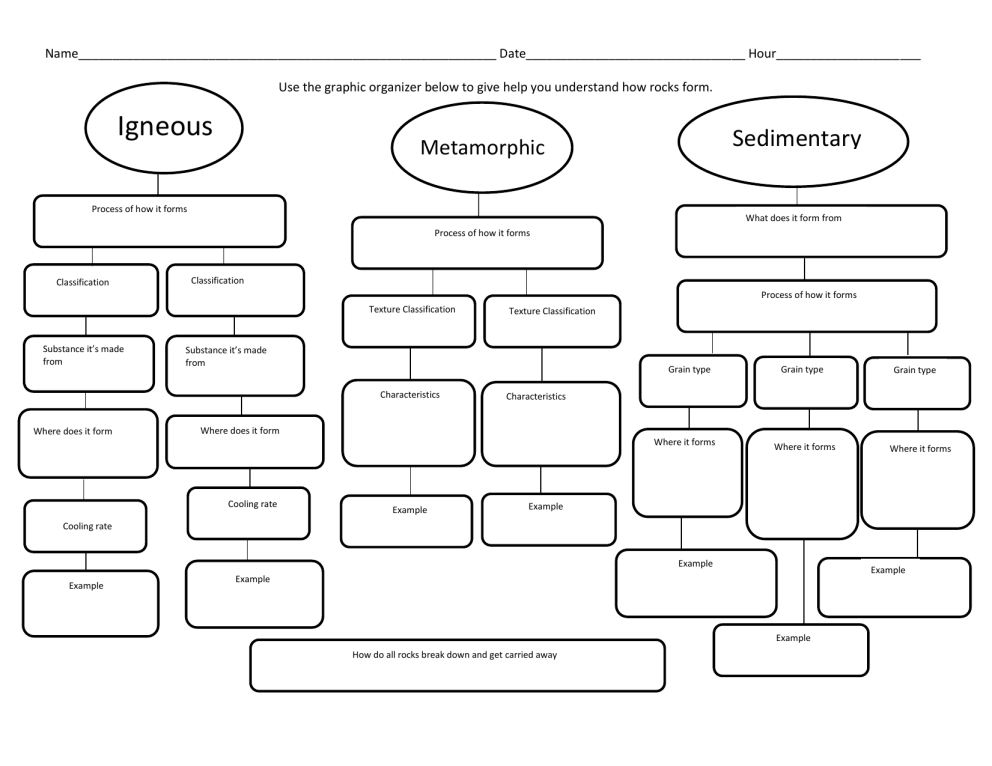 Name_____________________________________________________________ Date________________________________ Hour_____________________ Use the graphic organizer below to give help you understand how rocks form. Igneous Sedimentary Metamorphic Process of how it forms What does it form from Process of how it forms Classification Classification Process of how it forms Texture Classification Substance it’s made from Substance it’s made from Grain type Characteristics Where does it form Texture Classification Grain type Grain type Characteristics Where does it form Where it forms Cooling rate Example Where it forms Where it forms Example Cooling rate Example Example Example Example Example How do all rocks break down and get carried away