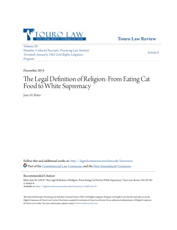 Touro Law Review Volume 20 Number 3 Selected Excerpts: Practicing Law Institute Twentieth Annual § 1983 Civil Rights Litigation Program Article 8 December 2014 The Legal Definition of Religion: From Eating Cat Food to White Supremacy Jane M. Ritter Follow this and additional works at: http://digitalcommons.tourolaw.edu/lawreview Part of the Constitutional Law Commons, and the First Amendment Commons Recommended Citation Ritter, Jane M. (2014) "The Legal Definition of Religion: From Eating Cat Food to White Supremacy," Touro Law Review: Vol. 20: No. 3, Article 8. Available at: http://digitalcommons.tourolaw.edu/lawreview/vol20/iss3/8 This Selected Excerpts: Practising Law Institute's Annual Section 1983 Civil Rights Litigation Program is brought to you for free and open access by Digital Commons @ Touro Law Center. It has been accepted for inclusion in Touro Law Review by an authorized administrator of Digital Commons @ Touro Law Center. For more information, please contact [email protected]. The Legal Definition of Religion: From Eating Cat Food to White Supremacy Cover Page Footnote 20-3 This selected excerpts: practising law institute's annual section 1983 civil rights litigation program is available in Touro Law Review: http://digitalcommons.tourolaw.edu/lawreview/vol20/iss3/8 Ritter: Legal Definition of Religion Published by Digital Commons @ Touro Law Center, 2004 HeinOnline -- 20 Touro L. Rev. 751 2004-2005 1 Touro Law Review, Vol. 20 [2004], No. 3, Art. 8 http://digitalcommons.tourolaw.edu/lawreview/vol20/iss3/8 HeinOnline -- 20 Touro L. Rev. 752 2004-2005 2 Ritter: Legal Definition of Religion Published by Digital Commons @ Touro Law Center, 2004 HeinOnline -- 20 Touro L. Rev. 753 2004-2005 3 Touro Law Review, Vol. 20 [2004], No. 3, Art. 8 http://digitalcommons.tourolaw.edu/lawreview/vol20/iss3/8 HeinOnline -- 20 Touro L. Rev. 754 2004-2005 4 Ritter: Legal Definition of Religion Published by Digital Commons @ Touro Law Center, 2004 HeinOnline -- 20 Touro L. Rev. 755 2004-2005 5 Touro Law Review, Vol. 20 [2004], No. 3, Art. 8 http://digitalcommons.tourolaw.edu/lawreview/vol20/iss3/8 HeinOnline -- 20 Touro L. Rev. 756 2004-2005 6 Ritter: Legal Definition of Religion Published by Digital Commons @ Touro Law Center, 2004 HeinOnline -- 20 Touro L. Rev. 757 2004-2005 7 Touro Law Review, Vol. 20 [2004], No. 3, Art. 8 http://digitalcommons.tourolaw.edu/lawreview/vol20/iss3/8 HeinOnline -- 20 Touro L. Rev. 758 2004-2005 8 Ritter: Legal Definition of Religion Published by Digital Commons @ Touro Law Center, 2004 HeinOnline -- 20 Touro L. Rev. 759 2004-2005 9 Touro Law Review, Vol. 20 [2004], No. 3, Art. 8 http://digitalcommons.tourolaw.edu/lawreview/vol20/iss3/8 HeinOnline -- 20 Touro L. Rev. 760 2004-2005 10 Ritter: Legal Definition of Religion Published by Digital Commons @ Touro Law Center, 2004 HeinOnline -- 20 Touro L. Rev. 761 2004-2005 11 Touro Law Review, Vol. 20 [2004], No. 3, Art. 8 http://digitalcommons.tourolaw.edu/lawreview/vol20/iss3/8 HeinOnline -- 20 Touro L. Rev. 762 2004-2005 12 Ritter: Legal Definition of Religion Published by Digital Commons @ Touro Law Center, 2004 HeinOnline -- 20 Touro L. Rev. 763 2004-2005 13 Touro Law Review, Vol. 20 [2004], No. 3, Art. 8 http://digitalcommons.tourolaw.edu/lawreview/vol20/iss3/8 HeinOnline -- 20 Touro L. Rev. 764 2004-2005 14 Ritter: Legal Definition of Religion Published by Digital Commons @ Touro Law Center, 2004 HeinOnline -- 20 Touro L. Rev. 765 2004-2005 15 Touro Law Review, Vol. 20 [2004], No. 3, Art. 8 http://digitalcommons.tourolaw.edu/lawreview/vol20/iss3/8 HeinOnline -- 20 Touro L. Rev. 766 2004-2005 16 Ritter: Legal Definition of Religion Published by Digital Commons @ Touro Law Center, 2004 HeinOnline -- 20 Touro L. Rev. 767 2004-2005 17 Touro Law Review, Vol. 20 [2004], No. 3, Art. 8 http://digitalcommons.tourolaw.edu/lawreview/vol20/iss3/8 HeinOnline -- 20 Touro L. Rev. 768 2004-2005 18 Ritter: Legal Definition of Religion Published by Digital Commons @ Touro Law Center, 2004 HeinOnline -- 20 Touro L. Rev. 769 2004-2005 19 Touro Law Review, Vol. 20 [2004], No. 3, Art. 8 http://digitalcommons.tourolaw.edu/lawreview/vol20/iss3/8 HeinOnline -- 20 Touro L. Rev. 770 2004-2005 20 Ritter: Legal Definition of Religion Published by Digital Commons @ Touro Law Center, 2004 HeinOnline -- 20 Touro L. Rev. 771 2004-2005 21 Touro Law Review, Vol. 20 [2004], No. 3, Art. 8 http://digitalcommons.tourolaw.edu/lawreview/vol20/iss3/8 HeinOnline -- 20 Touro L. Rev. 772 2004-2005 22 Ritter: Legal Definition of Religion Published by Digital Commons @ Touro Law Center, 2004 HeinOnline -- 20 Touro L. Rev. 773 2004-2005 23 Touro Law Review, Vol. 20 [2004], No. 3, Art. 8 http://digitalcommons.tourolaw.edu/lawreview/vol20/iss3/8 HeinOnline -- 20 Touro L. Rev. 774 2004-2005 24 Ritter: Legal Definition of Religion Published by Digital Commons @ Touro Law Center, 2004 HeinOnline -- 20 Touro L. Rev. 775 2004-2005 25 Touro Law Review, Vol. 20 [2004], No. 3, Art. 8 http://digitalcommons.tourolaw.edu/lawreview/vol20/iss3/8 HeinOnline -- 20 Touro L. Rev. 776 2004-2005 26 Ritter: Legal Definition of Religion Published by Digital Commons @ Touro Law Center, 2004 HeinOnline -- 20 Touro L. Rev. 777 2004-2005 27 Touro Law Review, Vol. 20 [2004], No. 3, Art. 8 http://digitalcommons.tourolaw.edu/lawreview/vol20/iss3/8 HeinOnline -- 20 Touro L. Rev. 778 2004-2005 28 Ritter: Legal Definition of Religion Published by Digital Commons @ Touro Law Center, 2004 HeinOnline -- 20 Touro L. Rev. 779 2004-2005 29 Touro Law Review, Vol. 20 [2004], No. 3, Art. 8 http://digitalcommons.tourolaw.edu/lawreview/vol20/iss3/8 HeinOnline -- 20 Touro L. Rev. 780 2004-2005 30 Ritter: Legal Definition of Religion Published by Digital Commons @ Touro Law Center, 2004 HeinOnline -- 20 Touro L. Rev. 781 2004-2005 31 Touro Law Review, Vol. 20 [2004], No. 3, Art. 8 http://digitalcommons.tourolaw.edu/lawreview/vol20/iss3/8 HeinOnline -- 20 Touro L. Rev. 782 2004-2005 32 Ritter: Legal Defin